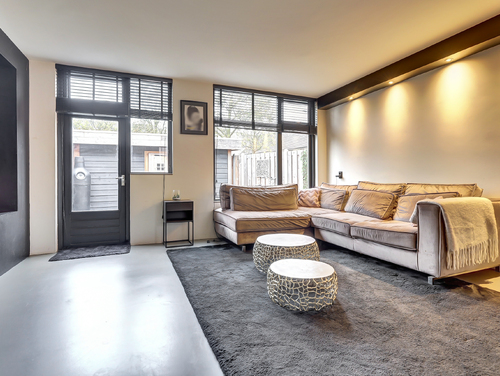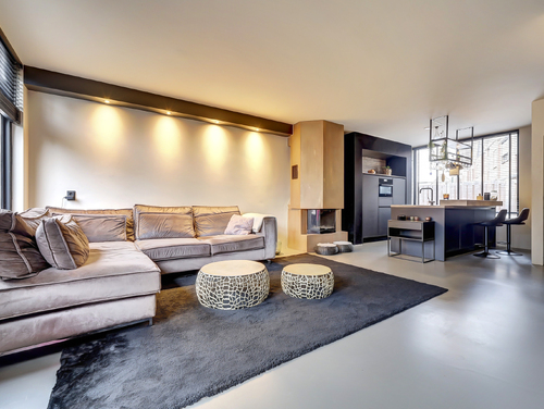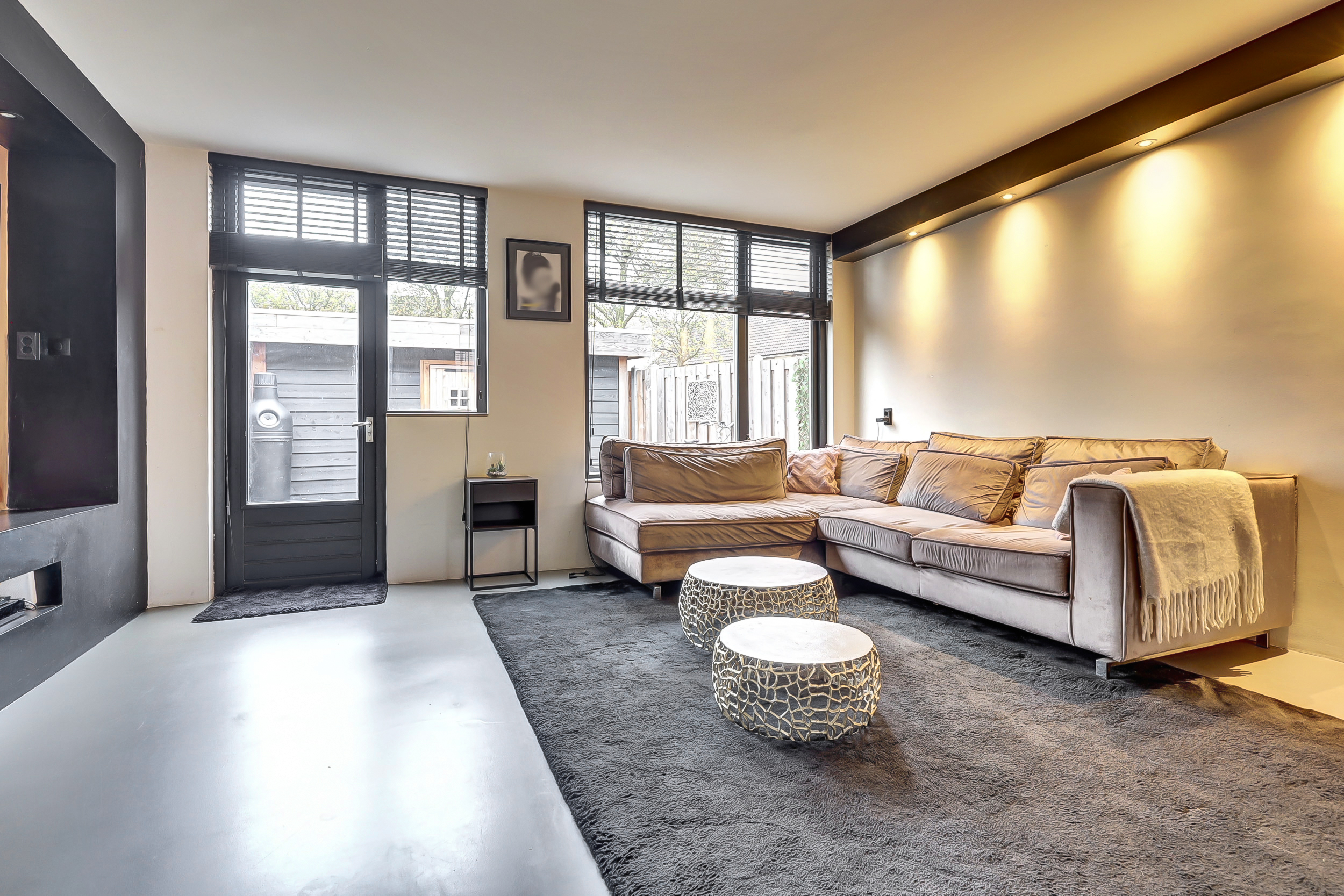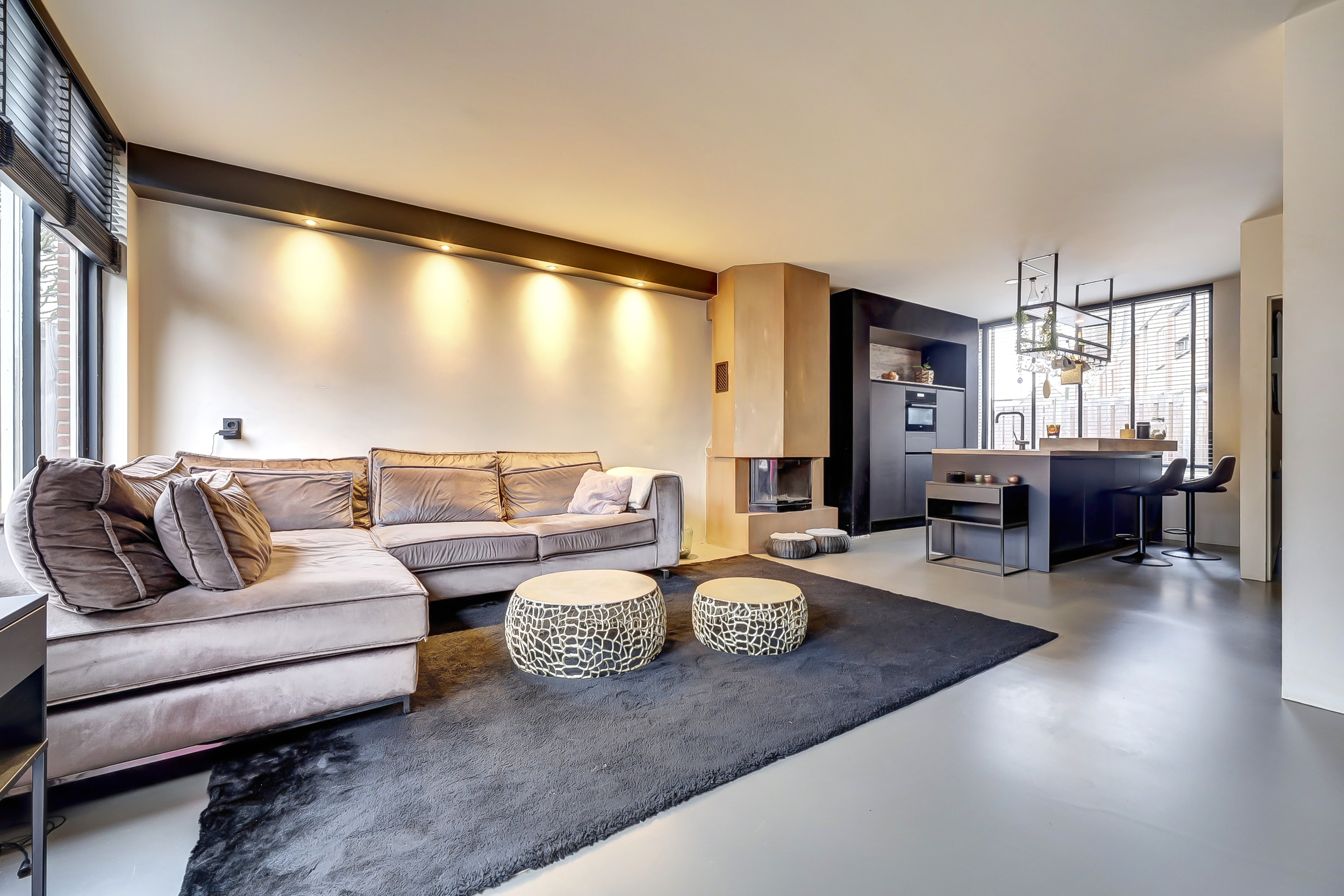 De lichte woonkamer (ca. 26 m²) is voorzien van een gietvloer met vloerverwarming (hoofdverwarming), gesausde wandafwerking, sfeervolle open haard, een cinewall en een deur die toegang geeft tot de aangrenzende tuin.
