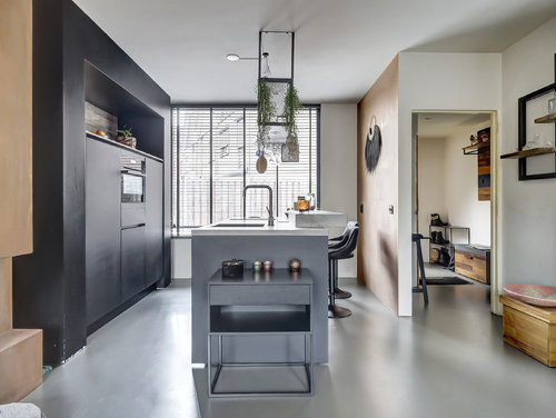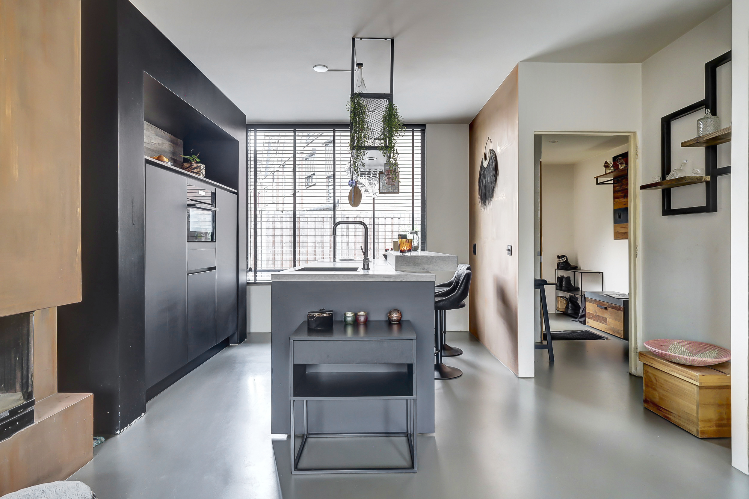 De in 2020 geplaatste open keuken (ca. 10 m²) is uitgerust met een kookeiland en diverse opbergmogelijkheden en apparatuur. Zo tref je hier een inductiekookplaat met geïntegreerde afzuiging, koelkast, combimagnetron, heetwaterkraan, vaatwasser en een gezellige eetbar. De vloer en wandafwerking van de woonkamer lopen naadloos over in de keuken en vormen een bijpassend geheel.