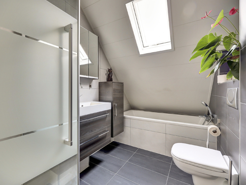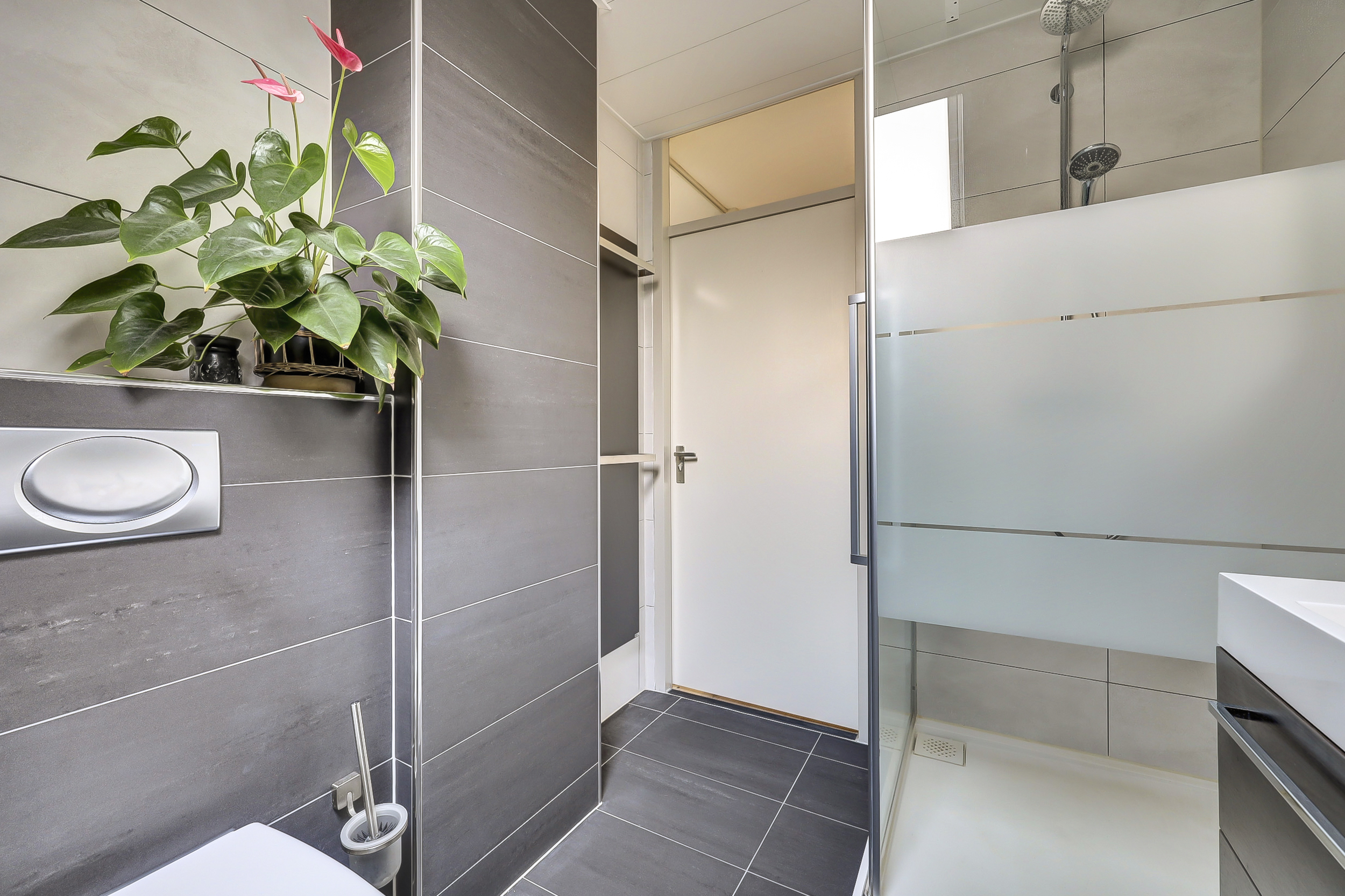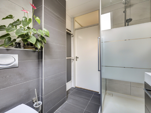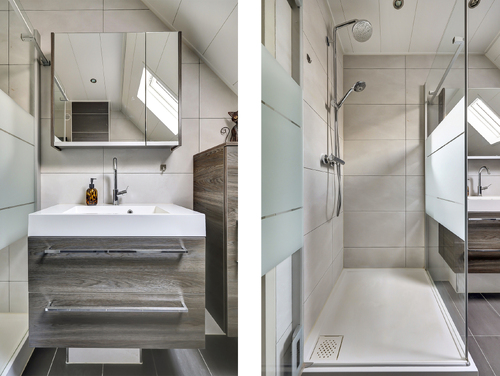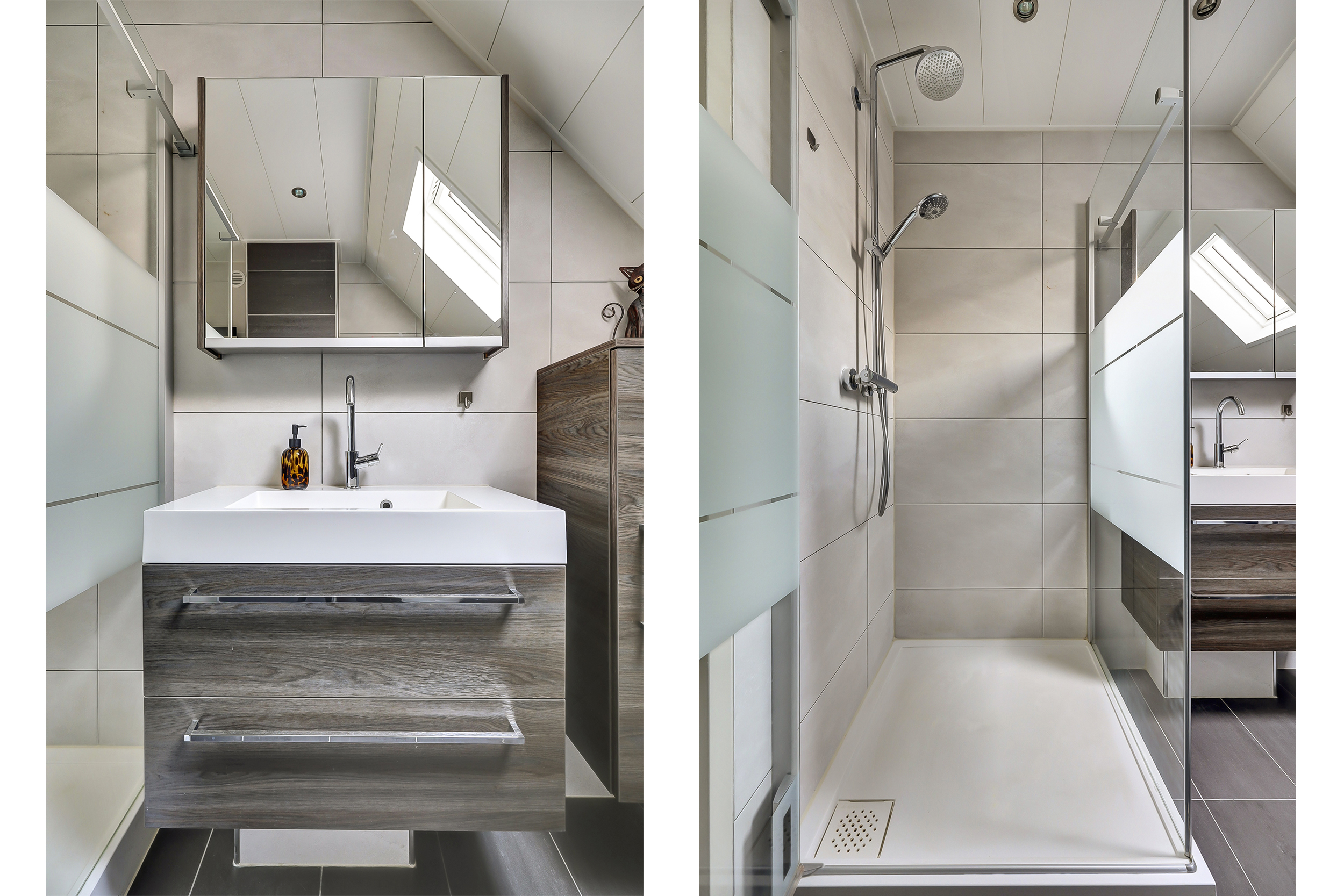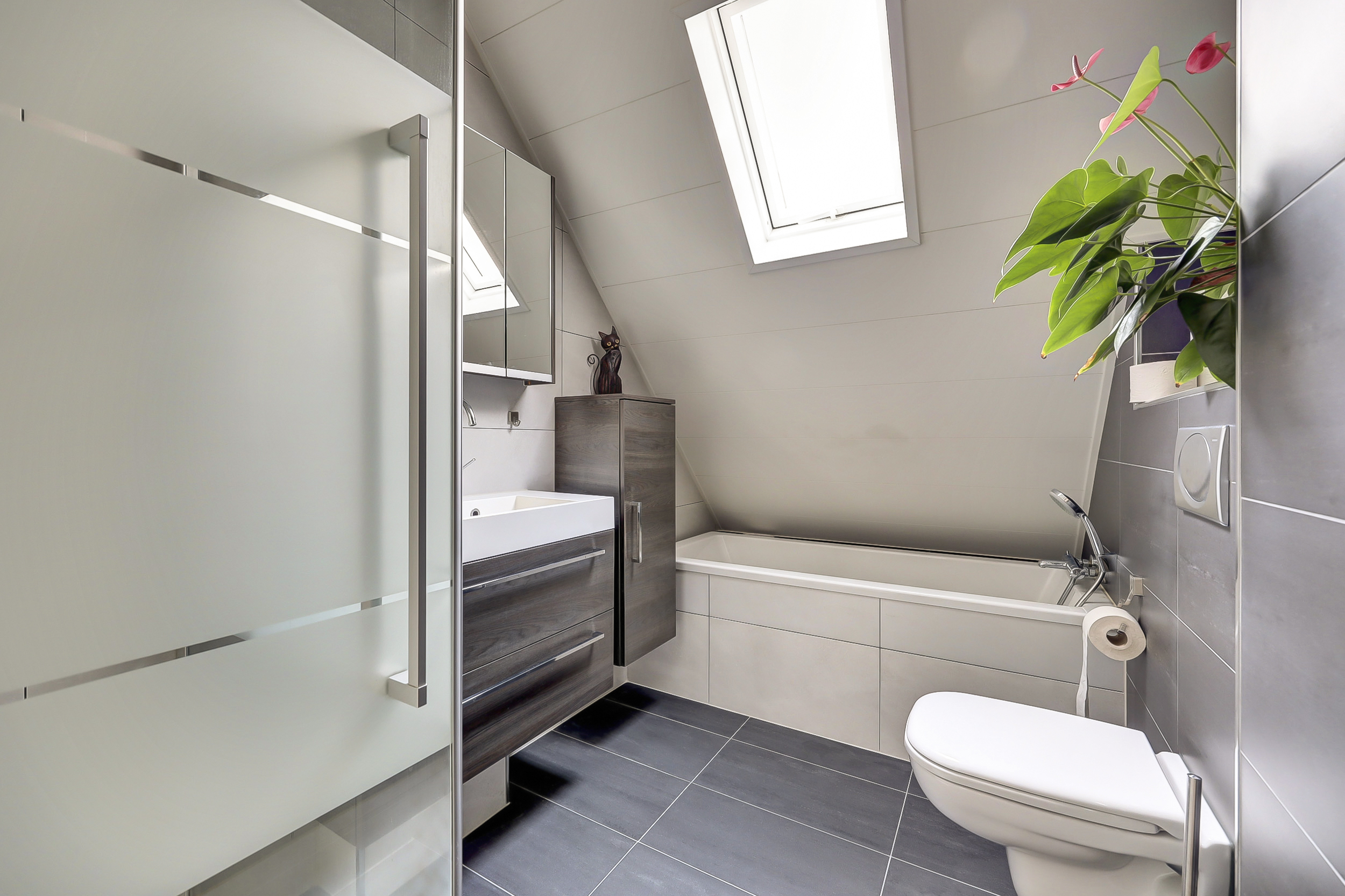 De geheel betegelde badkamer (ca. 6 m²) is uitgerust met een douchecabine met regendouche, wastafel met meubel, 2e toilet met zwevend closet, design radiator, ligbad, mechanische ventilatie, dakraam en ingebouwde verlichting.