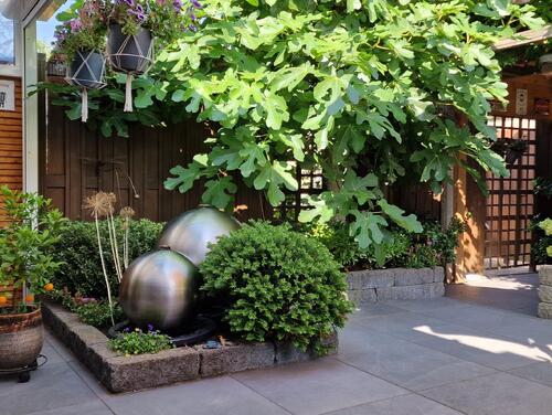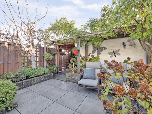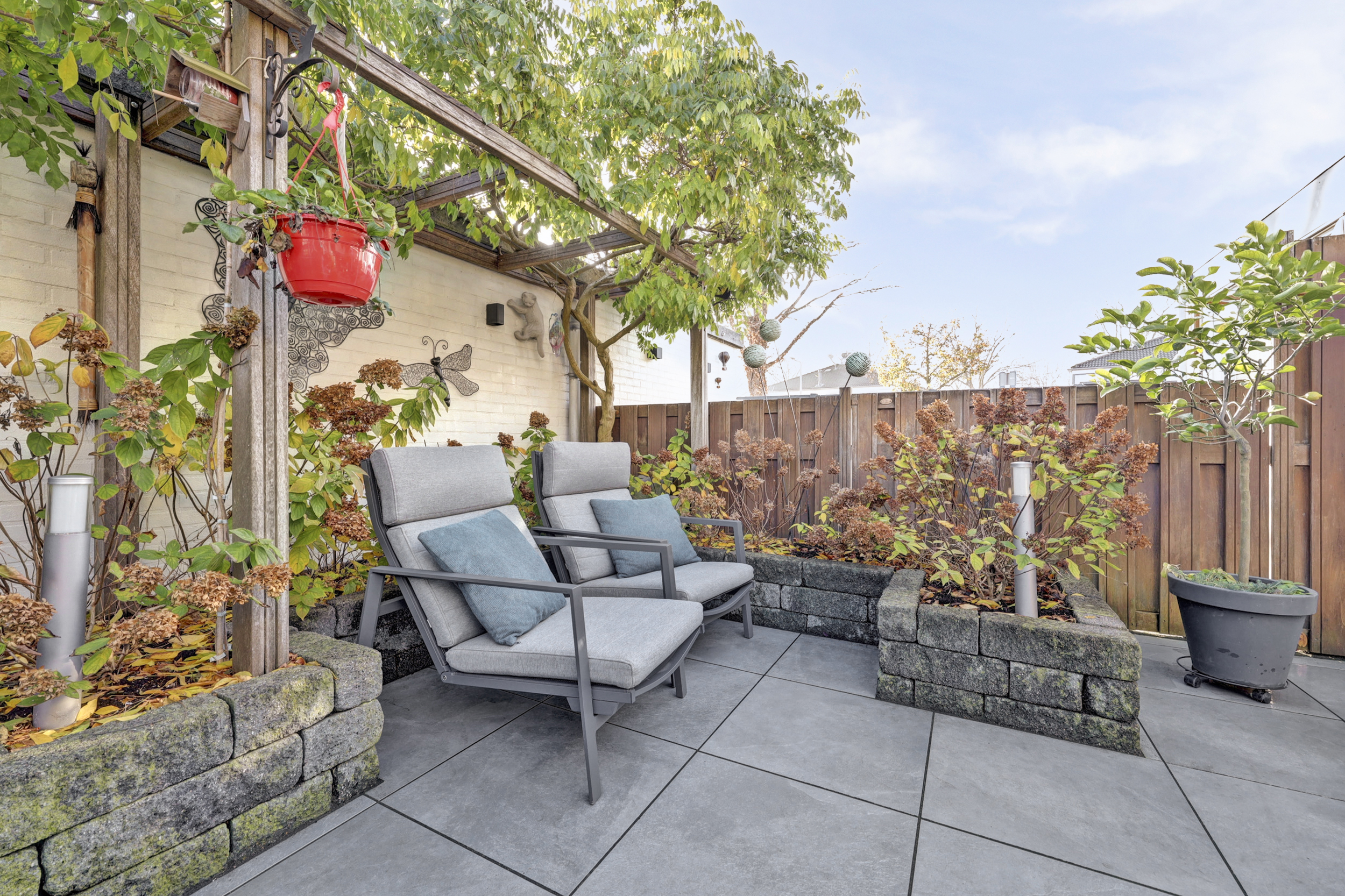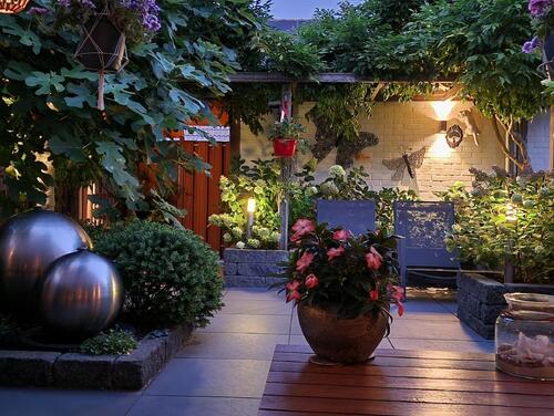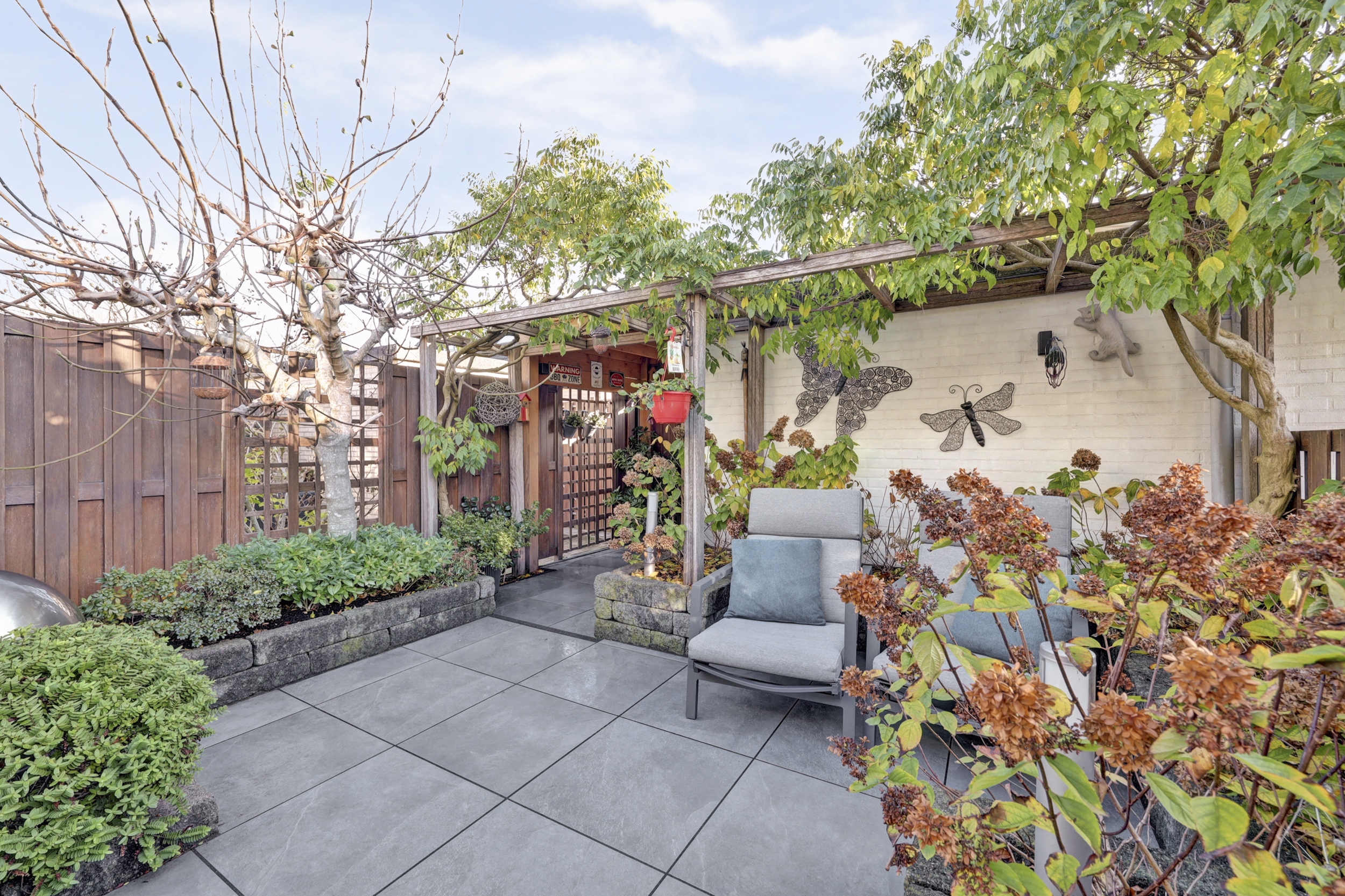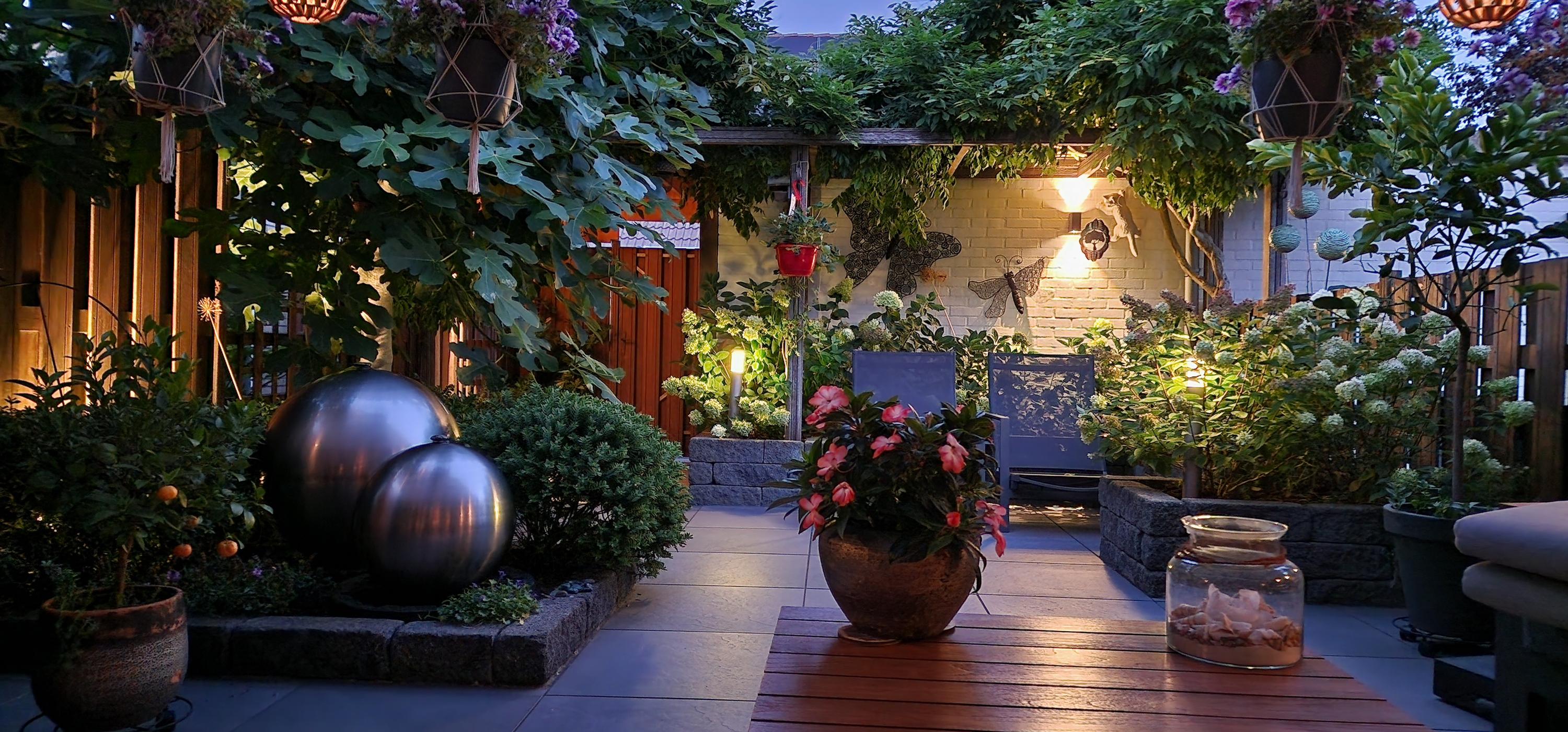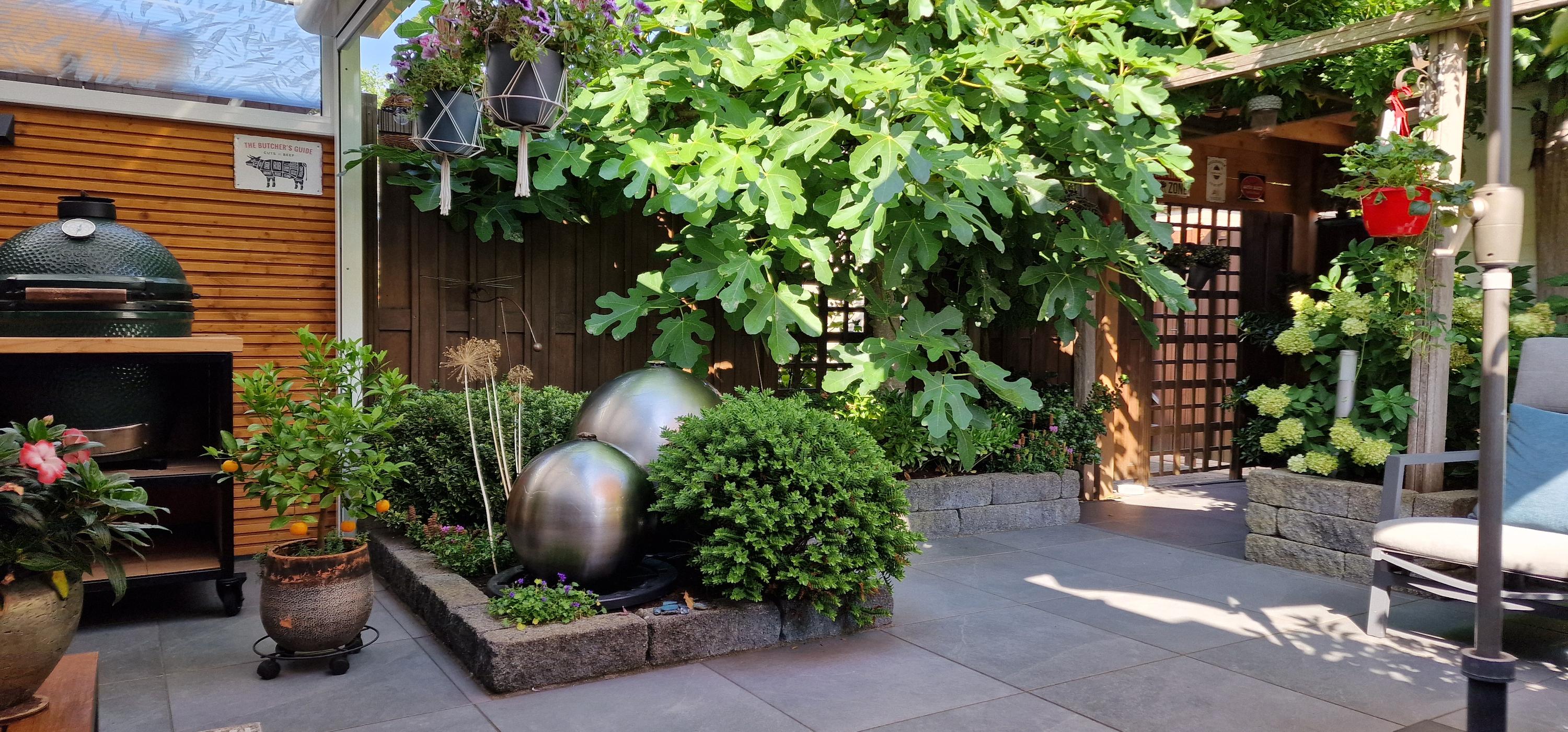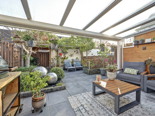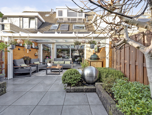 De keurig verzorgde tuin (Z/O) is werkelijk een plaatje. Hier tref je een mooie mix van bloemen, planten, waterelementen en betegeling en biedt voldoende privacy. De tuin beschikt over een kleine overkapping en een vrijstaande stenen berging met elektra. Aan de voorzijde van de woning is er de mogelijkheid om in de aangebouwde houten berging twee motoren of scooters te stallen waar je door middel van een elektrische roldeur zo naar binnen kan rijden. Tevens is deze berging voorzien van een alarmsysteem.