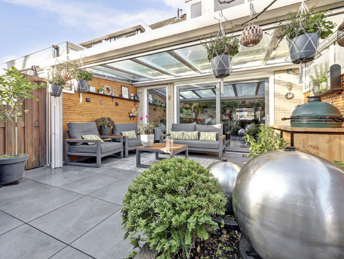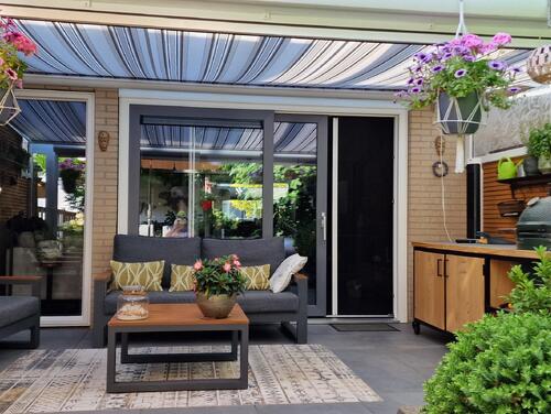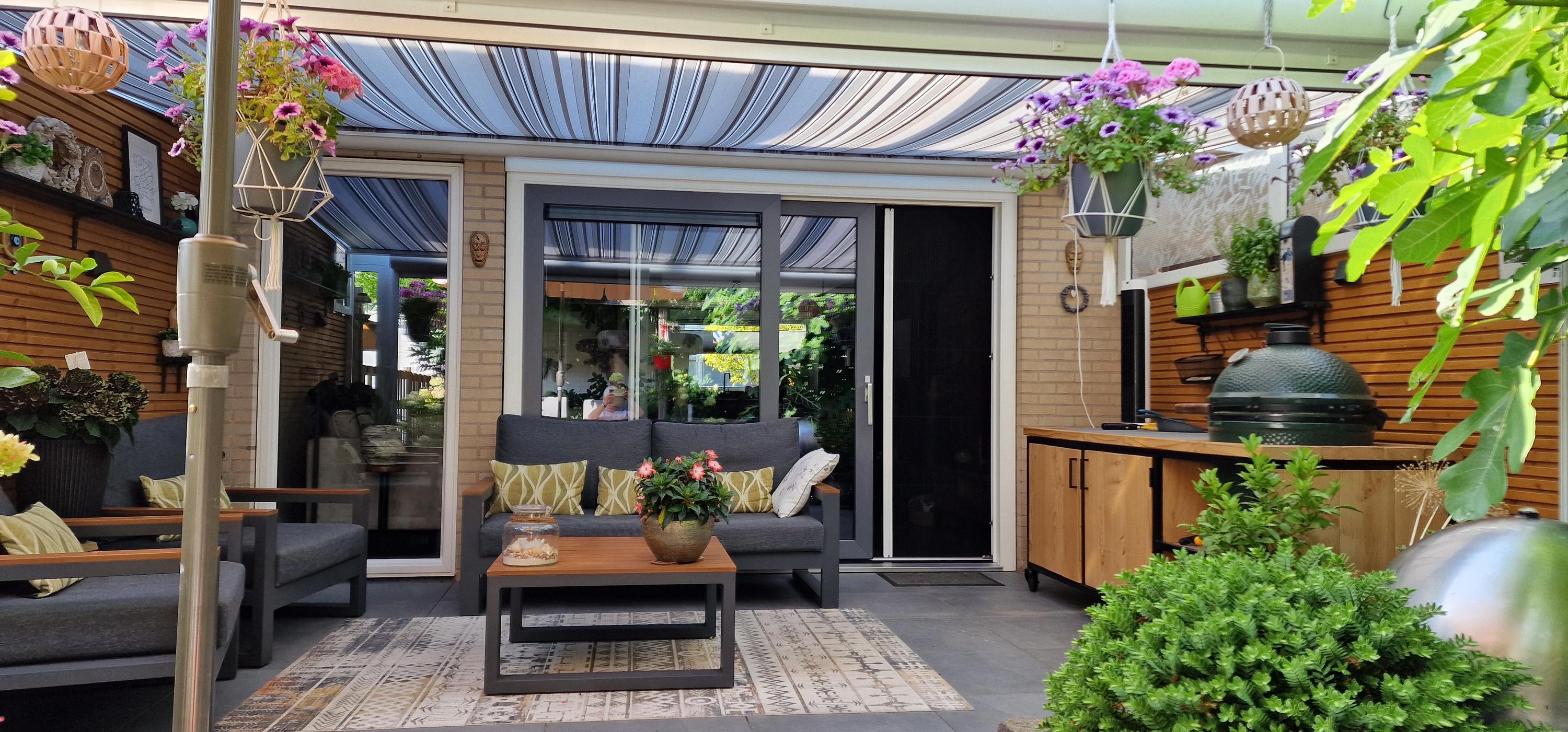 De aangebouwde veranda/serre (ca. 14 m²) waar het heerlijk vertoeven is, is geplaatst in 2012 en uitgerust met zonwering, een elektrische screen over de gehele breedte, elektra, betegeling en een buitenkraan. Hier kan je tot in de late uurtjes heerlijk genieten van een smakelijke barbecue.