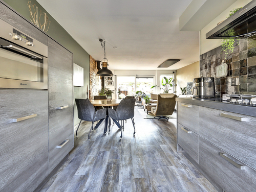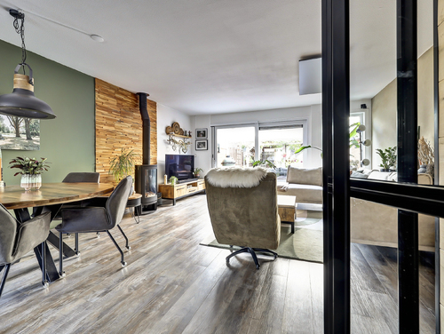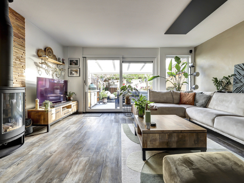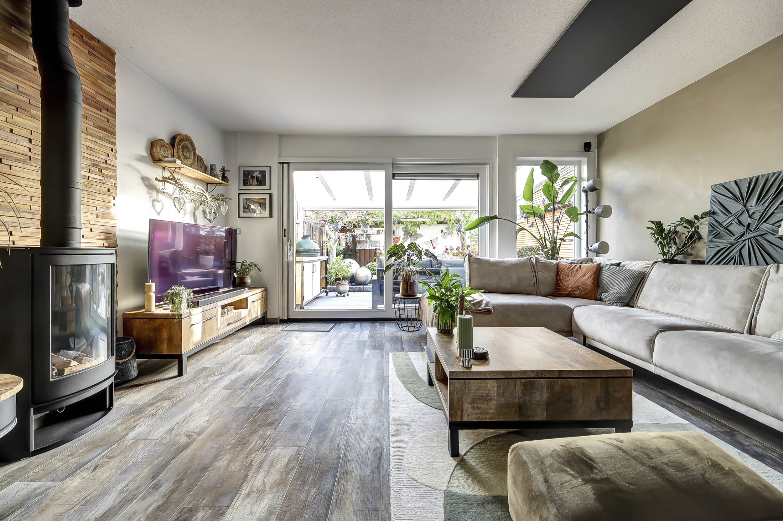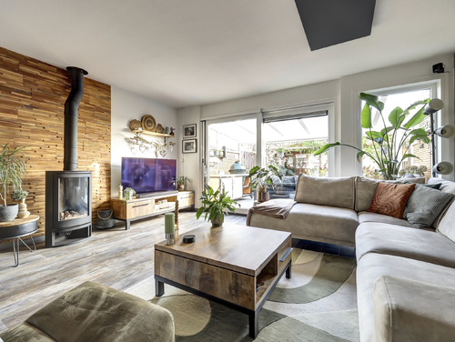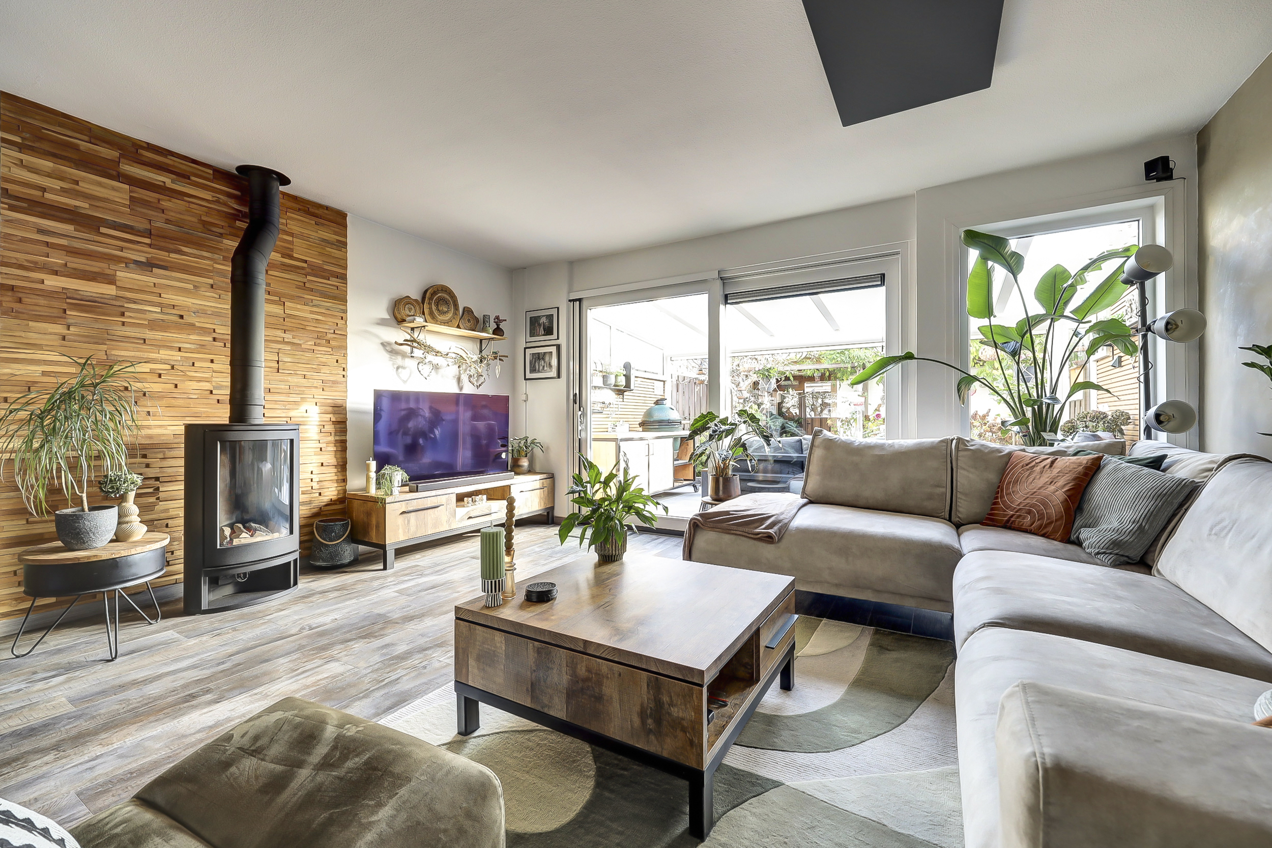 De sfeervolle woonkamer (ca. 30 m²) is voorzien van een pvc laminaatvloer, een gashaard, een handige voorraadkast, infraroodverwarming en een brede schuifpui die toegang geeft tot de aangrenzende veranda/serre. Aan de voorzijde van de woonkamer bevindt zich de luxe compleet ingerichte open keuken.