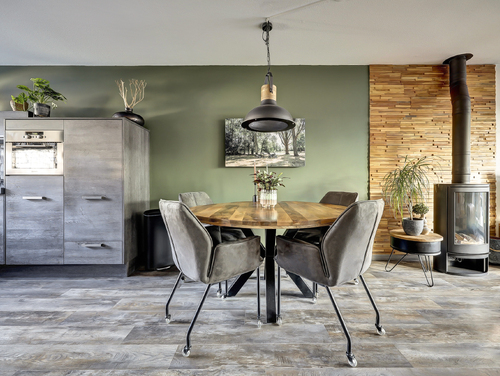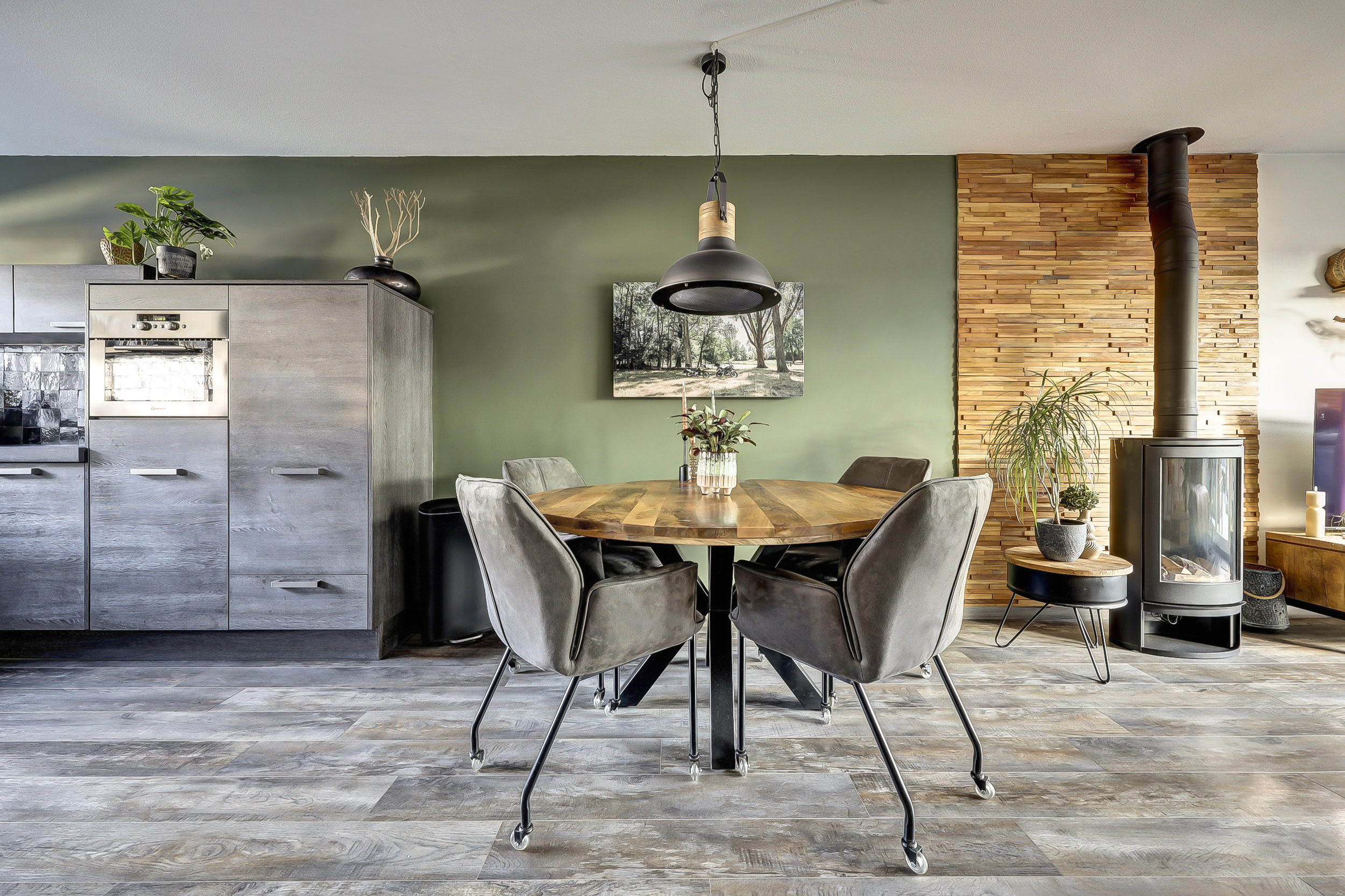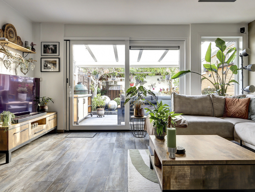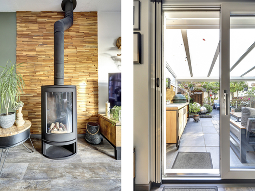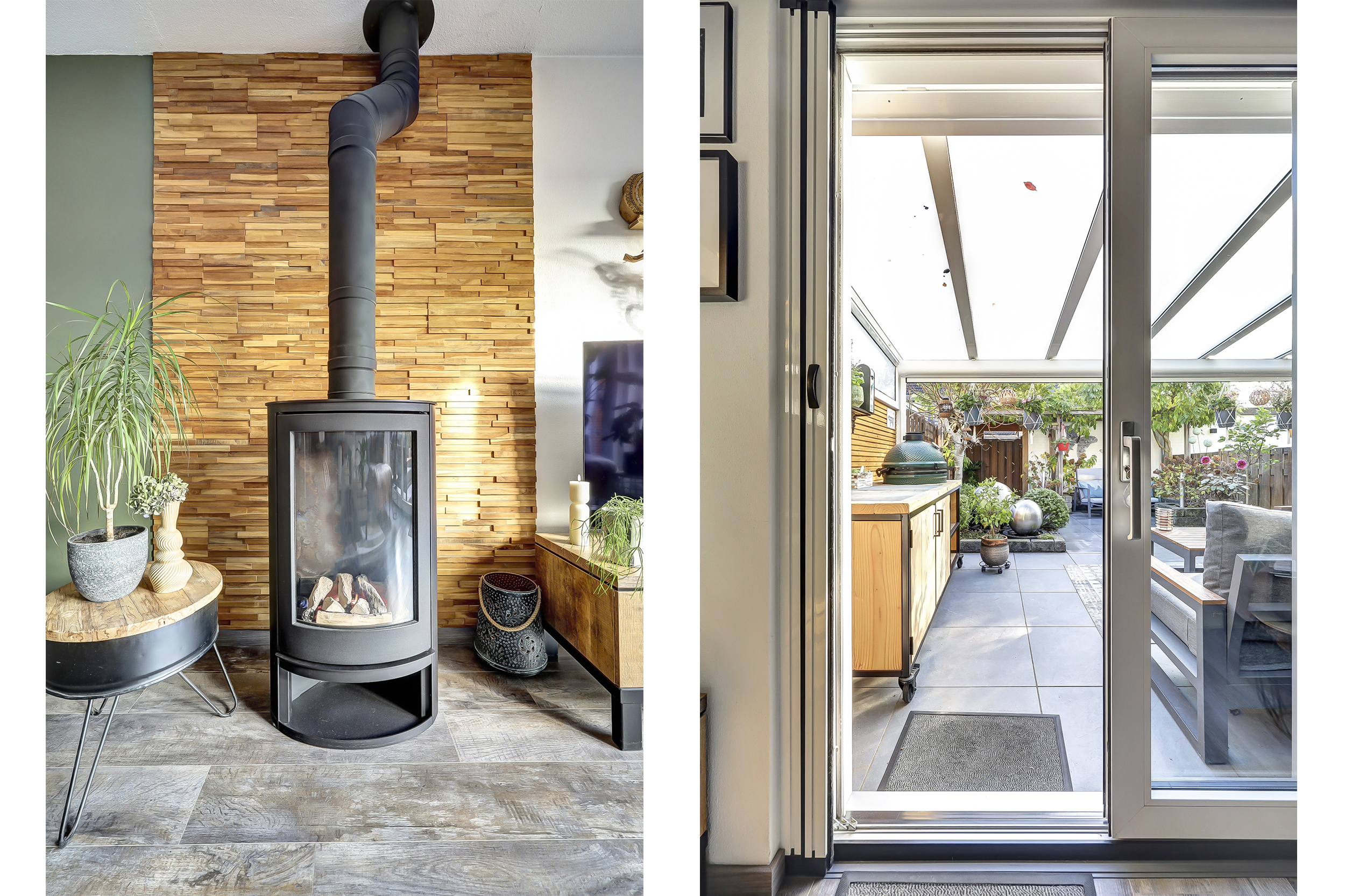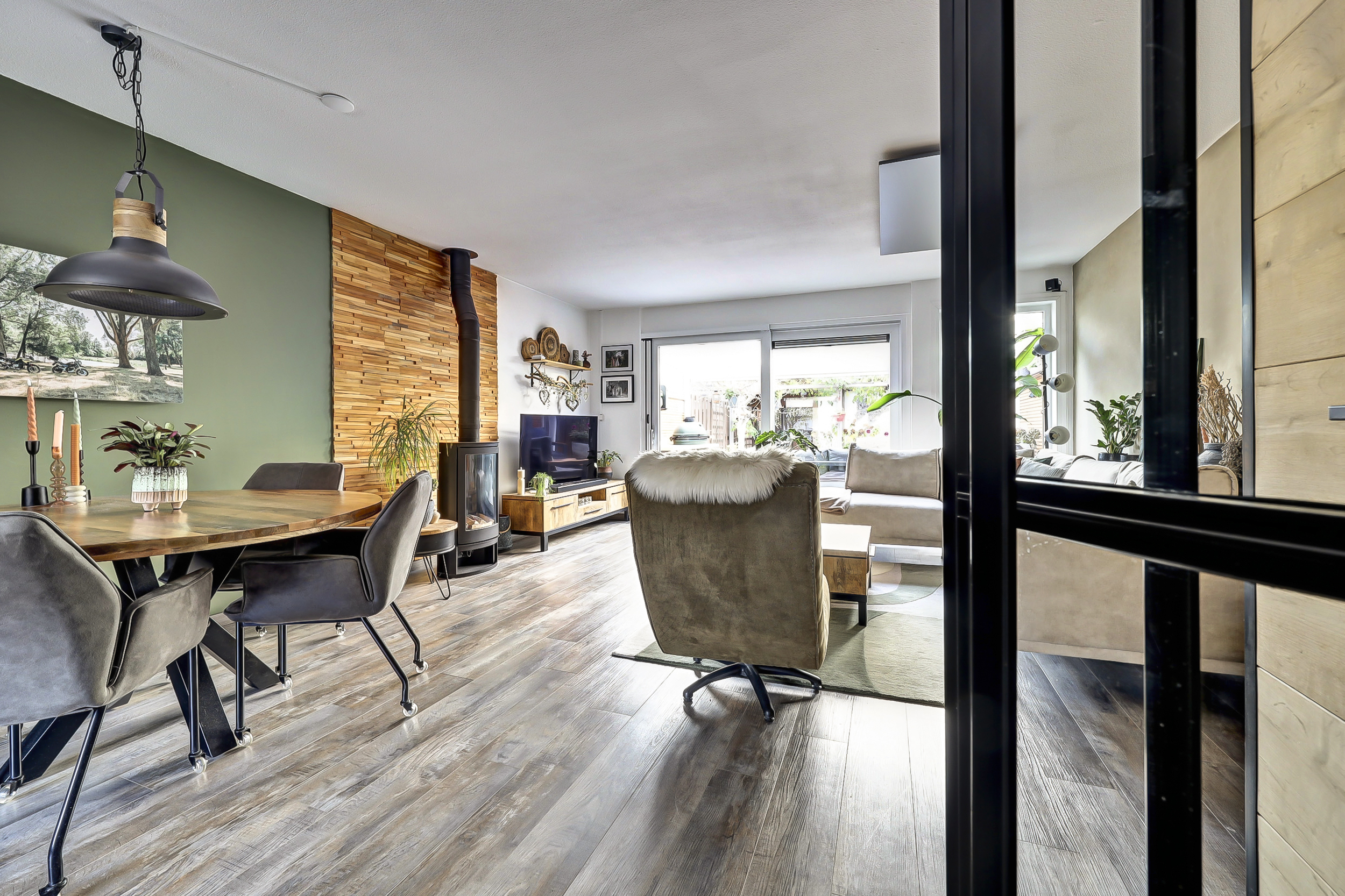 De sfeervolle woonkamer (ca. 30 m²) is voorzien van een pvc laminaatvloer, een gashaard, een handige voorraadkast, infraroodverwarming en een brede schuifpui die toegang geeft tot de aangrenzende veranda/serre. Aan de voorzijde van de woonkamer bevindt zich de luxe compleet ingerichte open keuken.