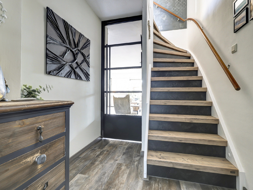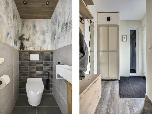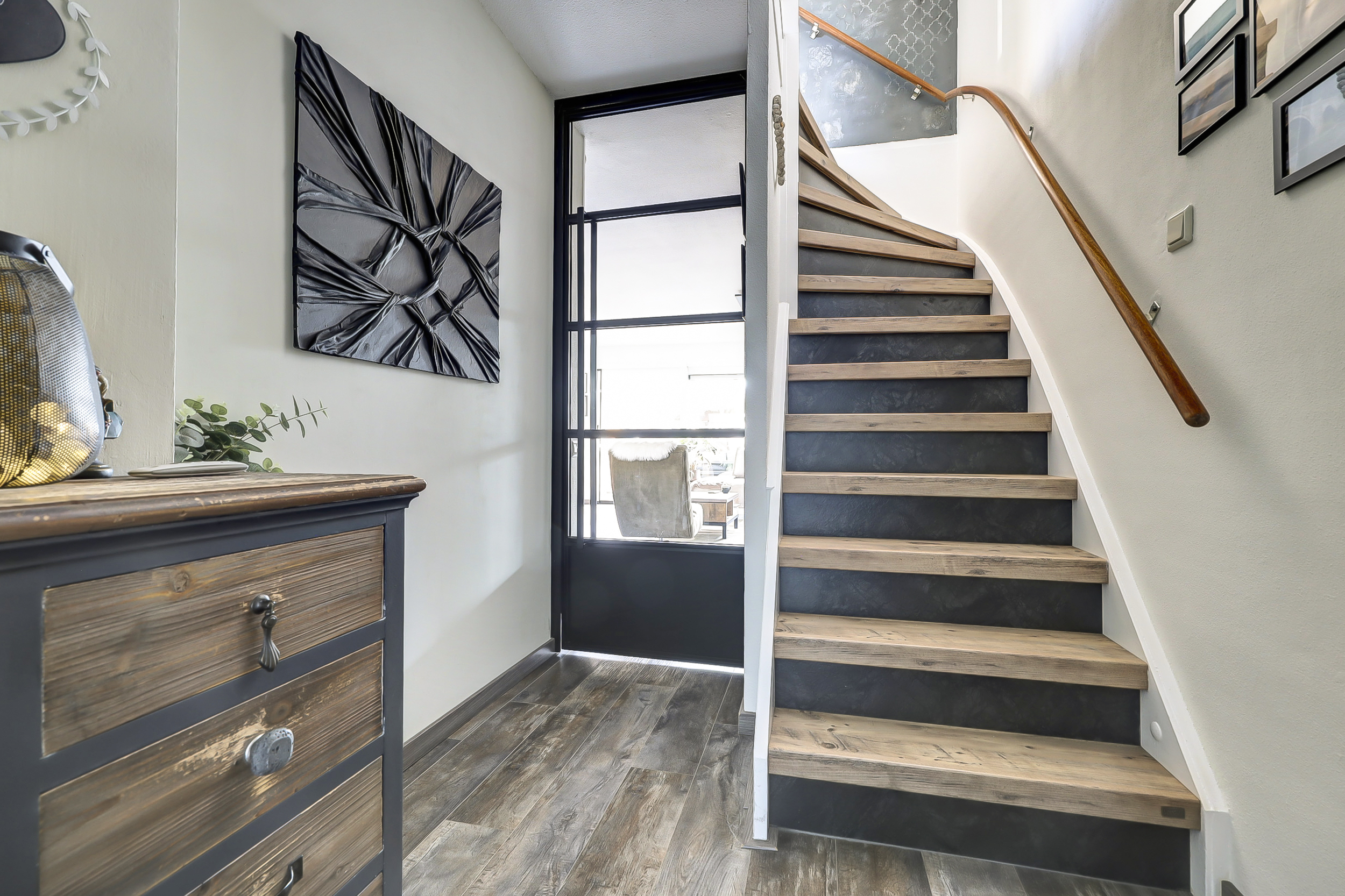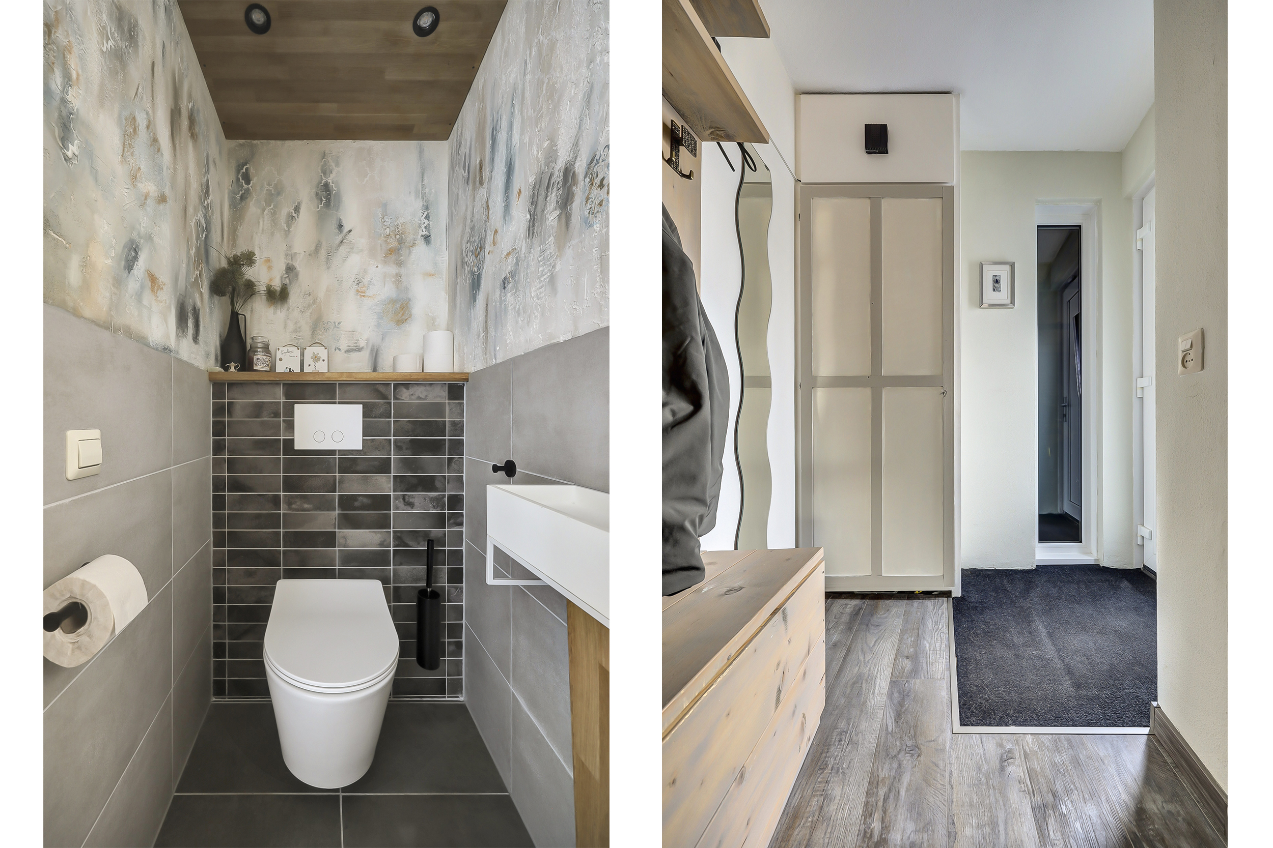 Hal/entree met meterkast (8 groepen/slimme meters/glasvezel), garderoberuimte, trapopgang, toilet met zwevend closet, fonteintje en ingebouwde verlichting (2022) en middels een moderne zwartstalen tussendeur heb je toegang tot de gezellige tuingerichte woonkamer.