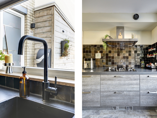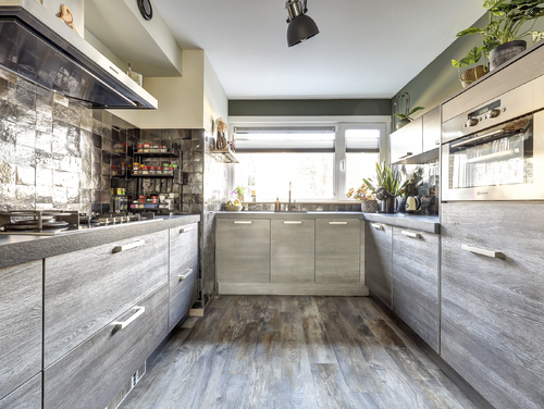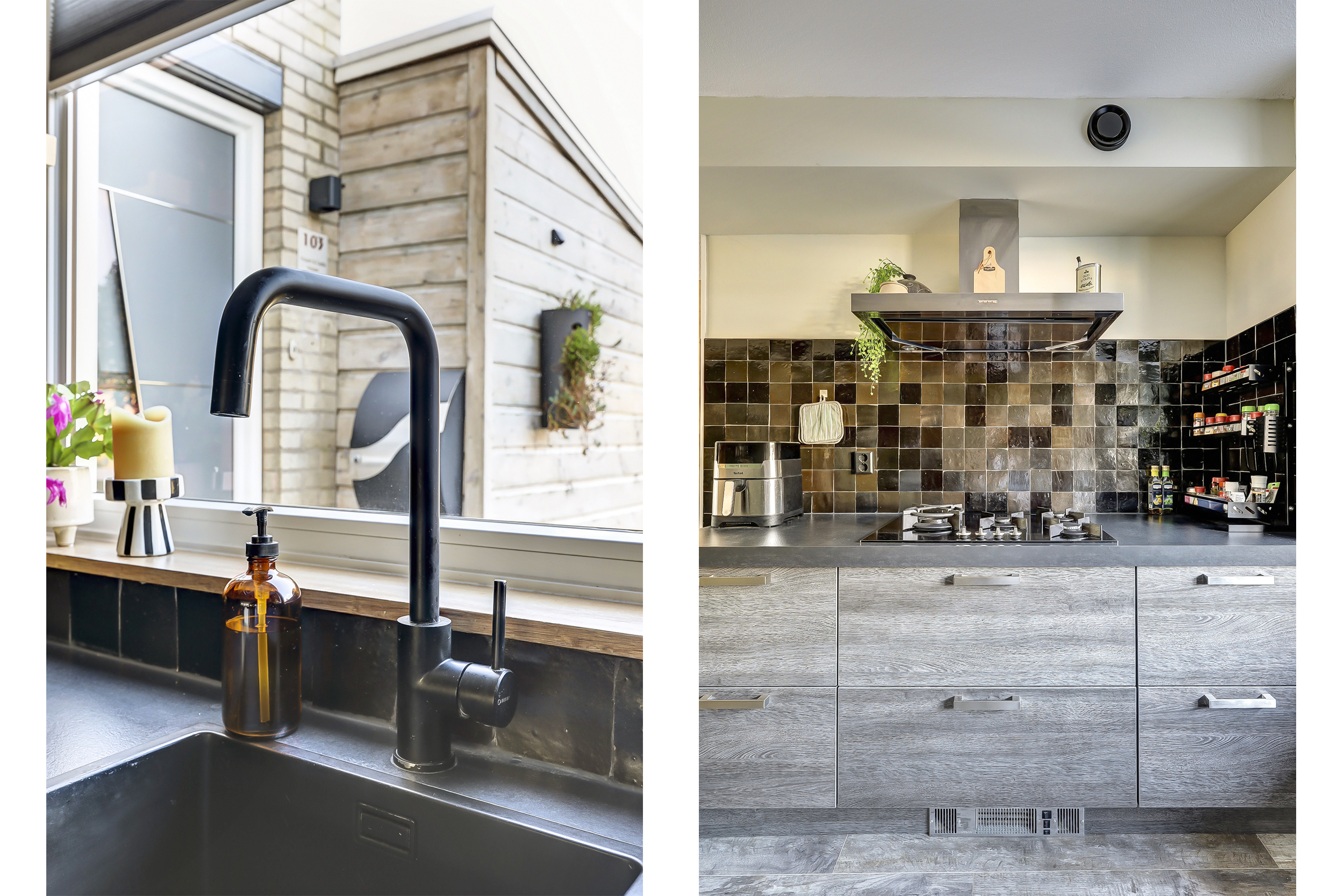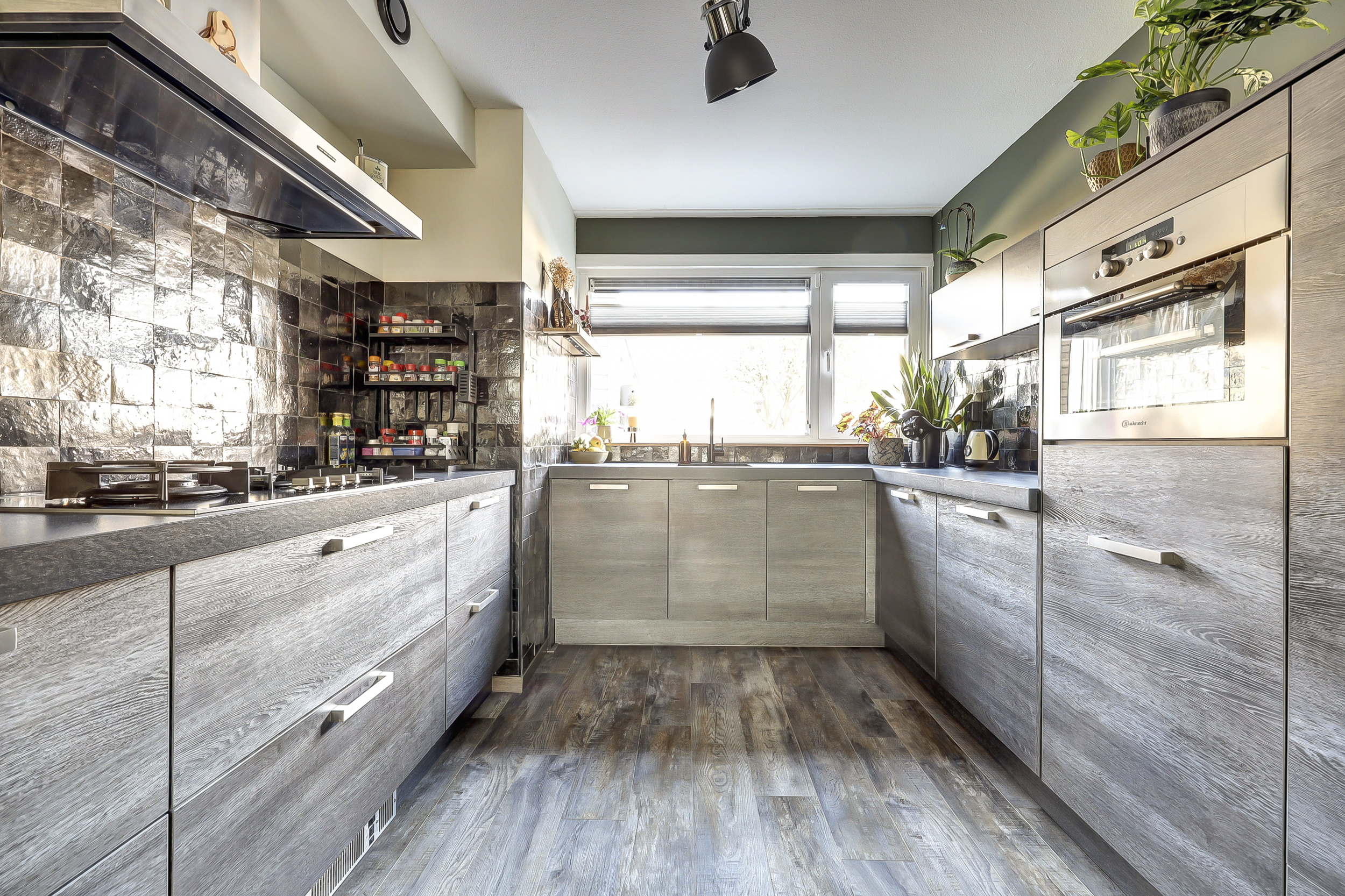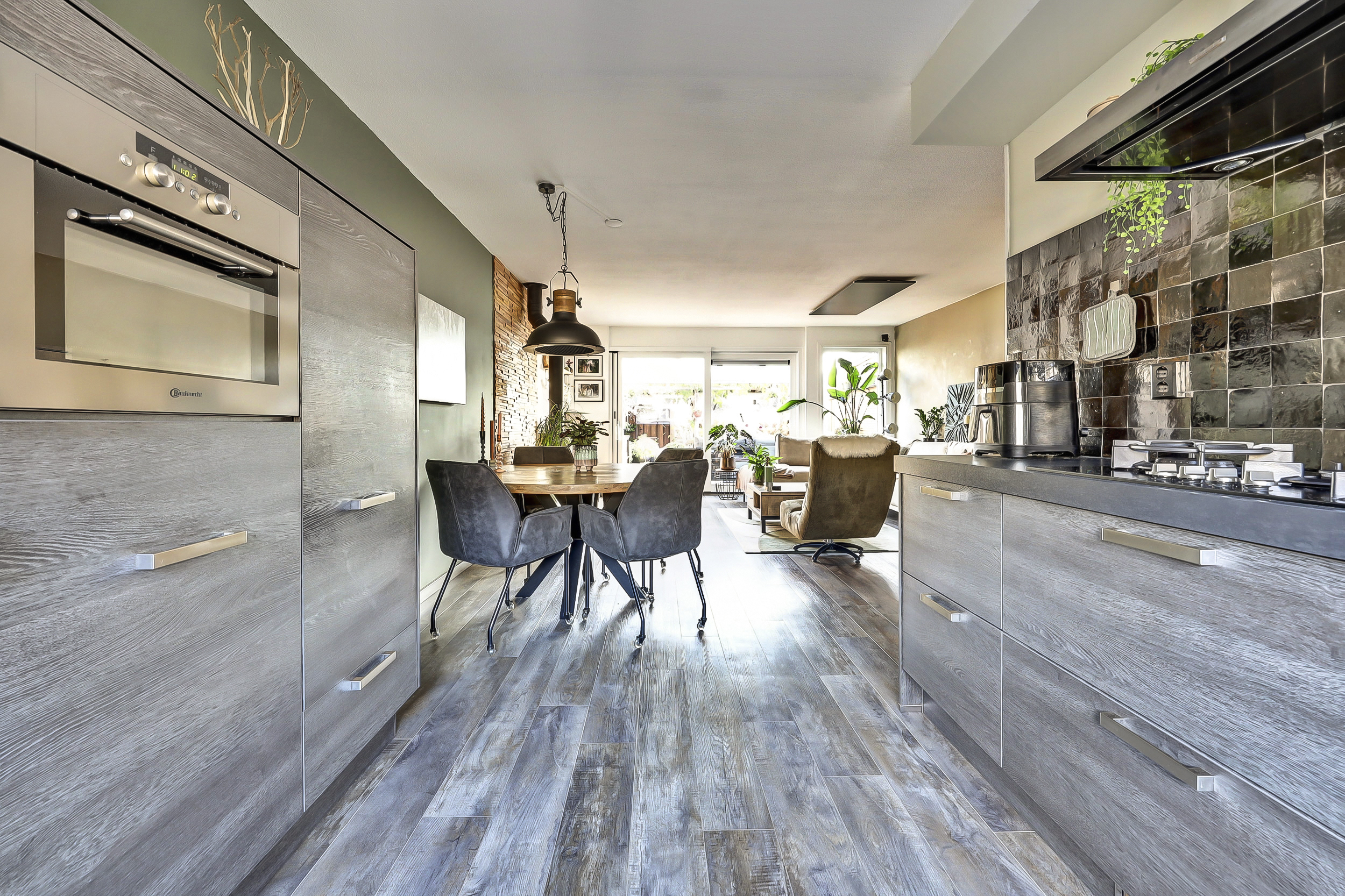 De open keuken (ca. 9 m²) is uitgerust met een U-vormige inrichting, een pvc laminaatvloer en diverse ingebouwde apparatuur zoals een koelkast, vriezer, vaatwasser, 4-pitsgaskookplaat, rvs afzuigschouw, combimagnetron en een composiet bovenblad afgewerkt met handgemaakte Marokkaanse wandtegeltjes.