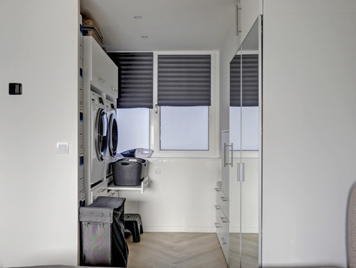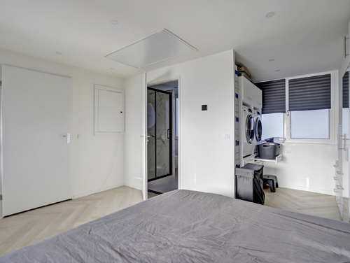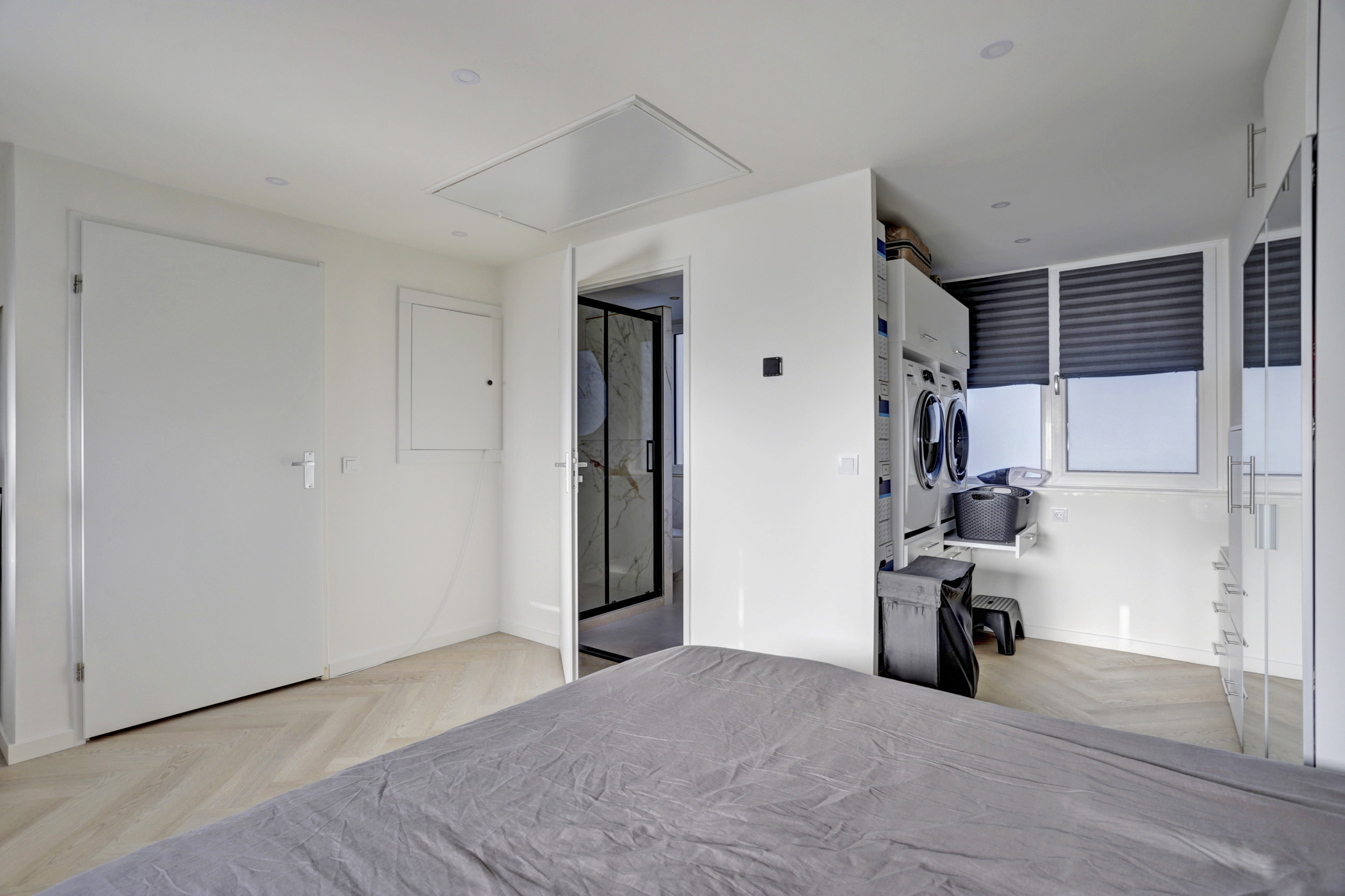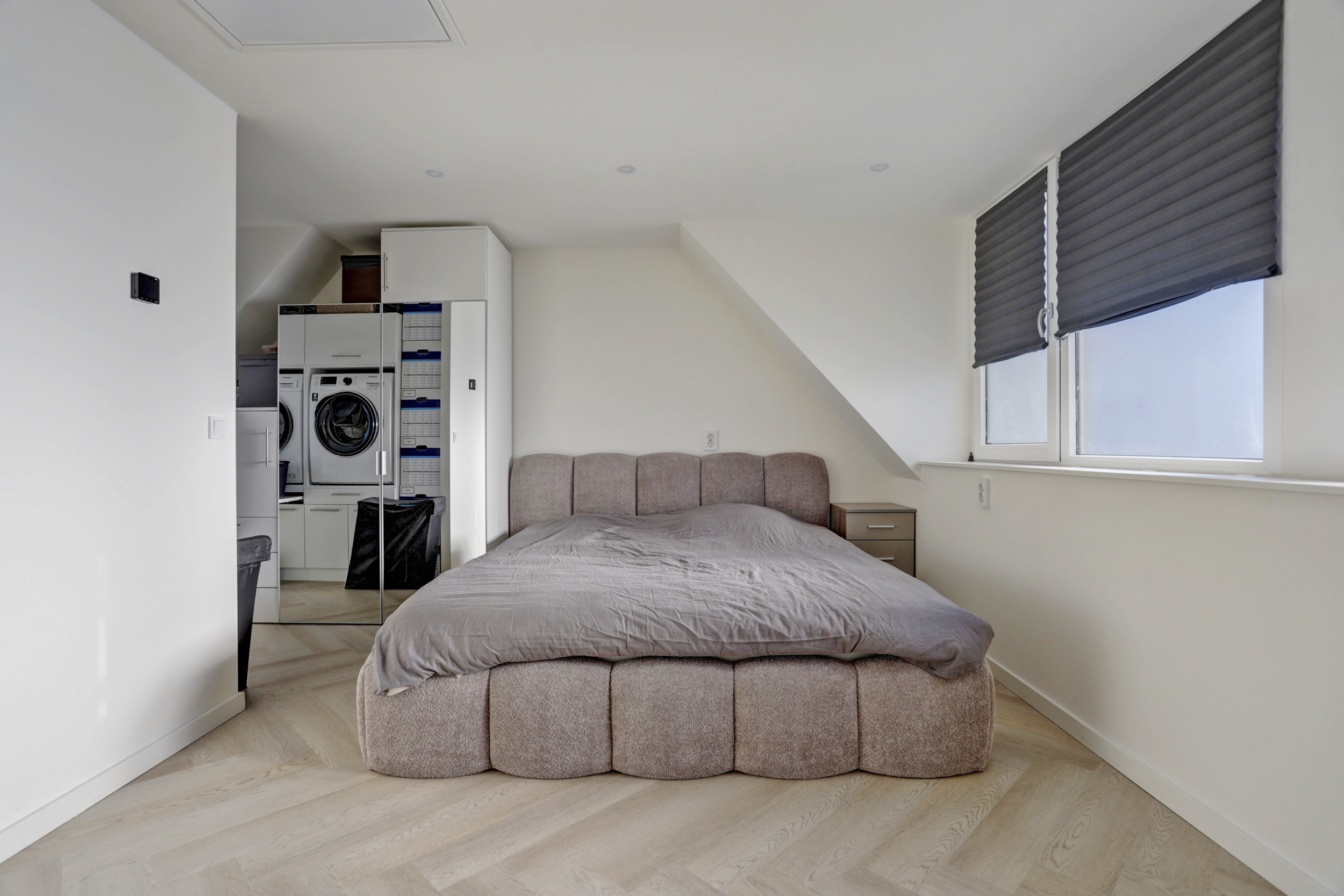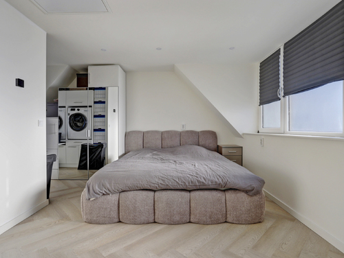 Hier bevindt zich de royale ouderslaapkamer (ca. 15 m²) met een dubbele kunststof dakkapel, ingebouwde verlichting, pvc visgraadvloer, vloerverwarming, aparte wasruimte met de opstelling van de wasmachine en droger beiden ingebouwd in een praktische waskast.