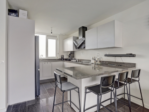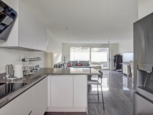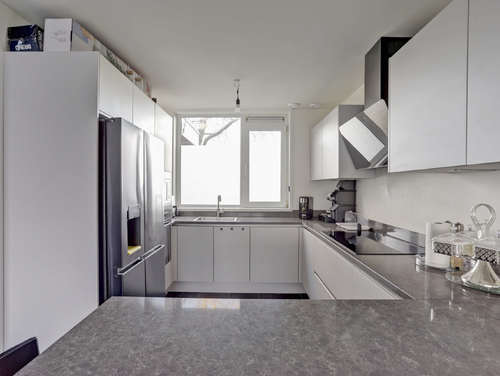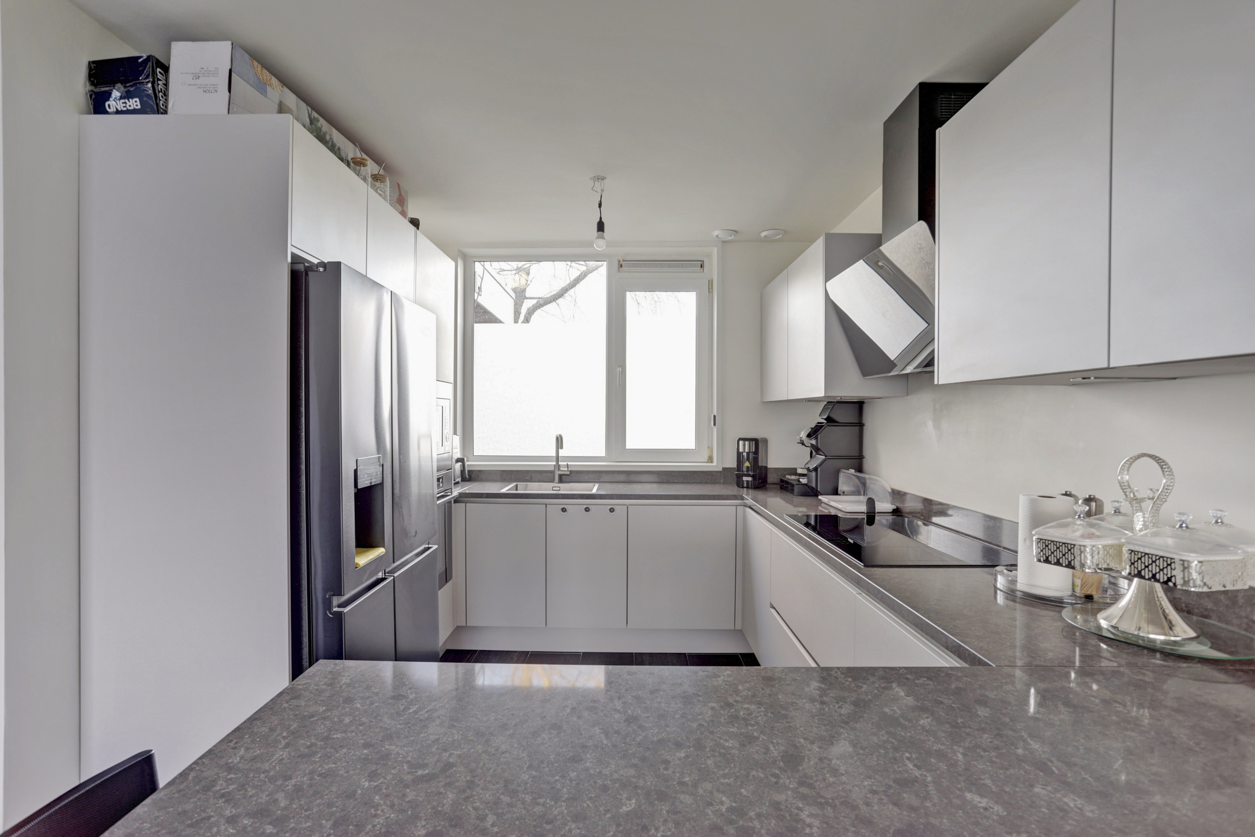 De luxe open keuken (ca. 10 m²) met composiet bovenblad, is U-vormig opgesteld en beschikt over diverse (ETNA) inbouwapparatuur zoals een inductie kookplaat, moderne afzuigschouw, combimagnetron, oven, vaatwasser en een "Amerikaanse" koelkast met ijsblokjesdispenser. Daarnaast is de keuken voorzien van voldoende opbergmogelijkheden en een gezellige eetbar. De vloer en wandafwerking van de woonkamer lopen naadloos over in de keuken en zorgen voor een sfeervol en bijpassend geheel.