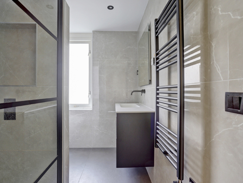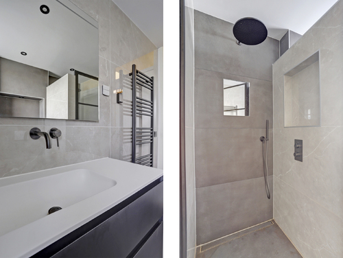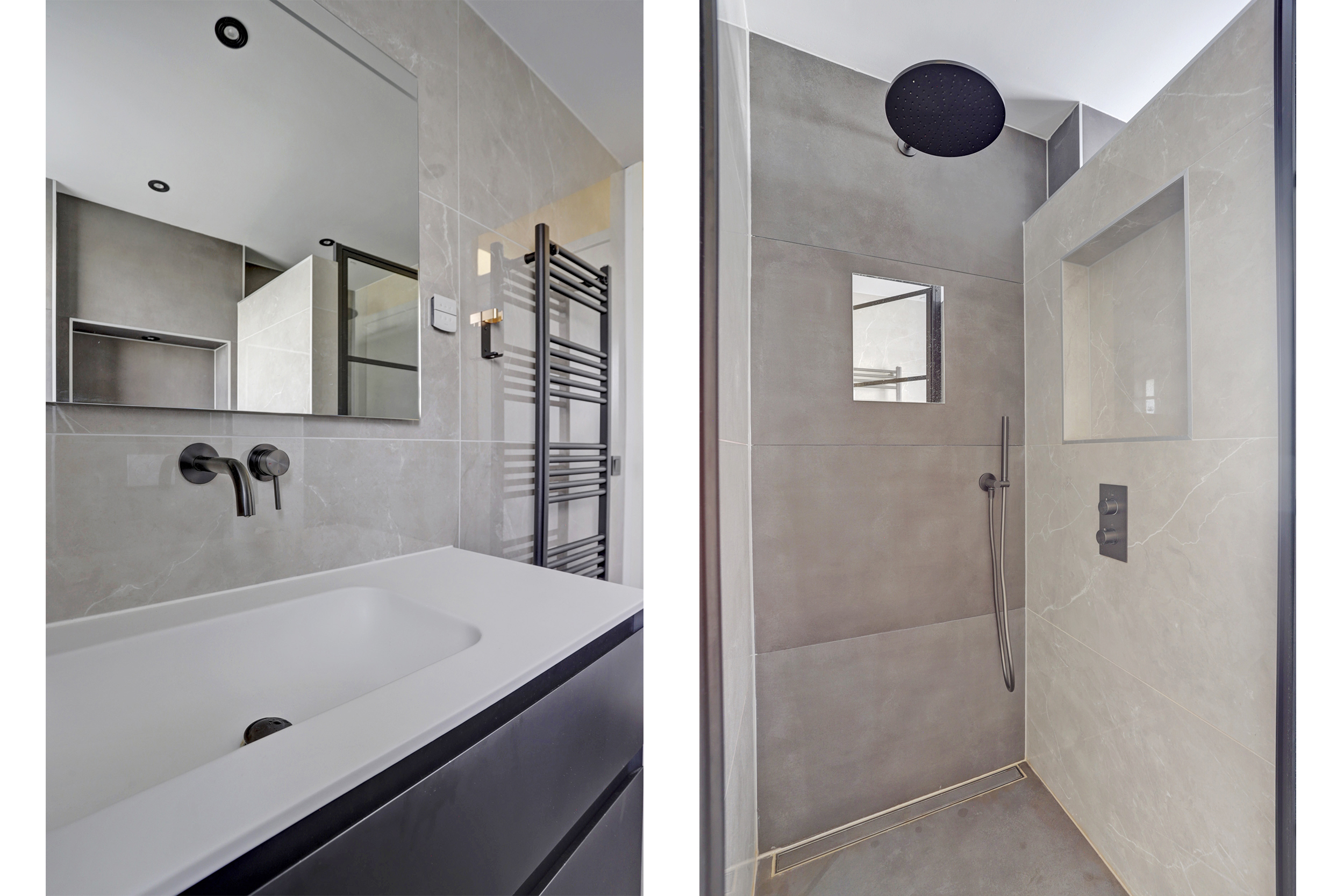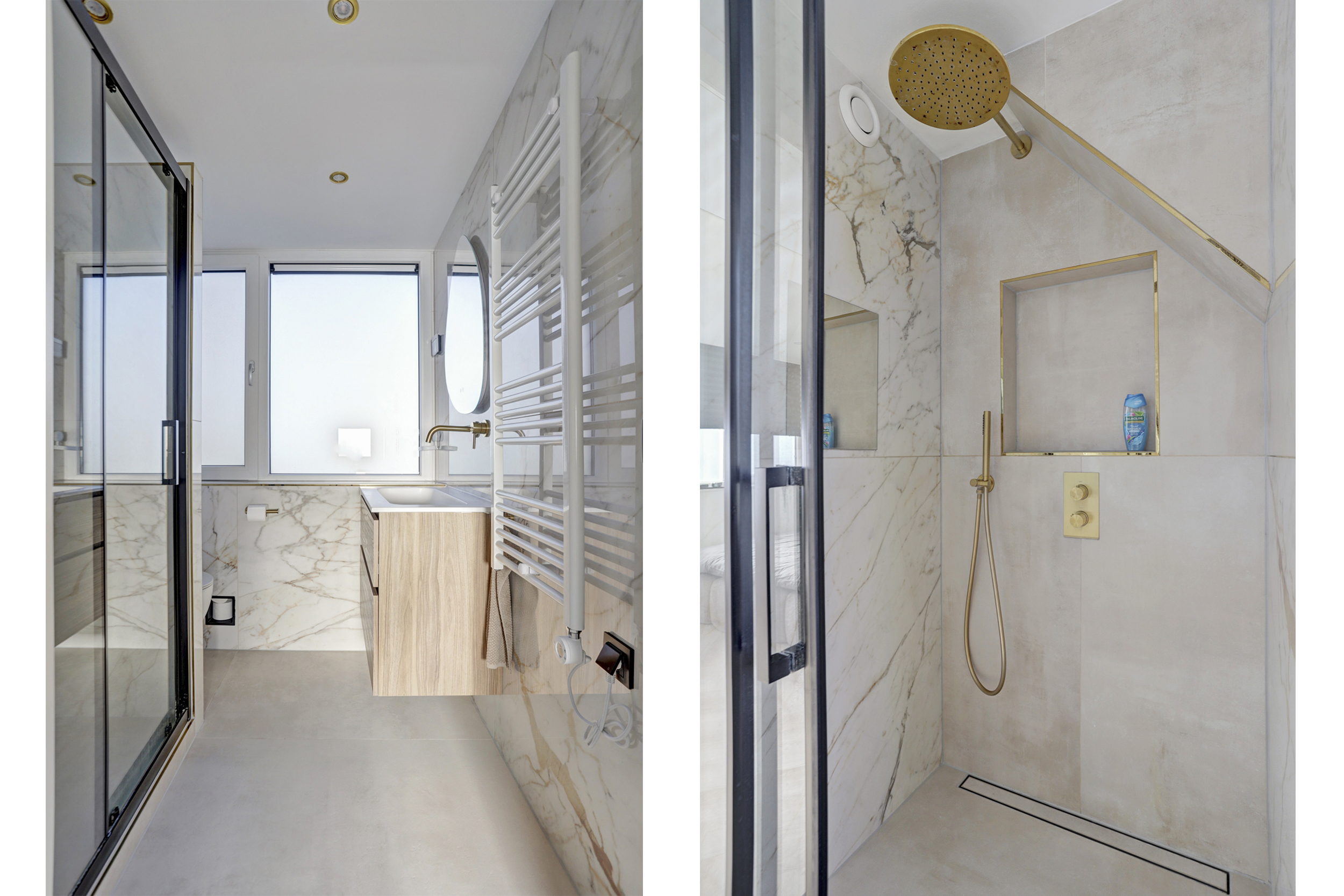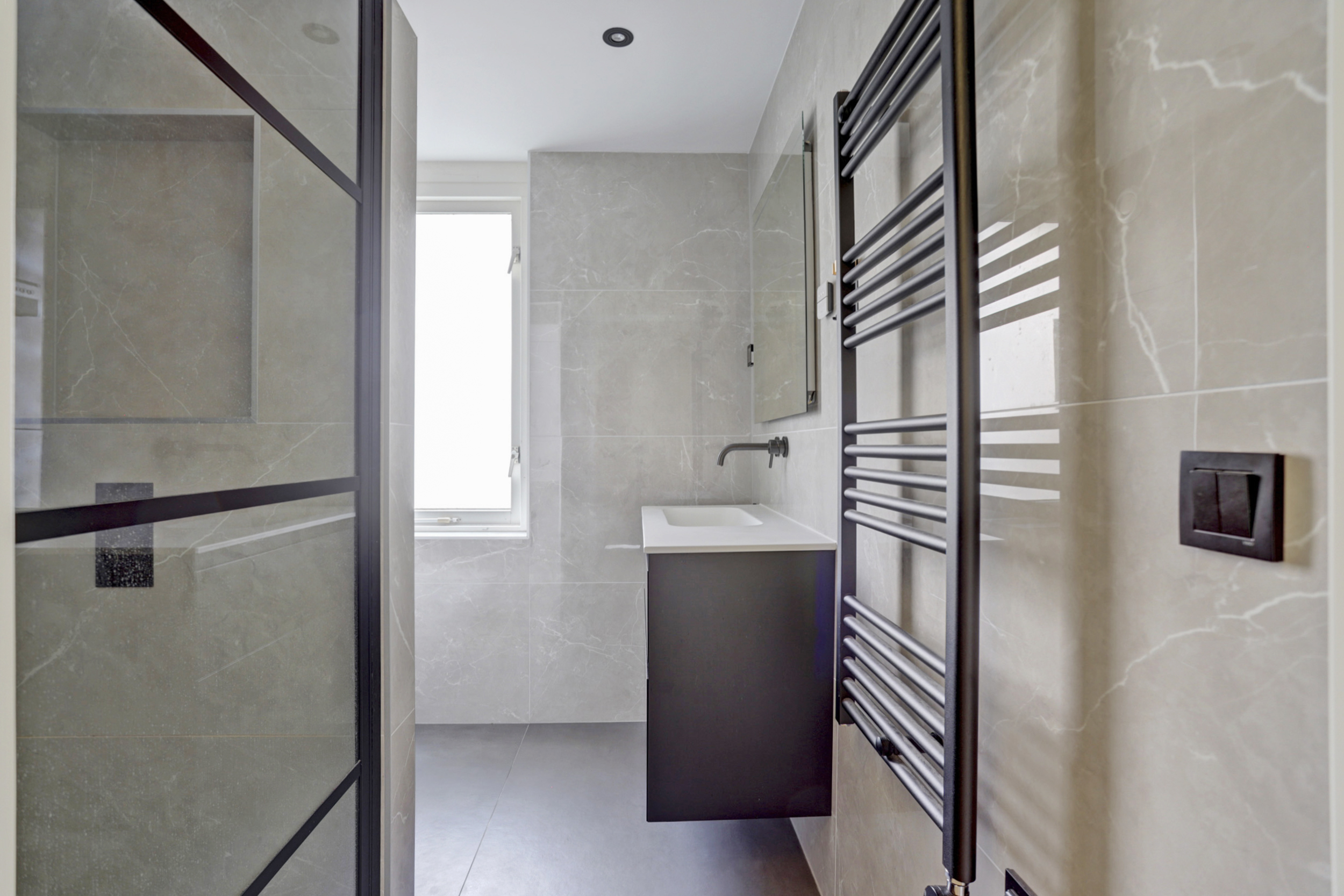 De in 2024 geplaatste luxe badkamer (ca. 4 m²) is geheel betegeld en beschikt over een douchecabine met regendouche, 2e toilet met zwevend closet, vloerverwarming, design radiator, ingebouwde verlichting en een wastafel met bijpassend meubel.