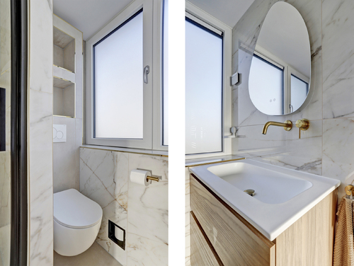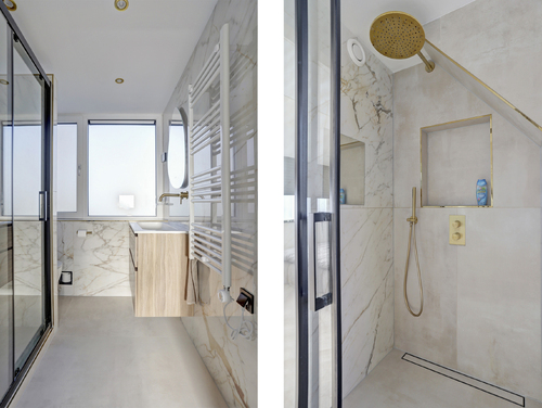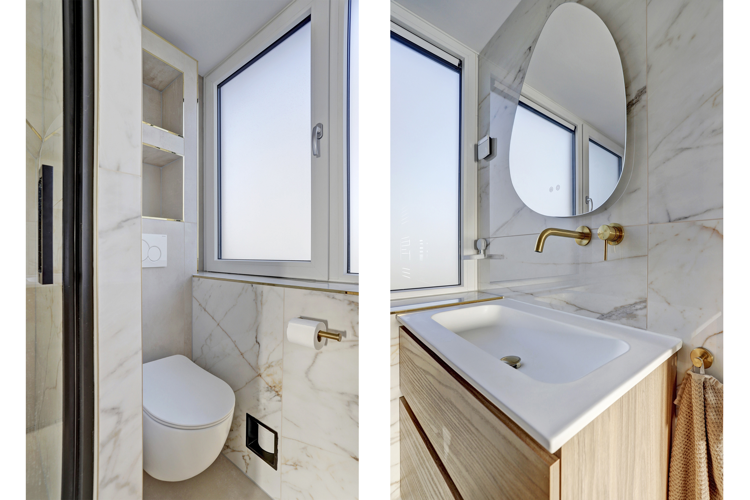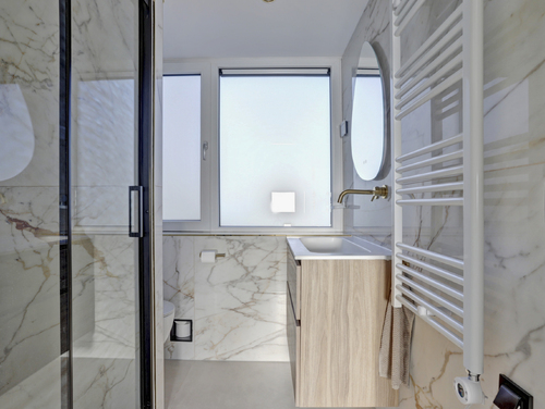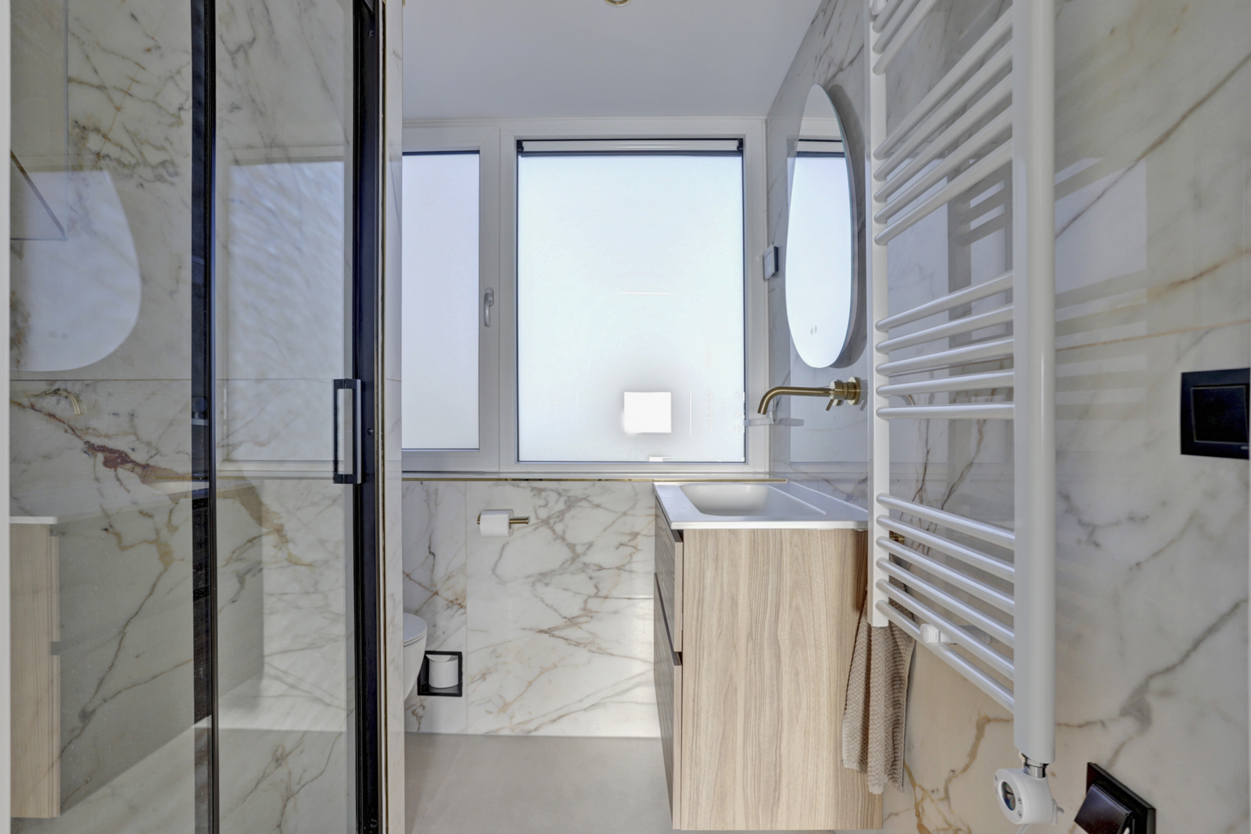 Via de slaapkamer (ca. 4 m²) betreed je de 2e luxe badkamer met ingebouwde verlichting, vloerverwarming, wastafel met meubel, douchecabine met regendouche, design radiator en een 3e toilet met zwevend closet.