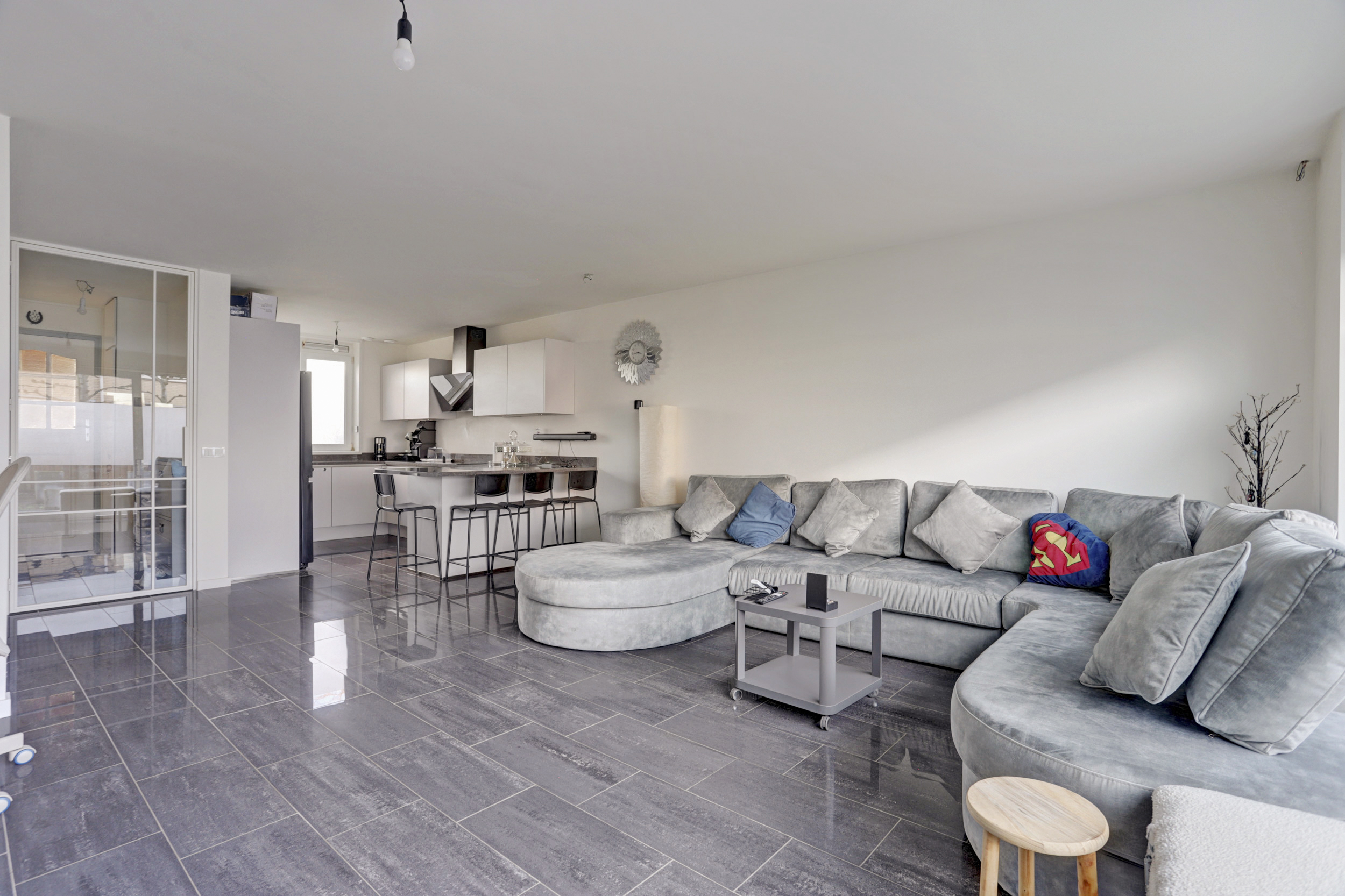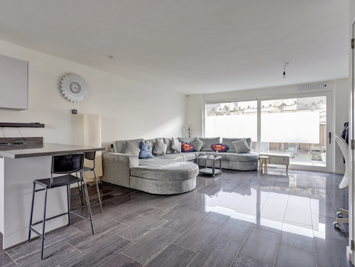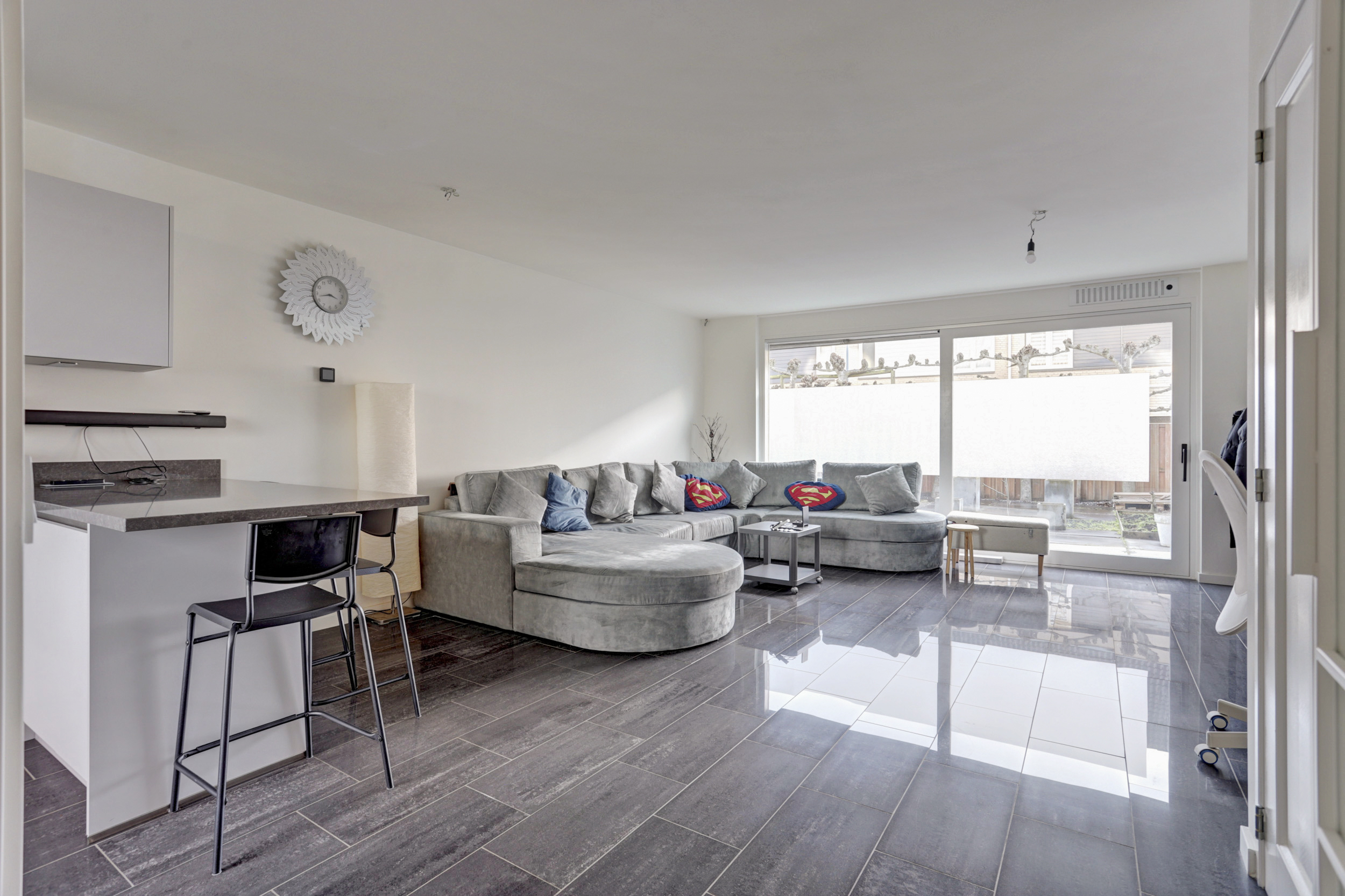 De sfeervolle woonkamer (ca. 30 m²) is voorzien van een schitterende plavuizenvloer, vloerverwarming (hoofdverwarming), licht gesausde wanden, ingebouwde verlichting, een handige voorraadkast en een grote schuifpui die zorgdraagt voor een zeer prettige lichtinval.