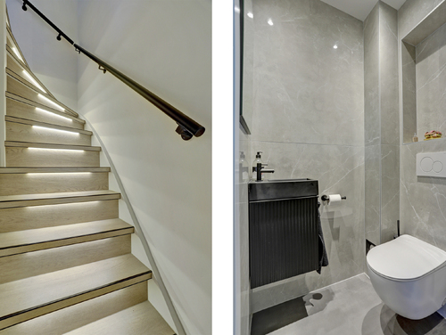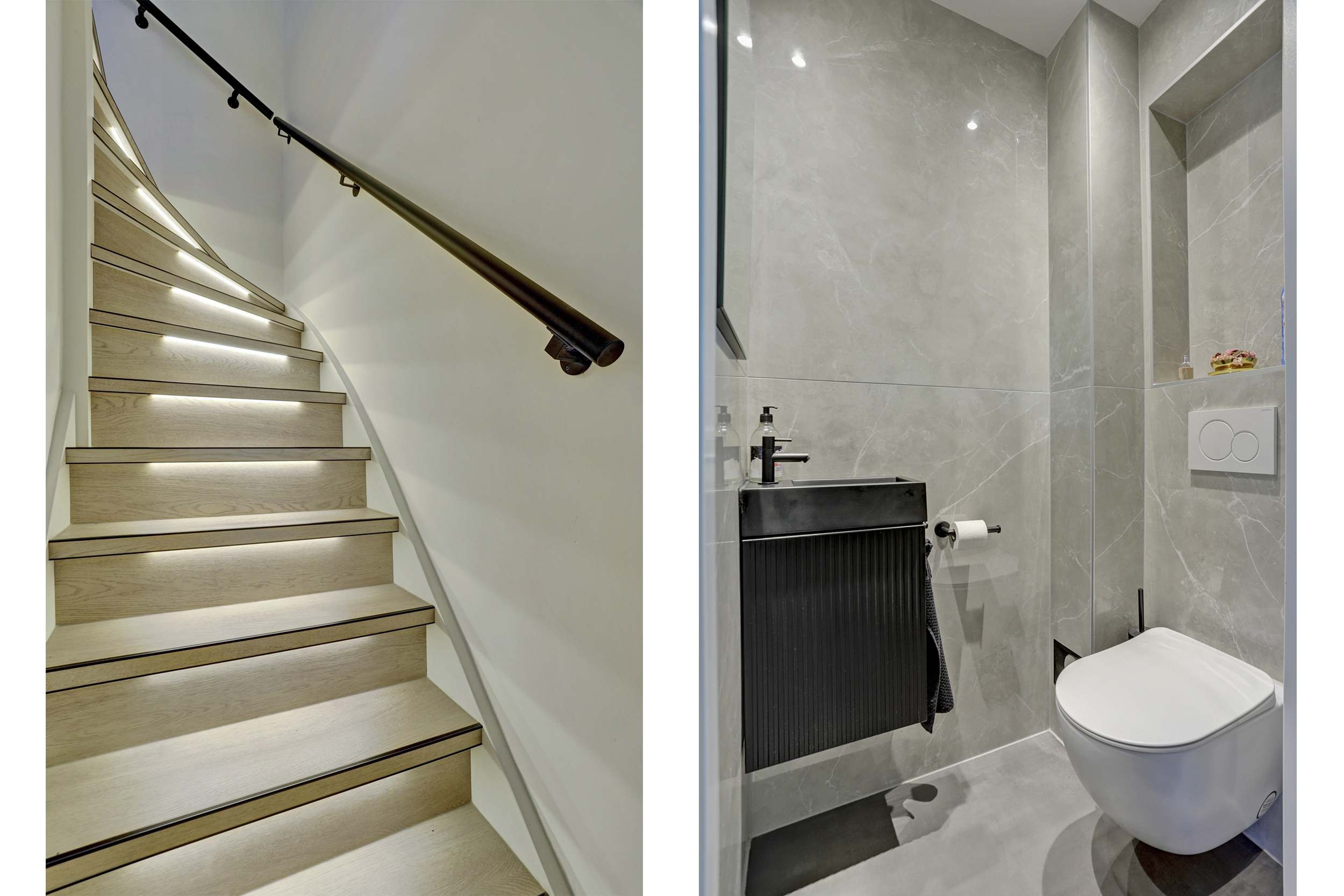 Hal/entree met plavuizenvloer, vloerverwarming, uitgebreide en vernieuwde meterkast, licht gesausde wandafwerking, trapopgang met verlichting, modern toilet met zwevend closet, vloerverwarming en fonteintje en de toegang middels een stalen binnendeur tot de tuingerichte woonkamer.