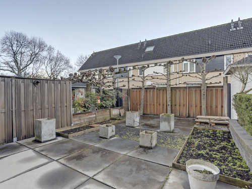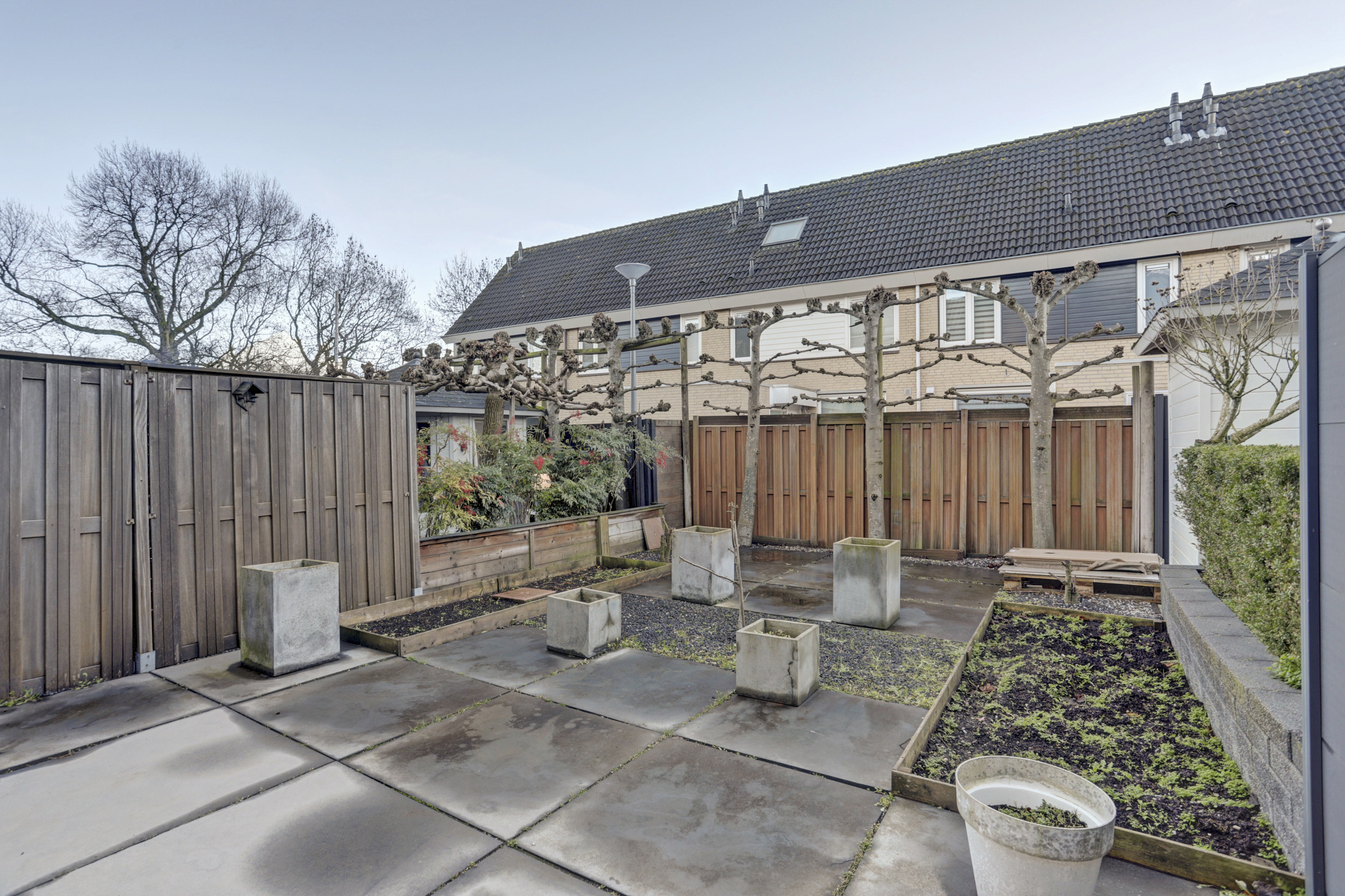 De op het zuidwesten gelegen (besloten) tuin is voorzien van sierbetegeling, verlichting, border met beplating, een buitenkraan en zonwering. De voortuin is eveneens betegeld. De voormalige stenen berging en entree dienen nog te worden afgewerkt het idee was om de huidige hal/entree te vergroten.