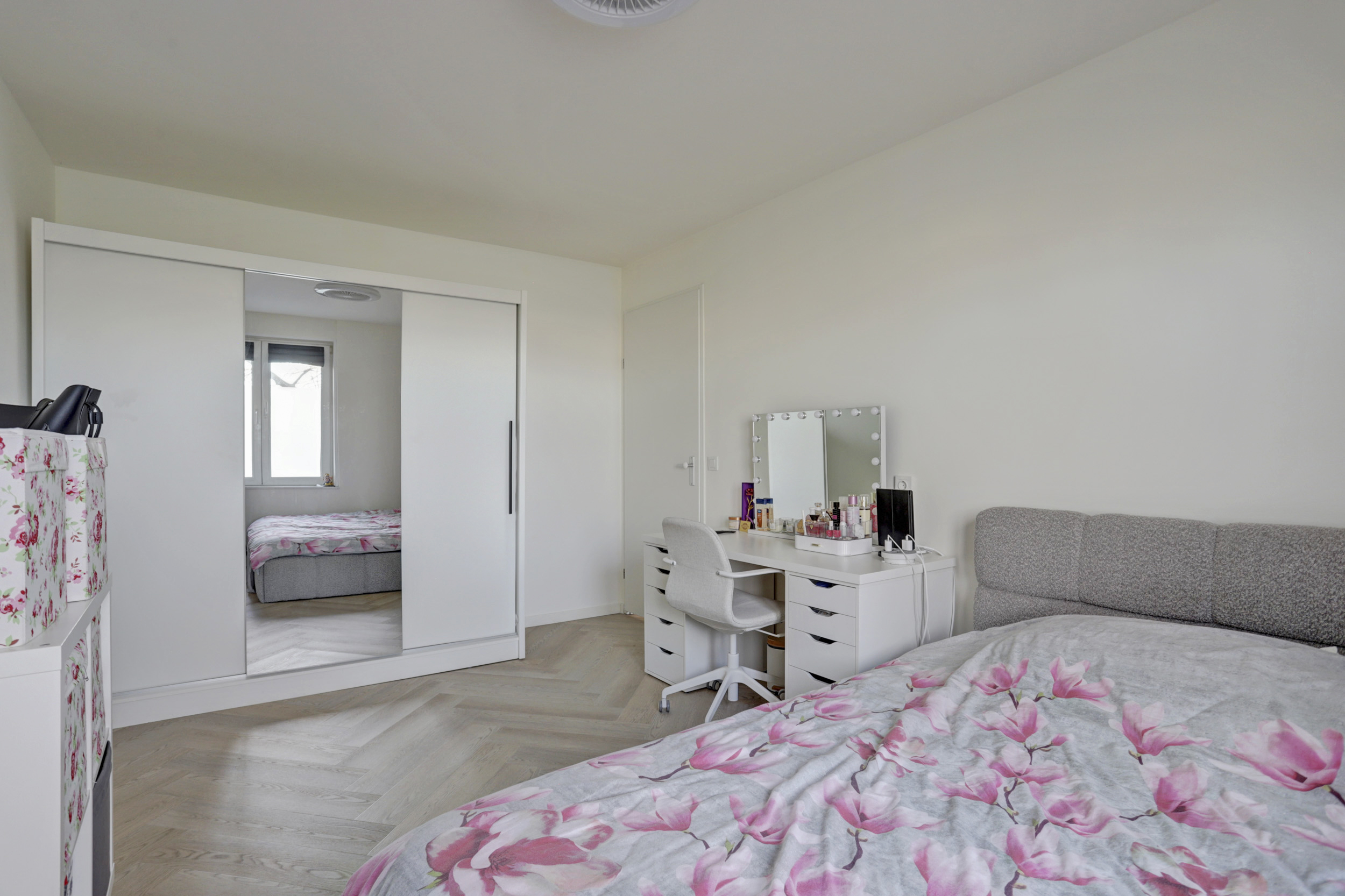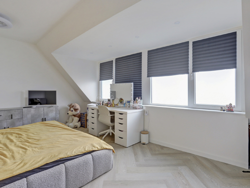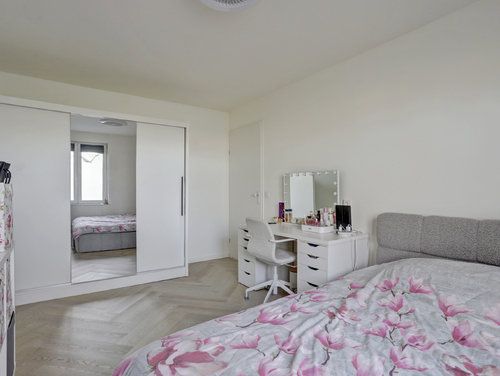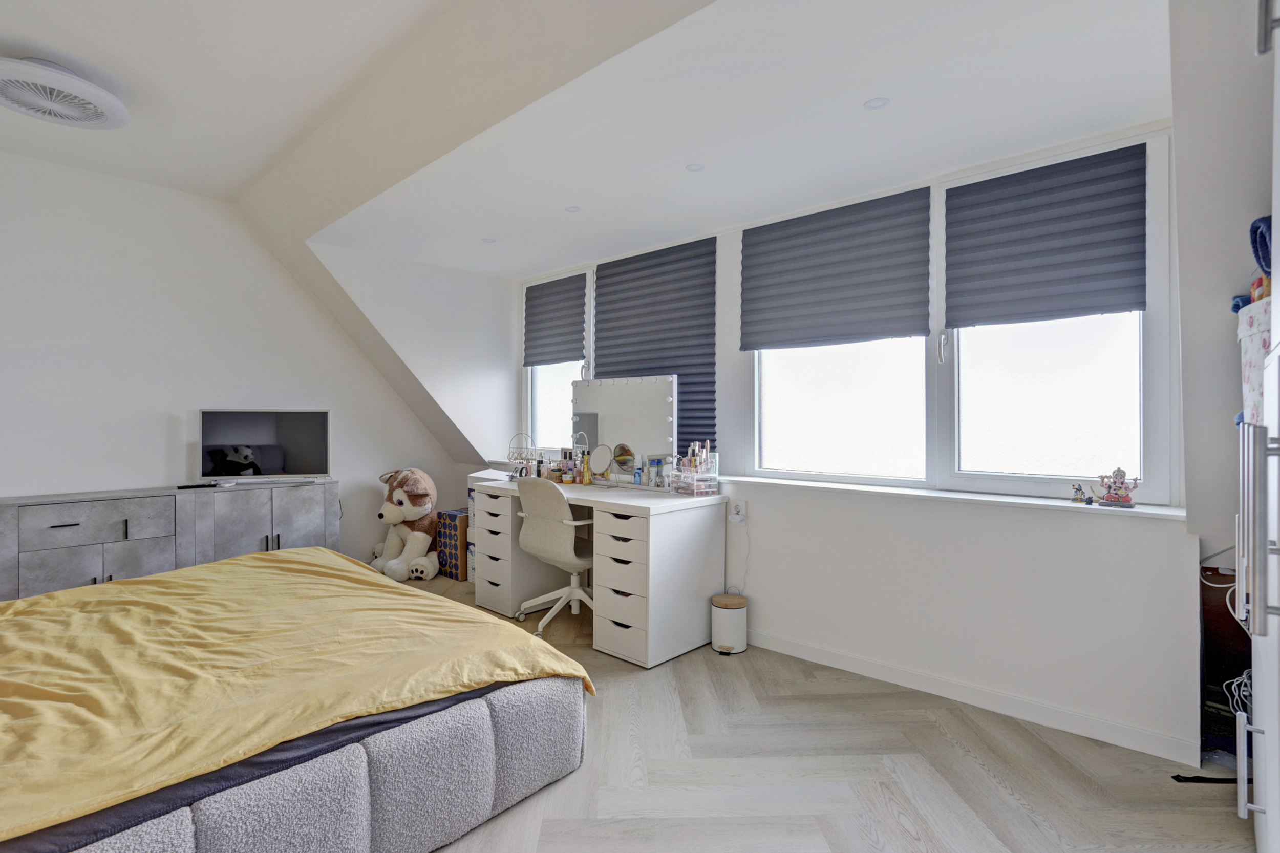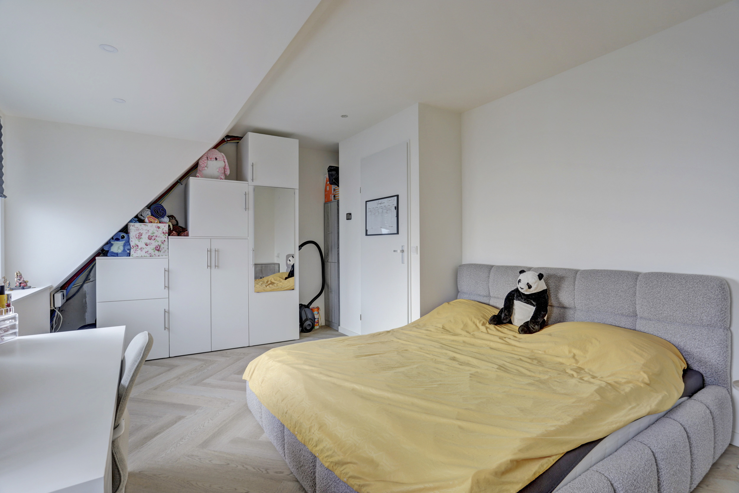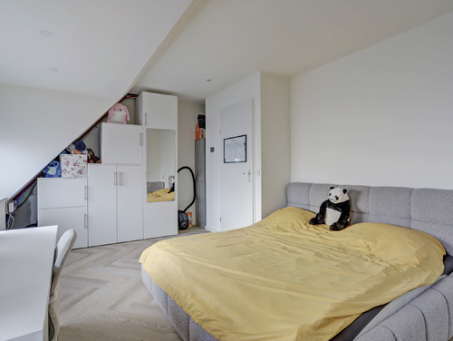 Deze slaapkamer (ca. 18 m², voorheen 2 kamers) is gesitueerd aan de achterzijde van de woning en voorzien van een grote kunststof dakkapel, ingebouwde verlichting, licht gesausde wandafwerking en een pvc visgraadvloer met vloerverwarming.