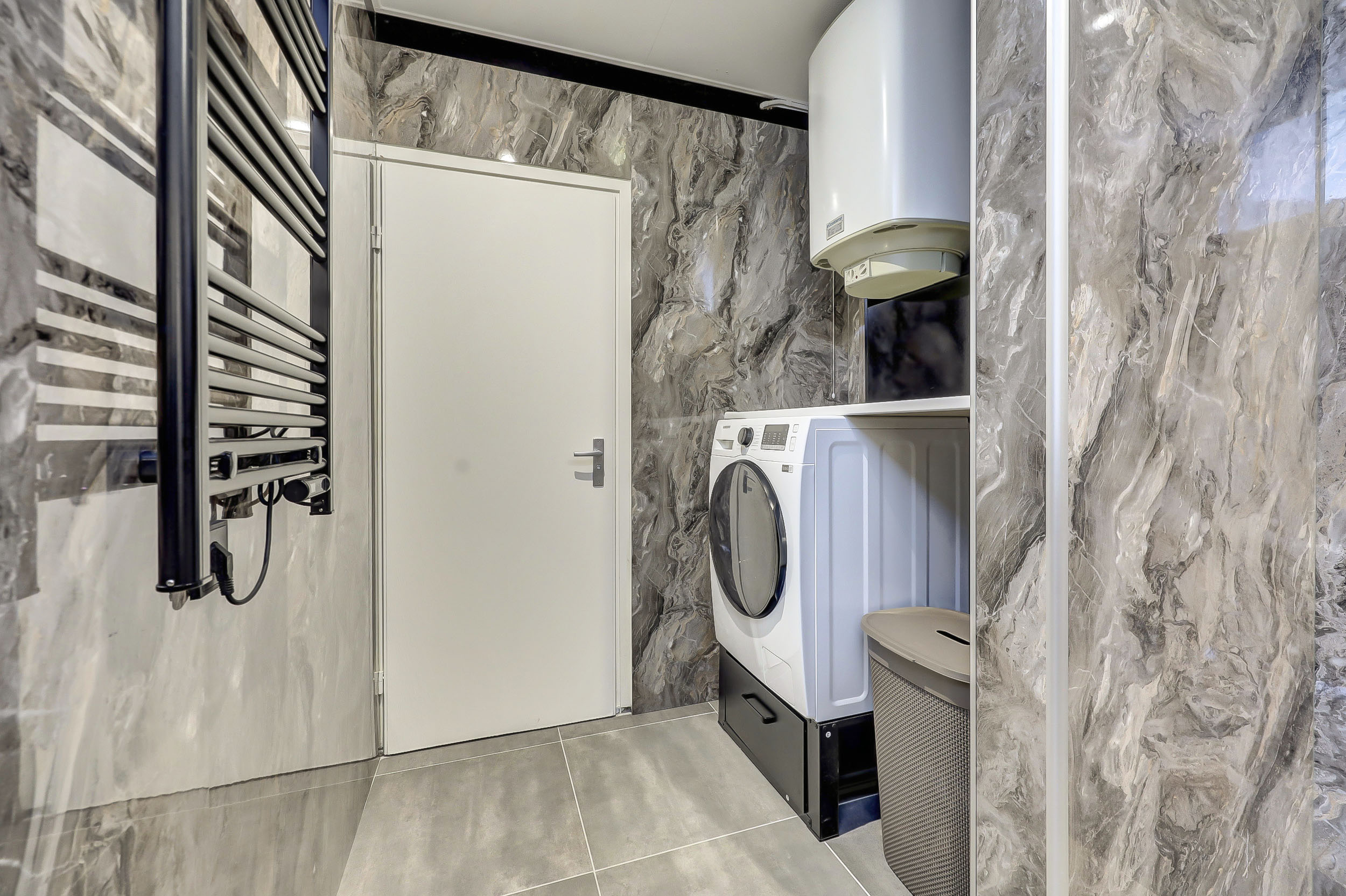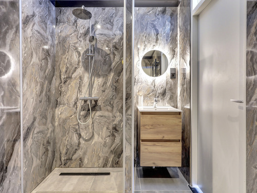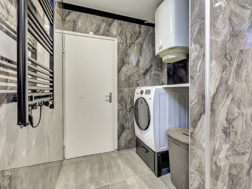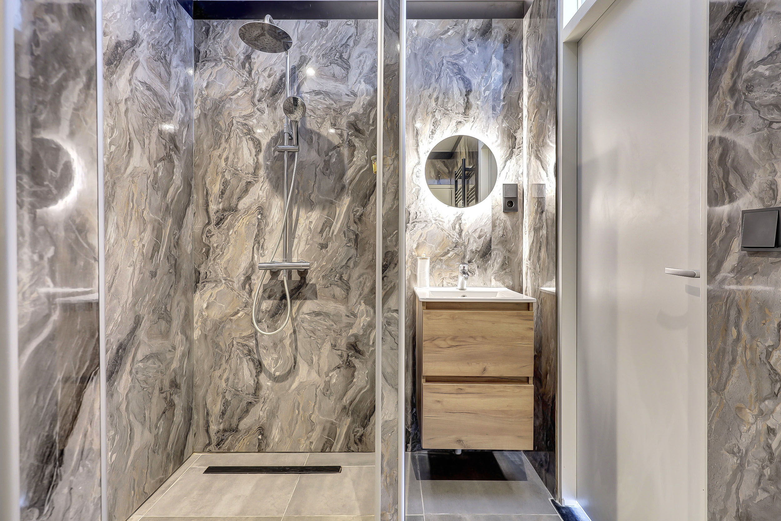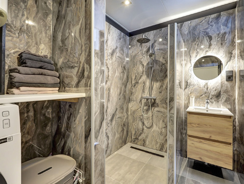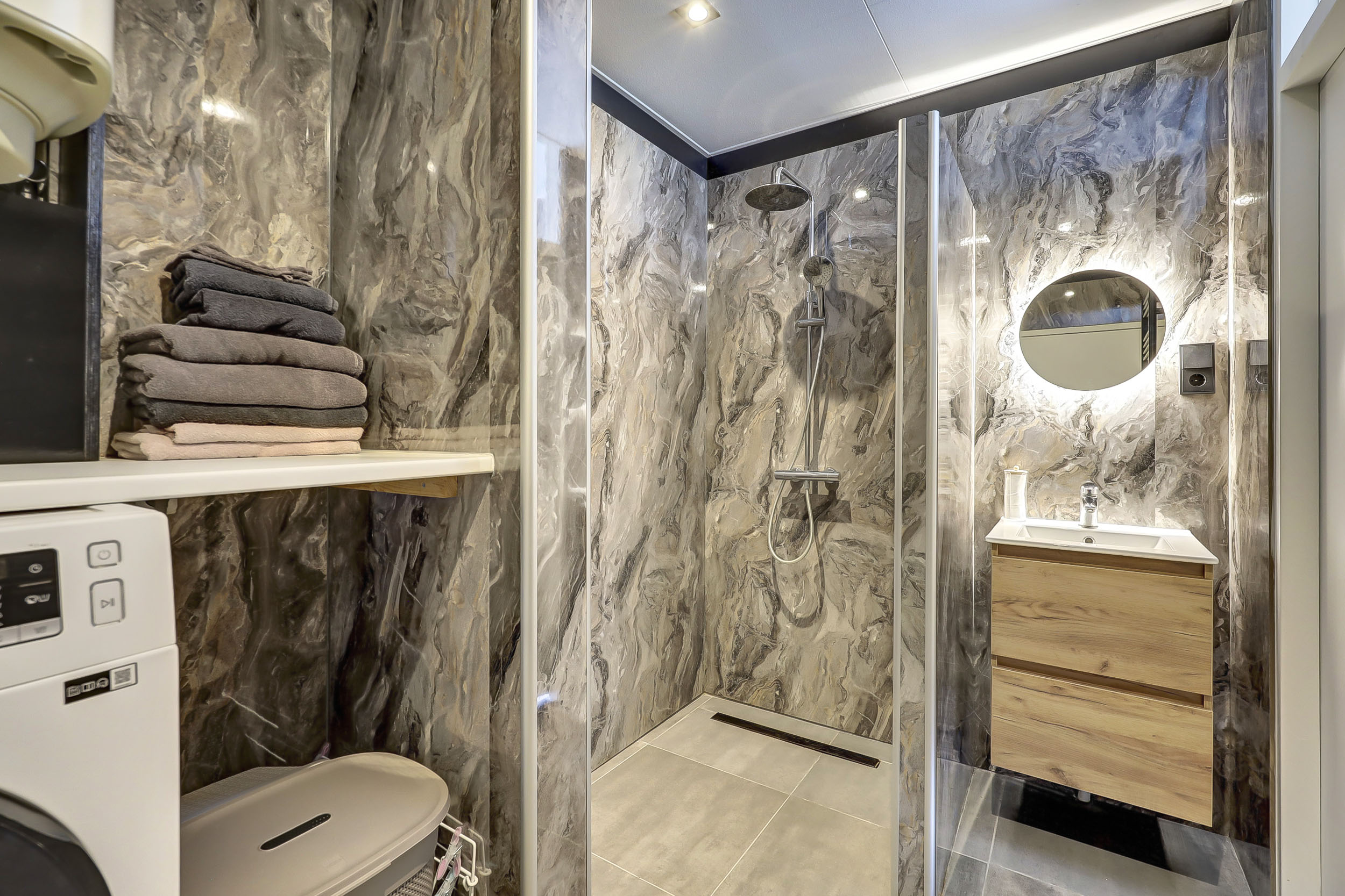 De vernieuwde badkamer (ca. 6 m²) is uitgerust met een inloopdouche, ingebouwde verlichting, wastafel met meubel, toegang tot het separate toilet en de opstelplaats van de was-/droogcombinatie en elektrische boiler (80 liter/Daalderop).