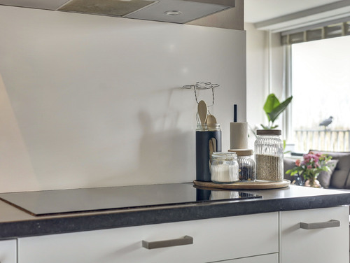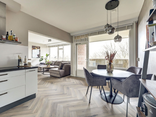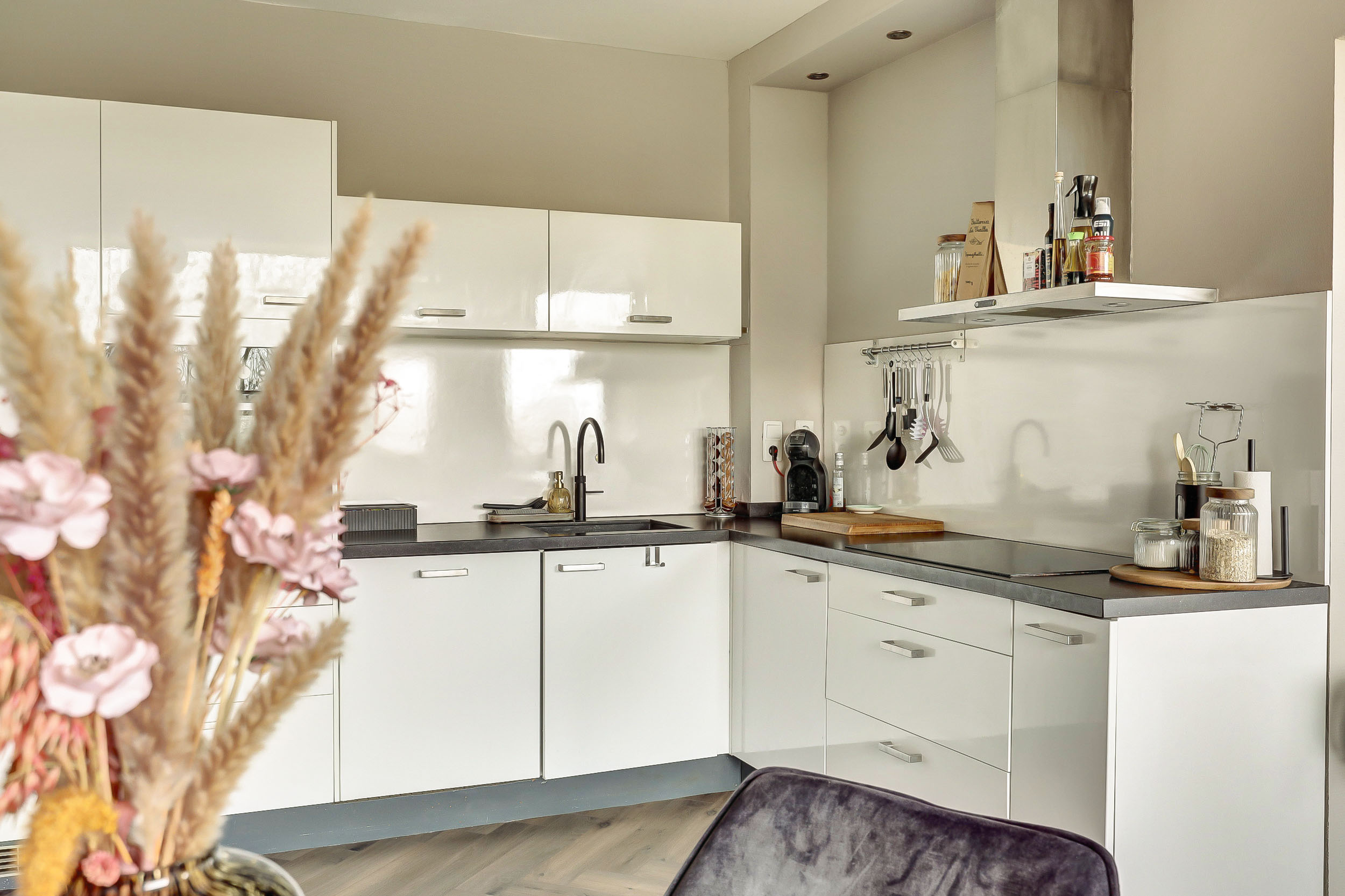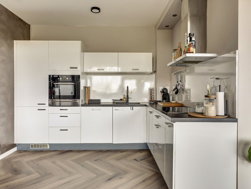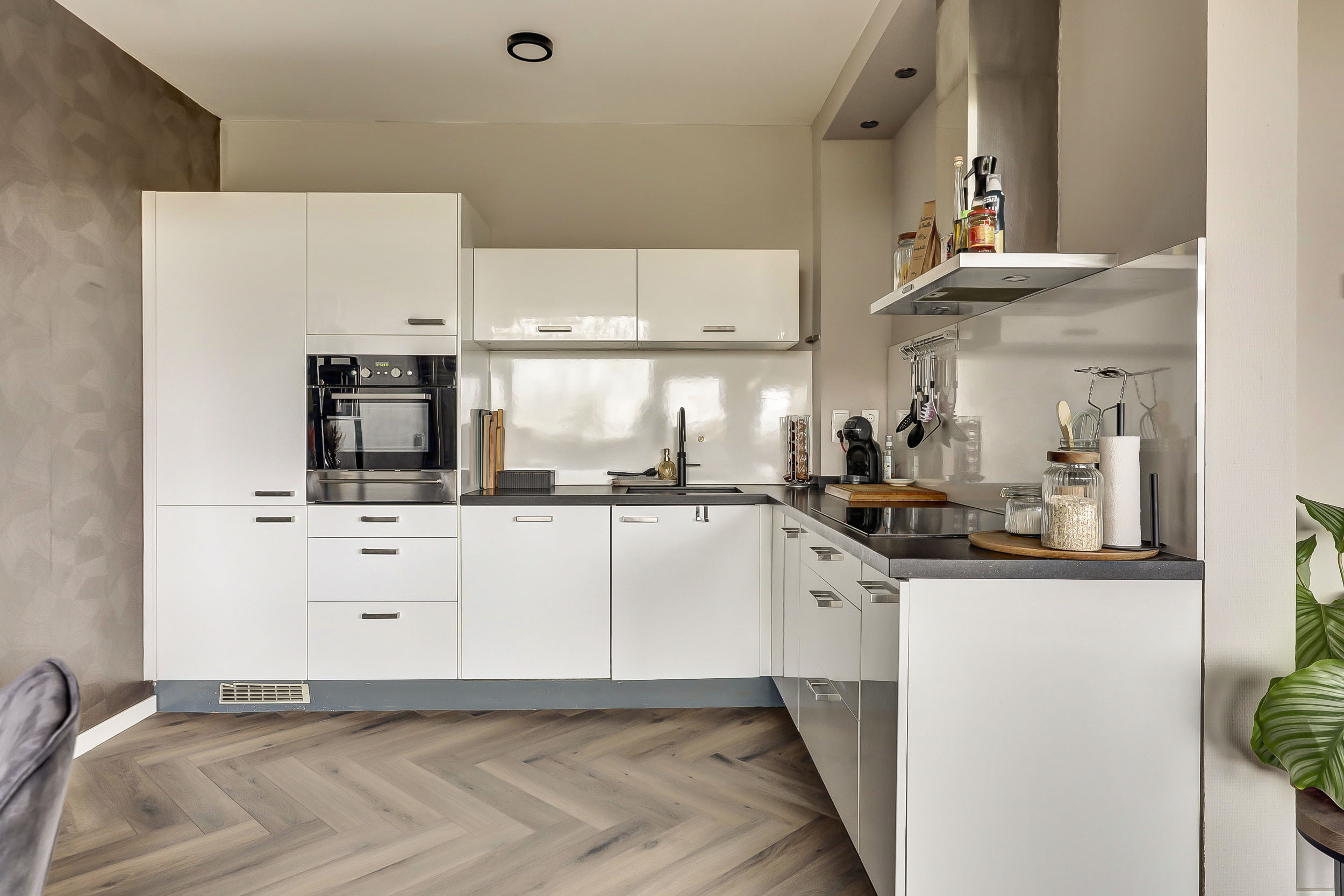 De moderne, in L-vorm opgestelde keuken (ca. 13 m²) is strak afgewerkt en voorzien van ingebouwde verlichting en een laminaatvloer. Je beschikt hier over diverse inbouwapparatuur, waaronder een koelkast, vriezer, inductiekookplaat, RVS afzuigschouw, combimagnetron, Quooker, vaatwasser en zelfs een bordenwarmer.