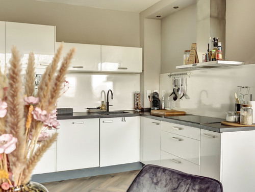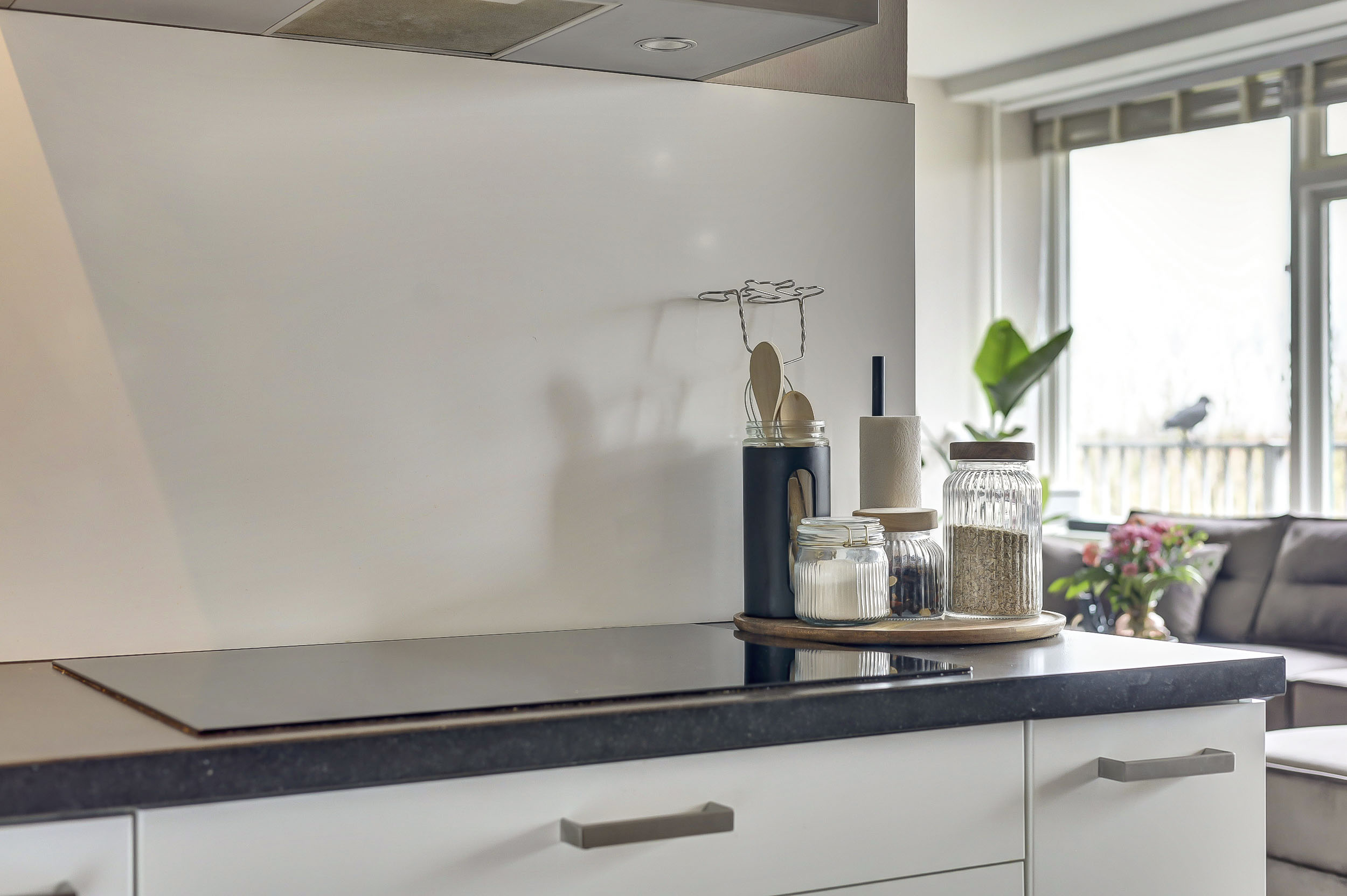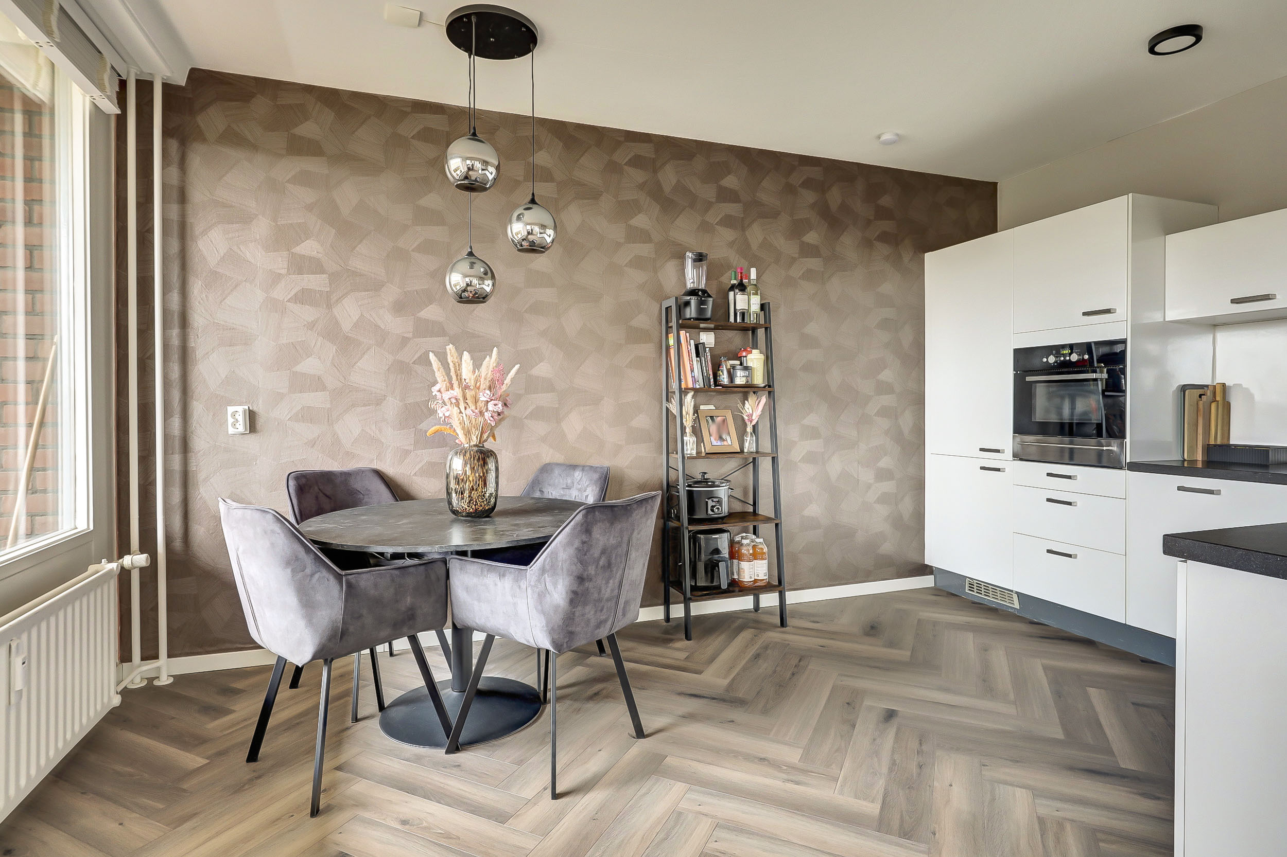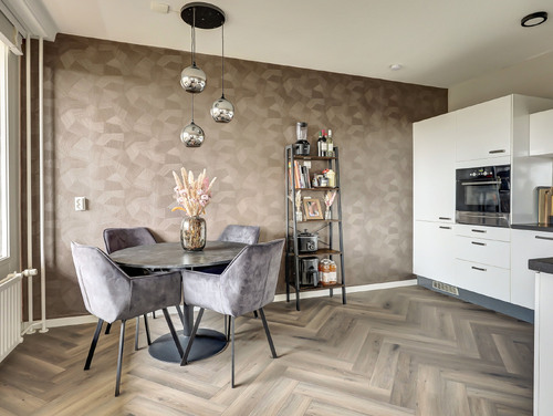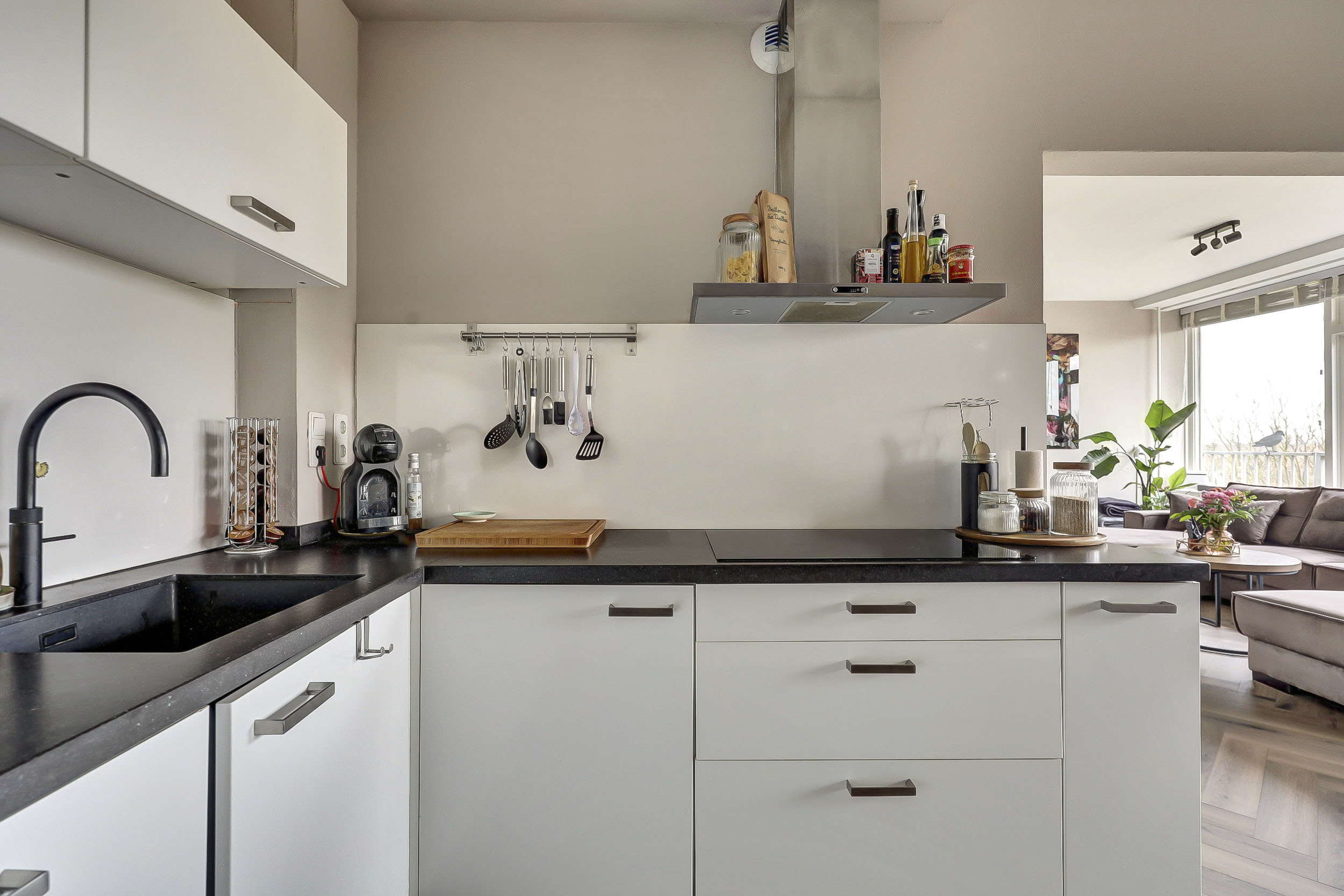 De moderne, in L-vorm opgestelde keuken (ca. 13 m²) is strak afgewerkt en voorzien van ingebouwde verlichting en een laminaatvloer. Je beschikt hier over diverse inbouwapparatuur, waaronder een koelkast, vriezer, inductiekookplaat, RVS afzuigschouw, combimagnetron, Quooker, vaatwasser en zelfs een bordenwarmer.