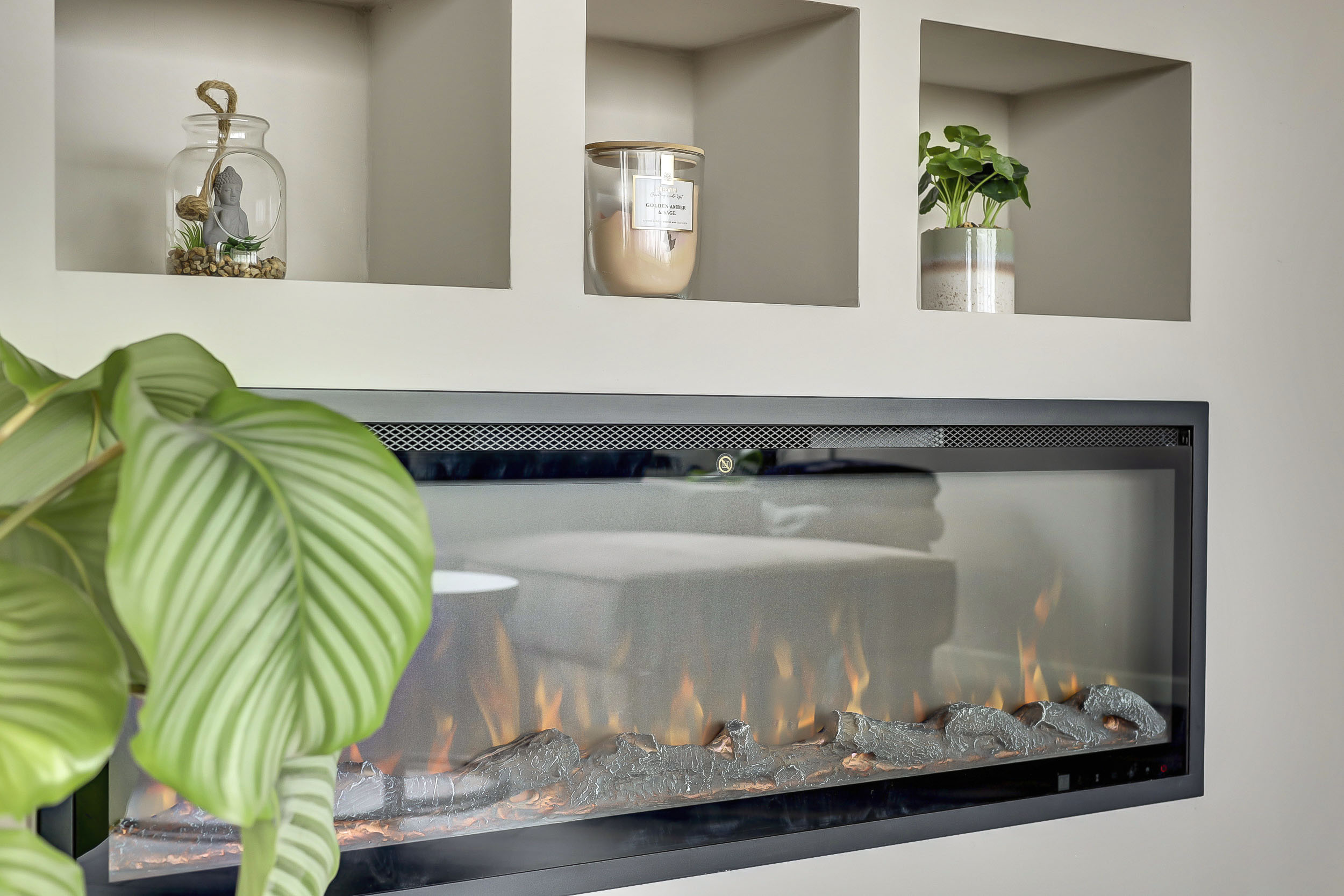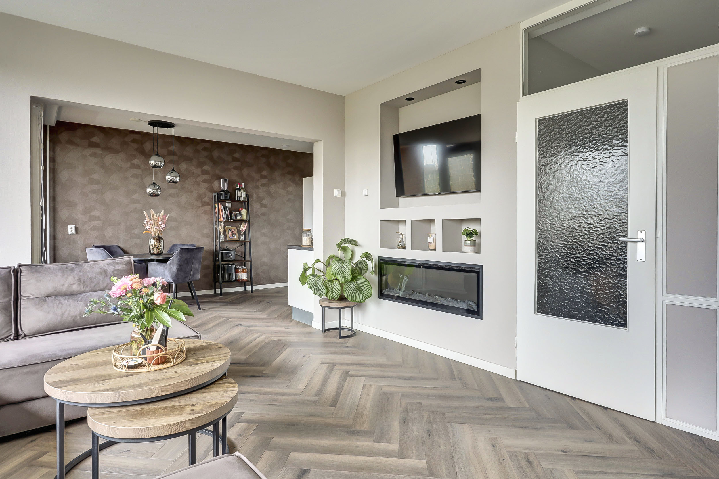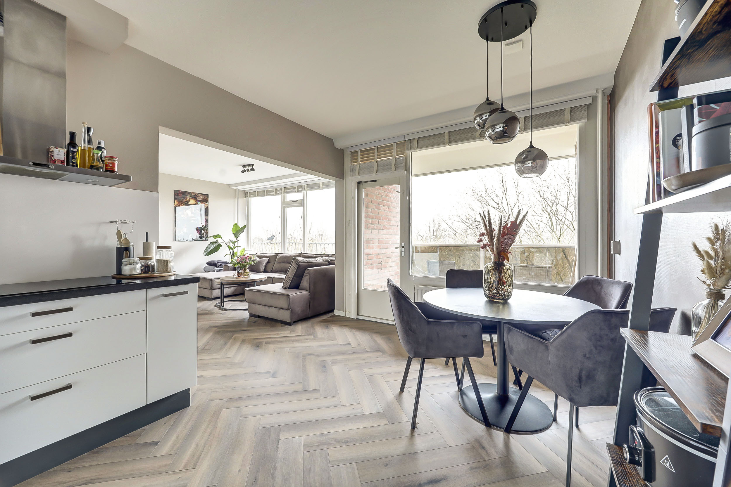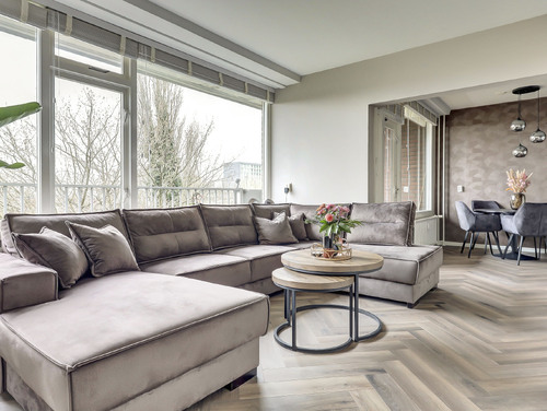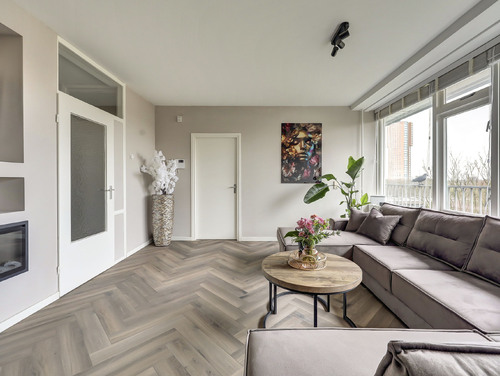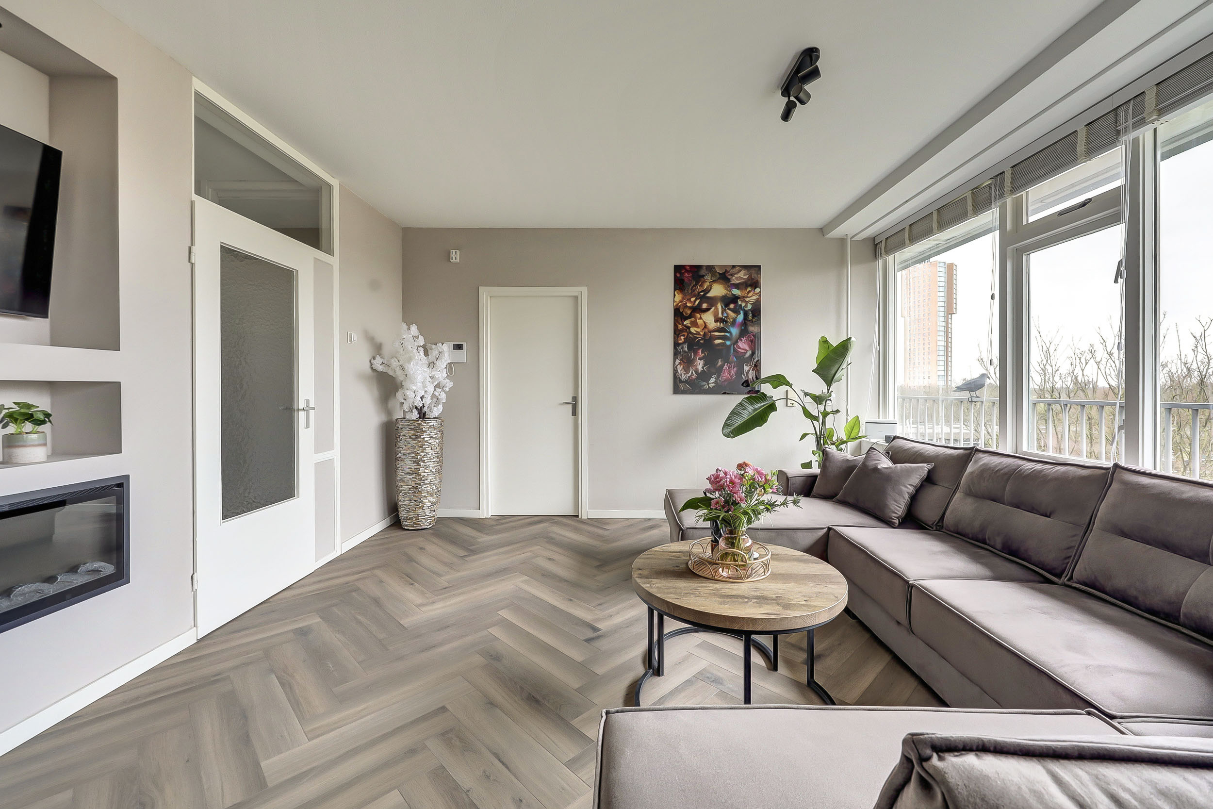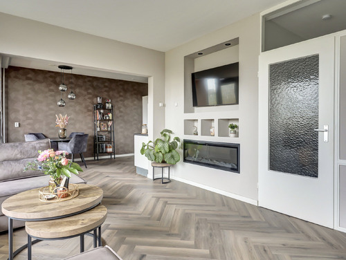 De sfeervolle woonkamer van ca. 20 m² is heerlijk licht dankzij de grote ramen en biedt een mooi uitzicht over de "groene" woonomgeving. De ruimte is voorzien van een laminaatvloer en praktisch ingedeeld in een zit- en eetgedeelte. De stijlvolle cinewall met geïntegreerde sierhaard zorgt voor extra sfeer en maakt het geheel compleet. Aansluitend vind je het zonnige balkon op het zuidoosten (ca. 10 m²), waar je volop kunt genieten van de zon en het uitzicht.