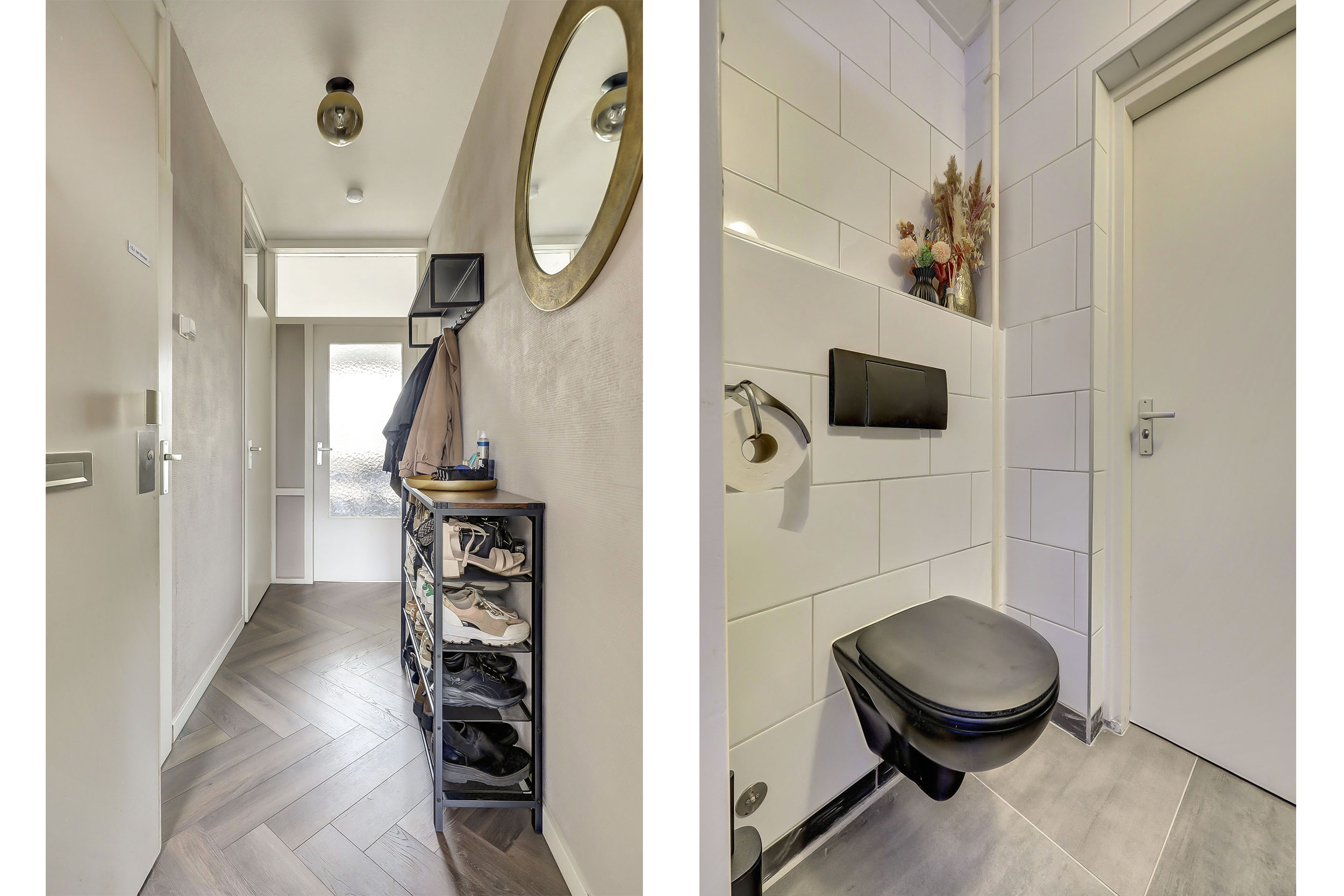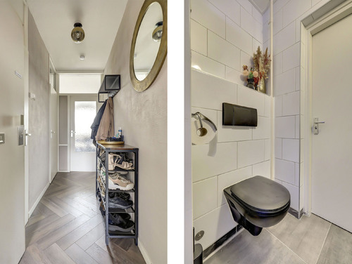 De hal is voorzien van glasvezelwandafwerking, een laminaatvloer, vernieuwde meterkast (6 groepen/slimme meters), garderoberuimte, een modern geheel betegeld toilet met zwevend closet en fonteintje, een handige voorraadkast en de toegang tot de diverse overige vertrekken.
