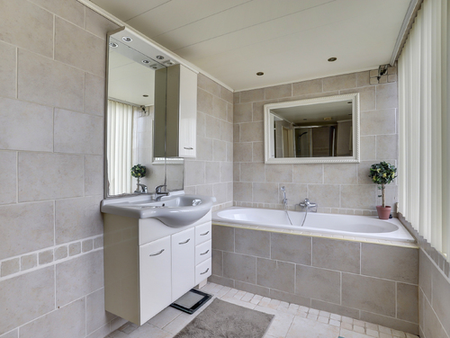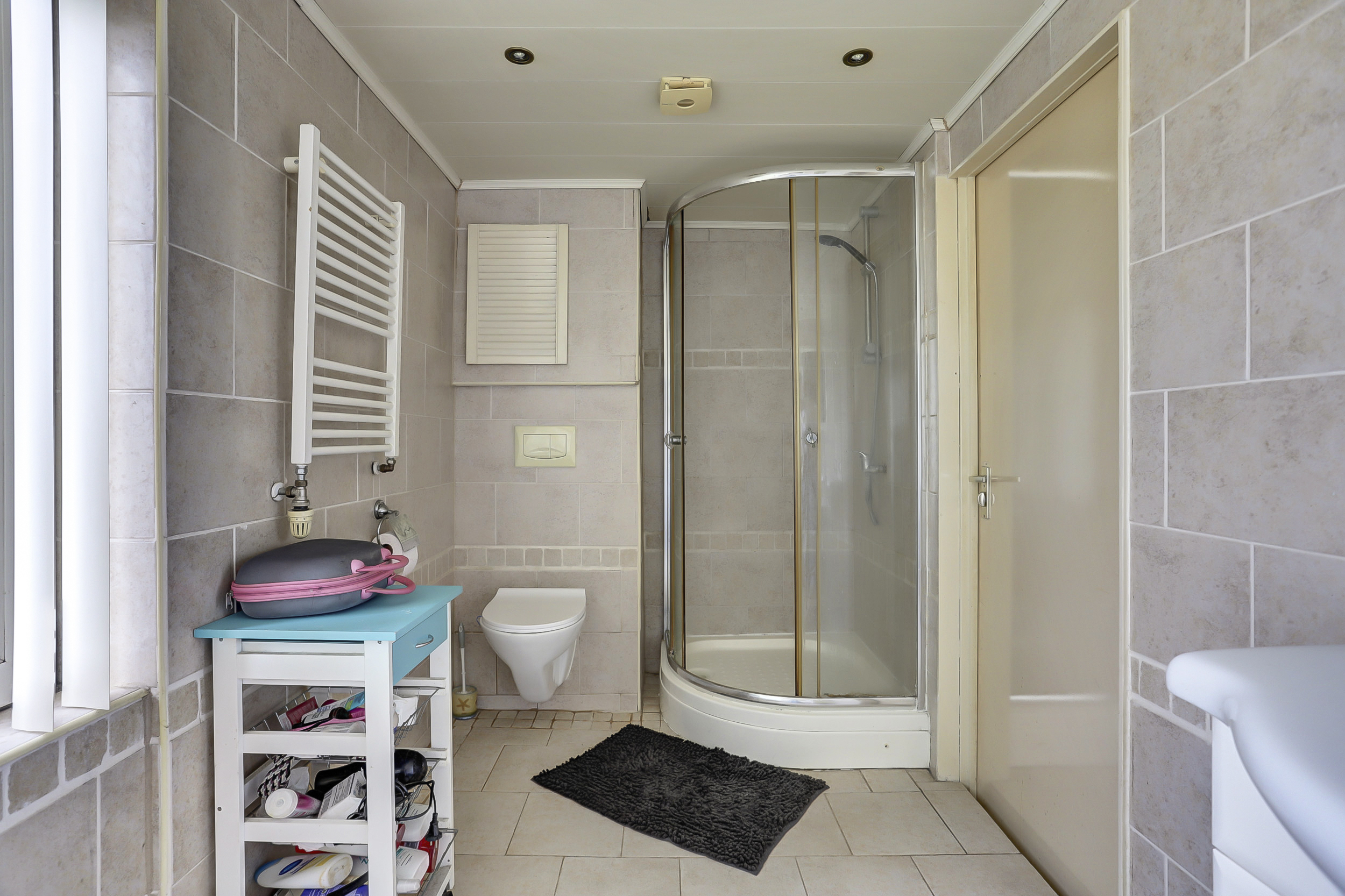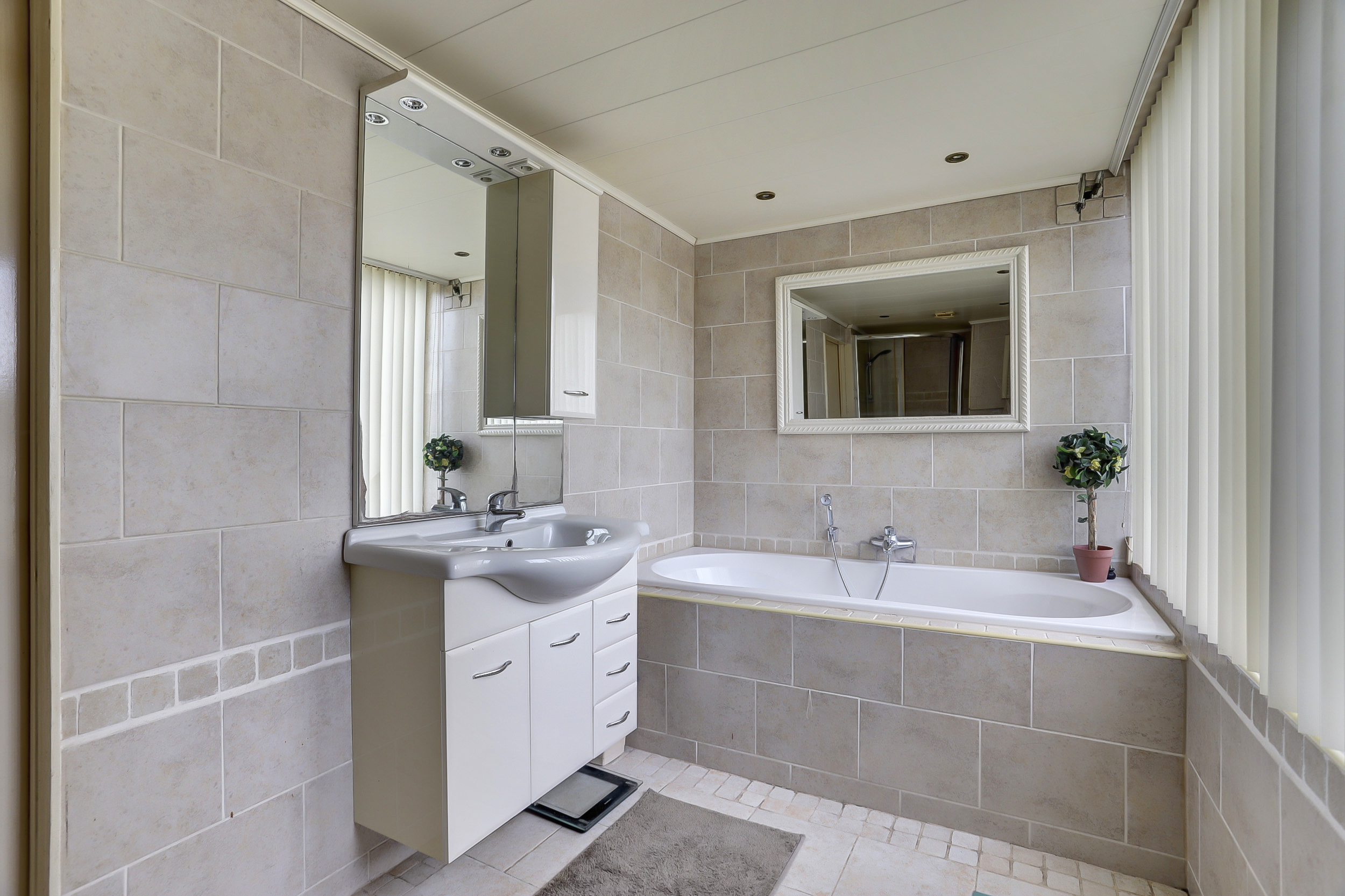 De vergrote badkamer (ca. 1.82 m x 4.39 m) is gelegen aan de voorzijde van de woning en uitgerust met een 2e toilet met hangcloset, wastafel met meubel, design radiator, ingebouwde verlichting, ligbad en een douchecabine.