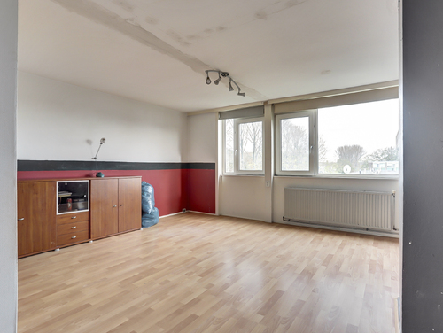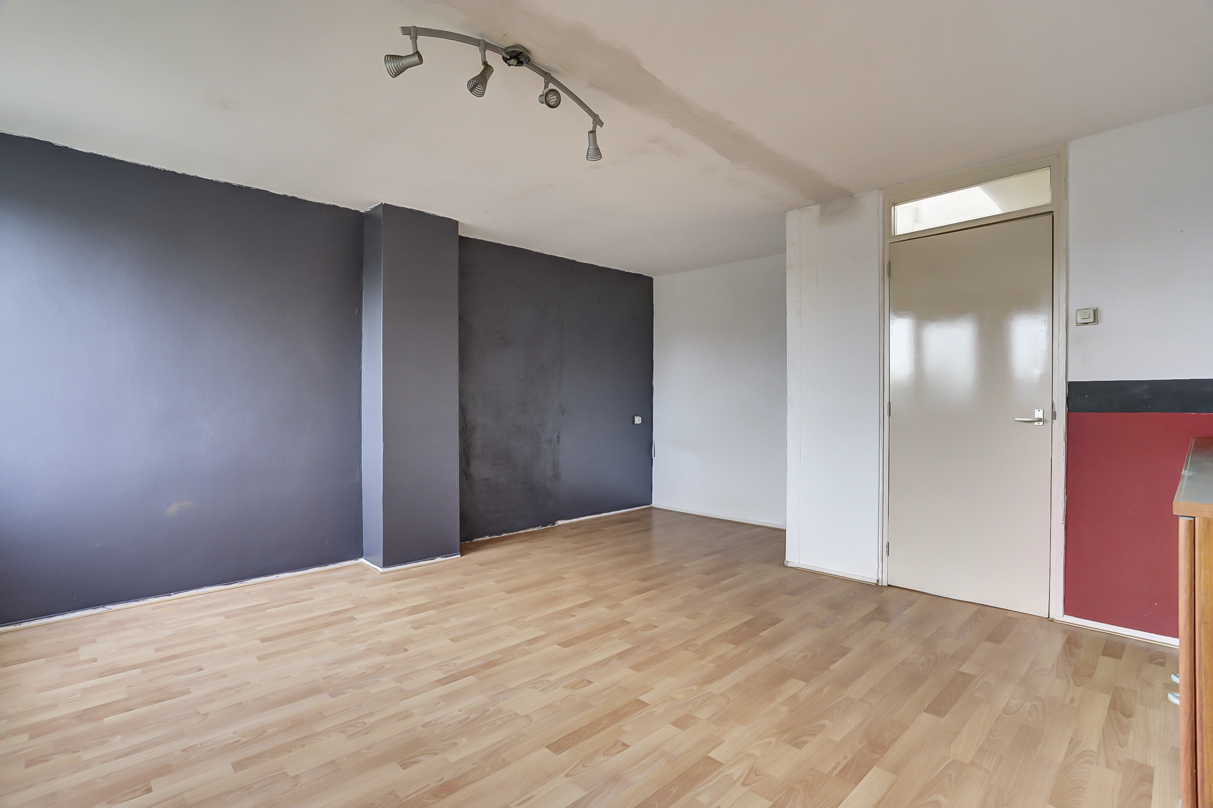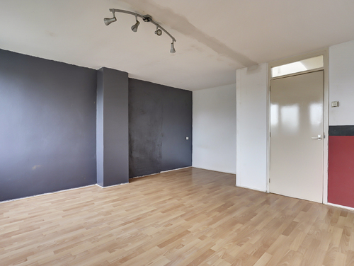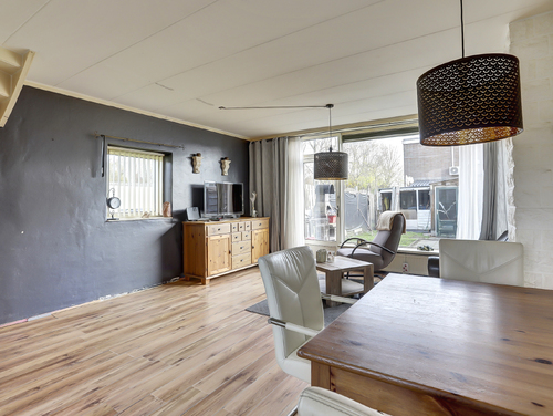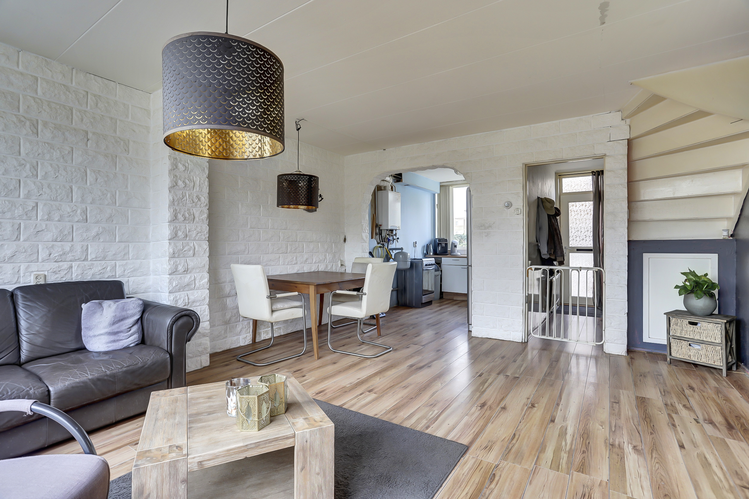 De woonkamer aan de achterzijde van de woning is ca. 5.18 m x 4.37 m groot en heeft uitzicht op - en een deur naar - de achtertuin. De woonkamer is daarnaast voorzien van een laminaatvloer, een zijraam en een open keuken.