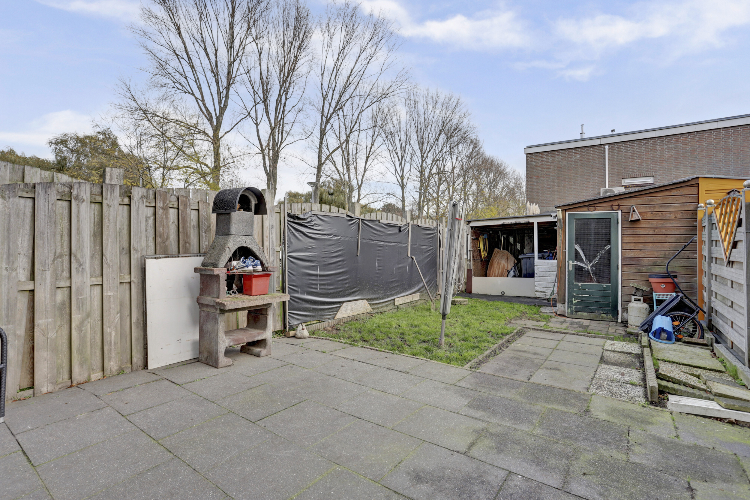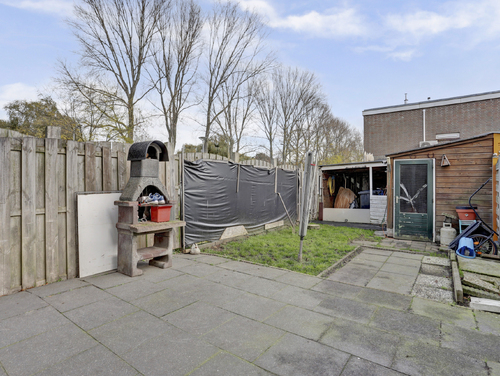 De voortuin is betegeld. In de riante achtertuin (Z/O) bevindt zich een vrijstaande houten berging en een handige overkapping met achterom.