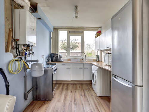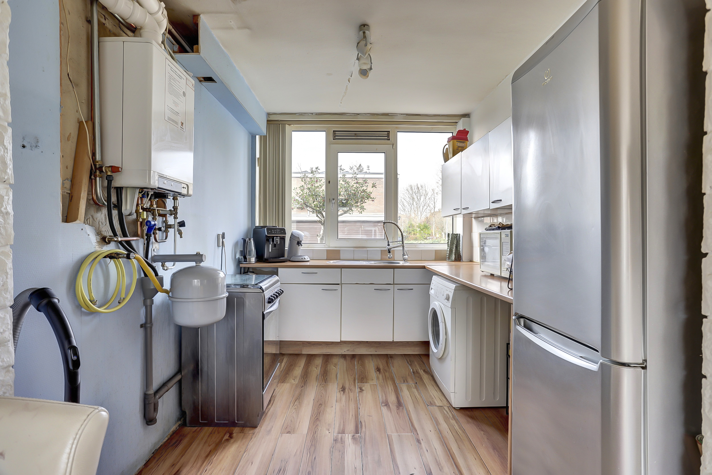Aan de voorzijde van woning is de open keuken gesitueerd (ca. 2.49 m x 3.06 m), met een eenvoudige "Bruynzeel" L-vormige inrichting, de wasmachine aansluiting en de opstelling van de cv combiketel (Intergas, bouwjaar 2022/huur). Hier tref je dezelfde laminaatvloer als in de woonkamer.