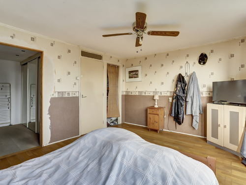 De ouderslaapkamer met parketvloer, aan de achterzijde van de woning en ca. 4.39 m x 3.44 m groot.