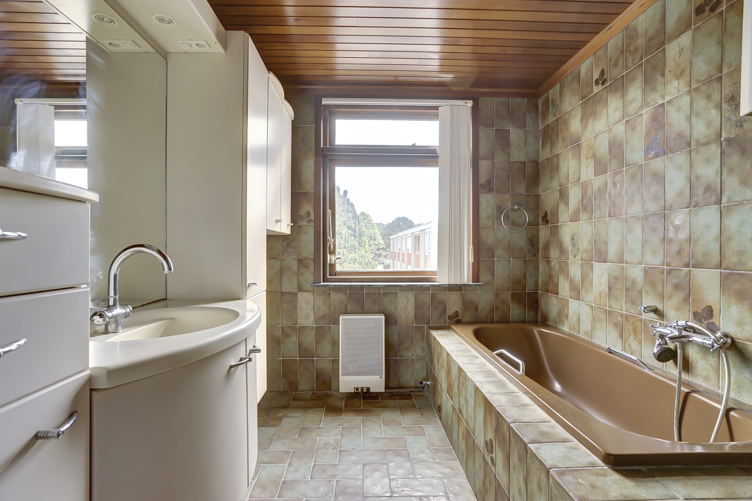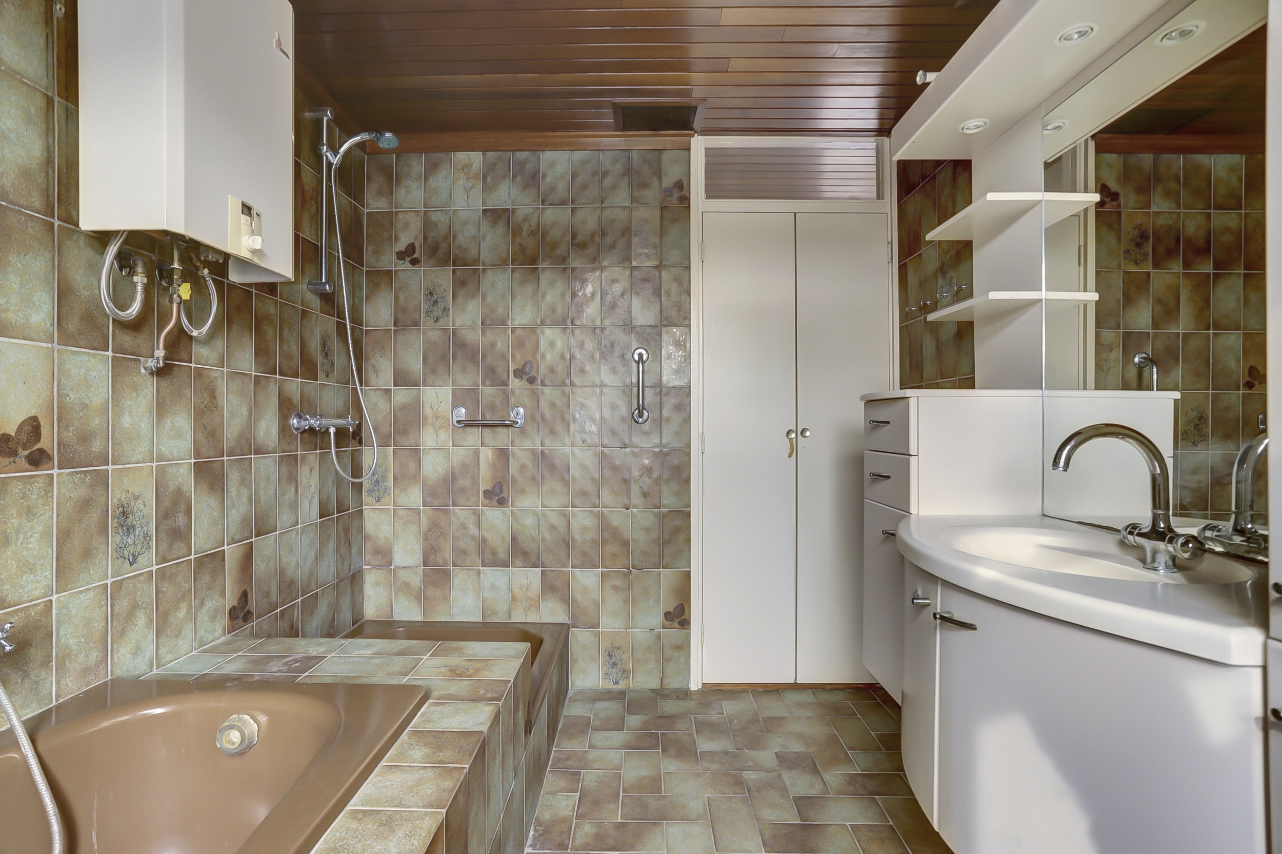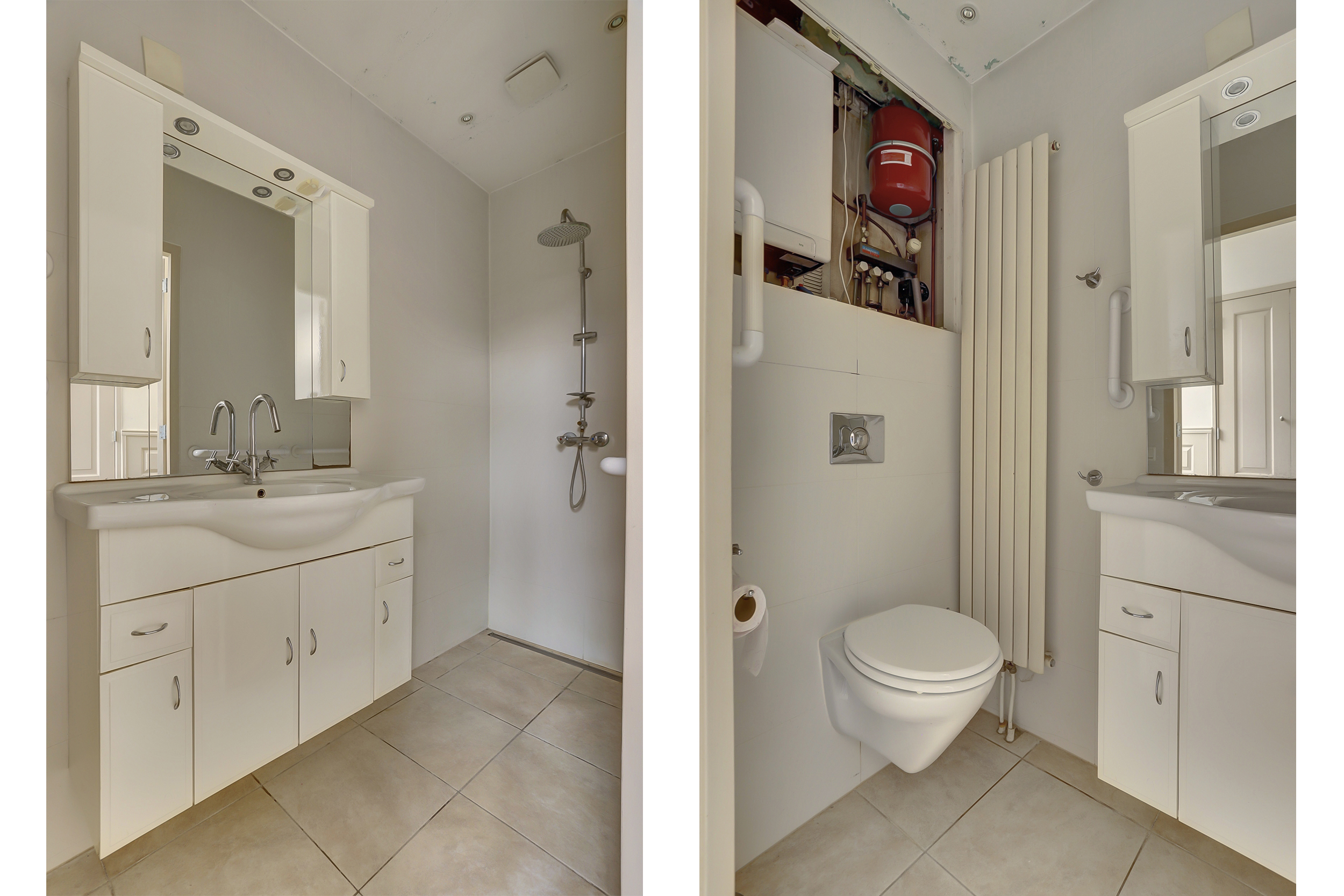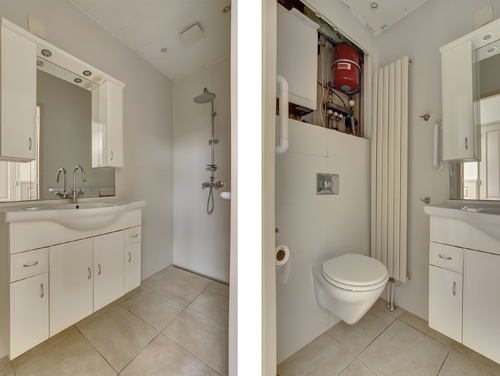 De licht betegelde badkamer (ca. 4 m²) is voorzien van een douche, wastafel met meubel, design radiator, 2e toilet met zwevend closet, mechanische ventilatie en de opstelling van de cv combiketel (Intergas/hre, bouwjaar 2023) die netjes is weggewerkt in een vaste kast.