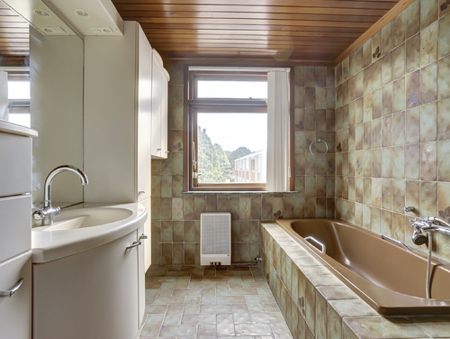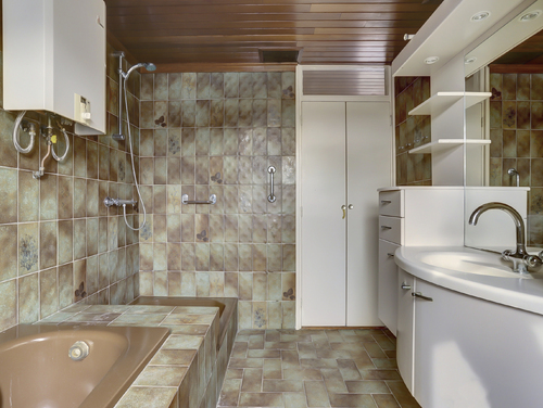De eenvoudige badkamer (ca. 7 m²) is voorzien van een ligbad, wastafel met meubel, douche, wasmachine aansluiting, "Fasto" badgeiser en een gaskachel.