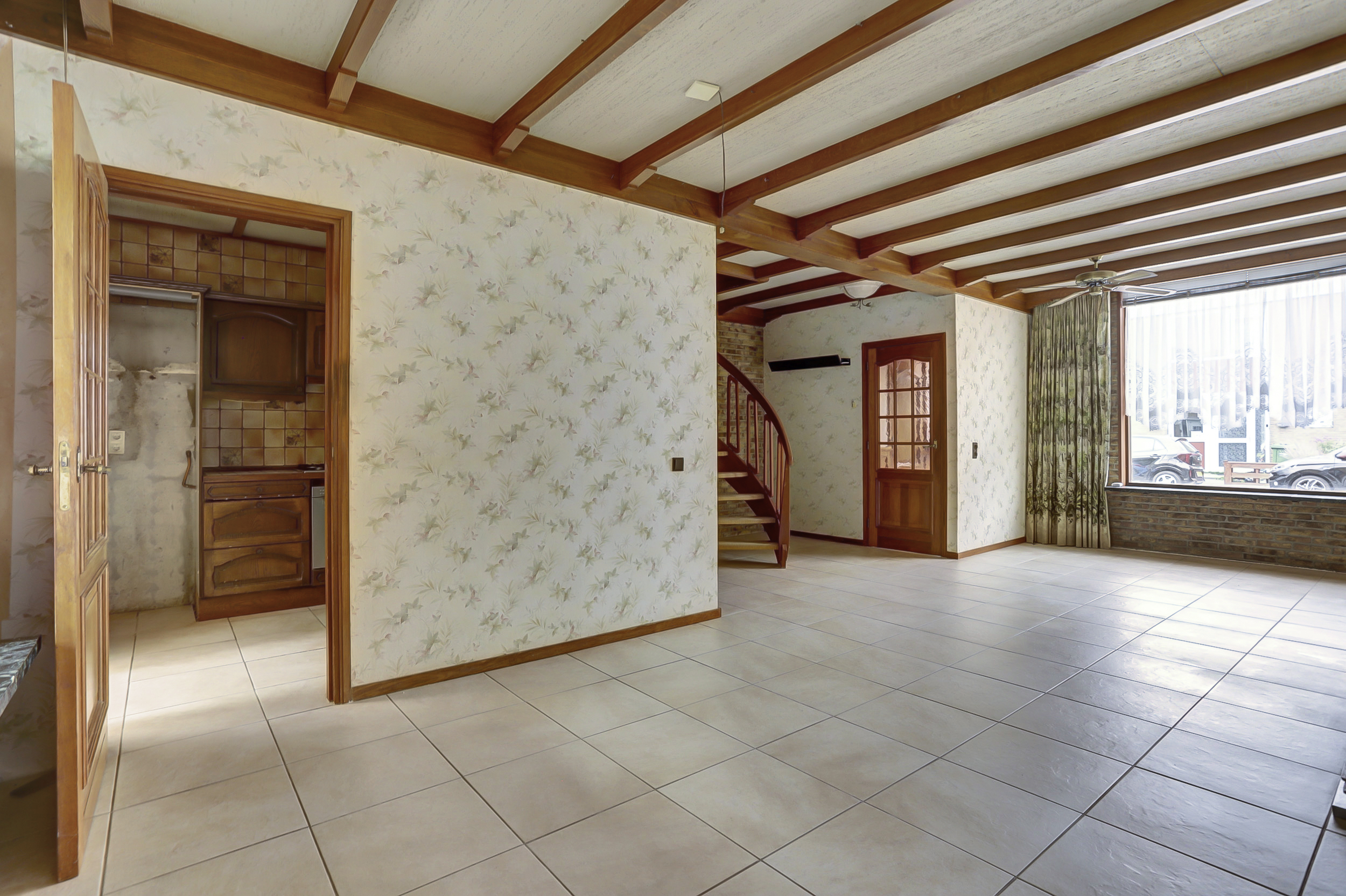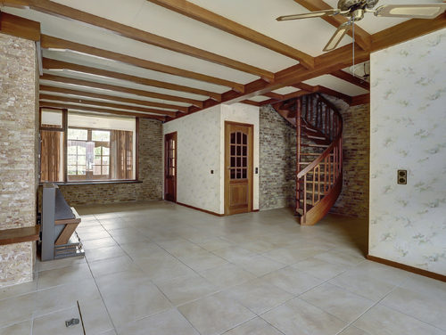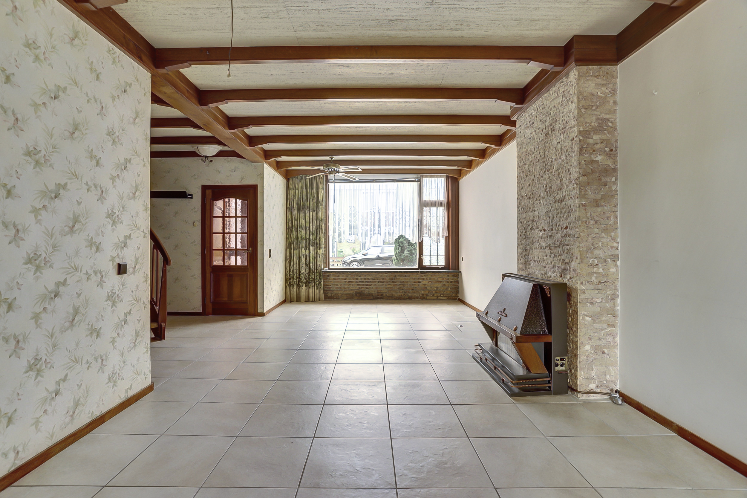 De woonkamer (ca. 34 m²) is voorzien van een lichte plavuizenvloer, sierbalken plafond, schouw met gashaard, een spiltrap naar de verdieping en heeft toegang tot de separate keuken en de aanbouw aan de achterzijde.