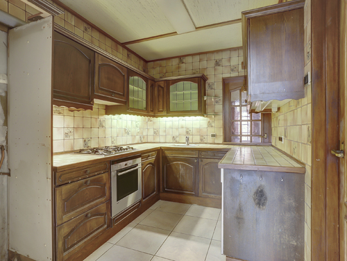 De keuken (ca. 7 m²) beschikt over een eenvoudige (eiken)inrichting, een plavuizenvloer en diverse inbouwapparatuur zoals een oven, 5-pits gaskookplaat, vlakscherm afzuigkap en een vaatwasser. Via de keuken bereik je de aanbouw (2009) met toegang tot de slaapkamer en aangrenzende badkamer.