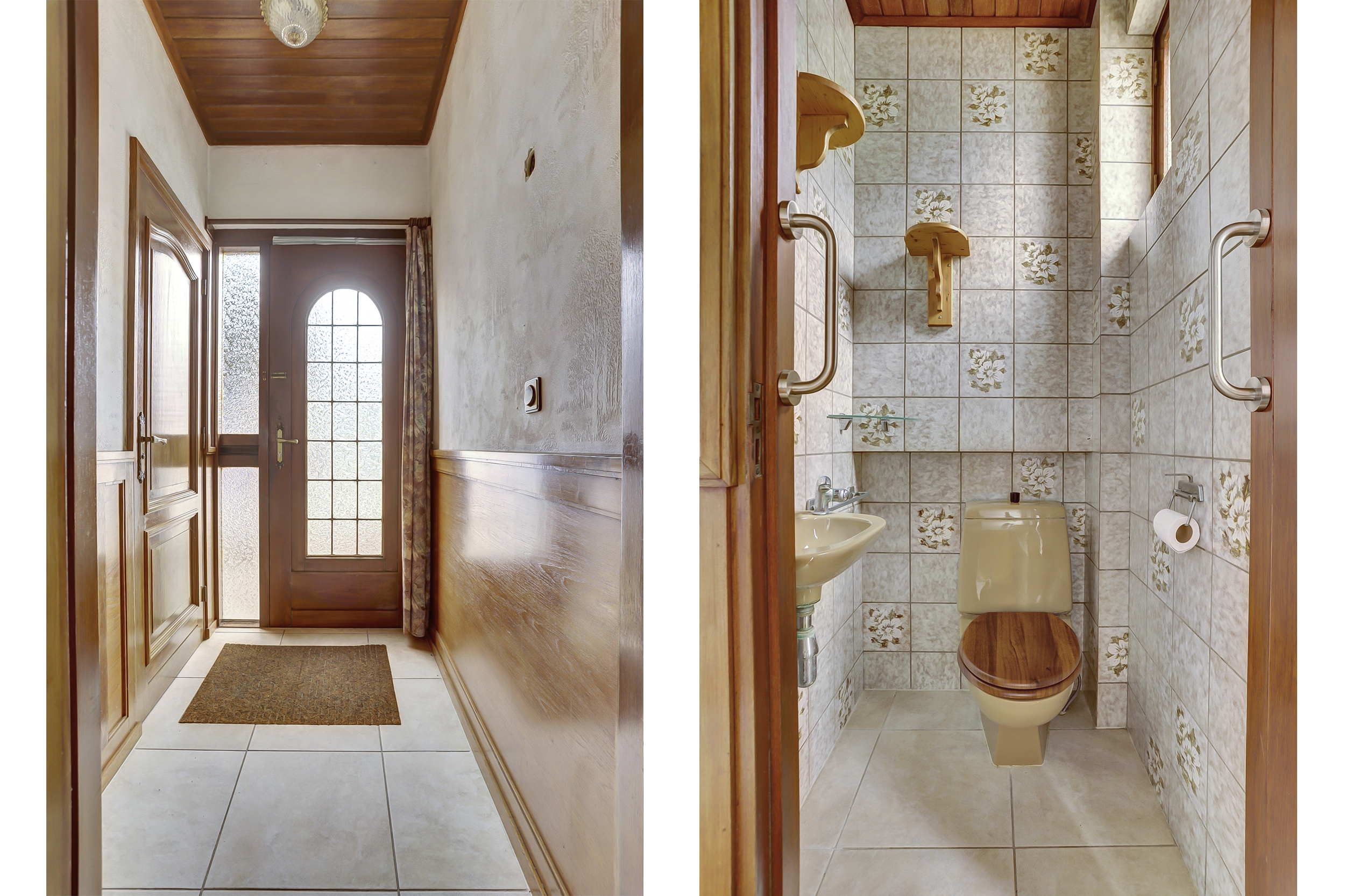Hal/entree met garderobenis, meterkast (6 groepen met aardlekschakelaar), plavuizenvloer, toilet met fonteintje en de toegang tot de doorzon woonkamer.