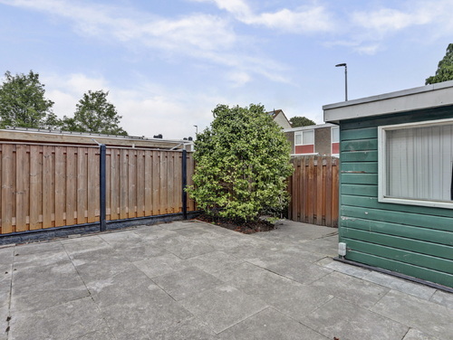De zonnige tuin is gesitueerd op oosten, is geheel betegeld en voorzien van een vrijstaande houten berging met elektra, een achterom en een buitenkraan.
