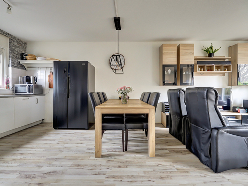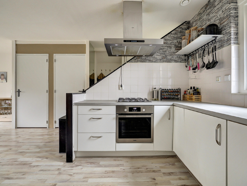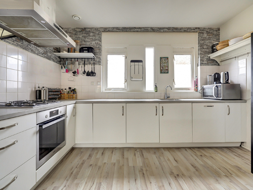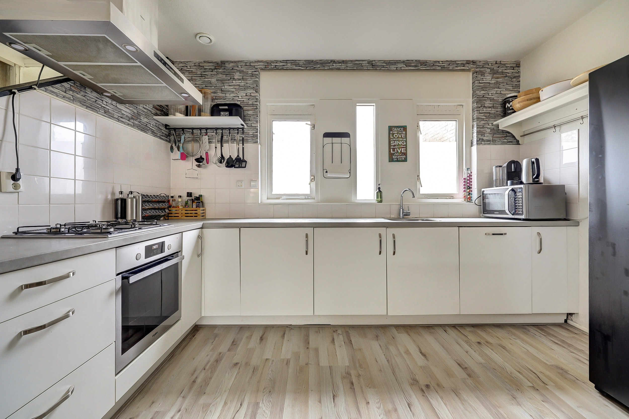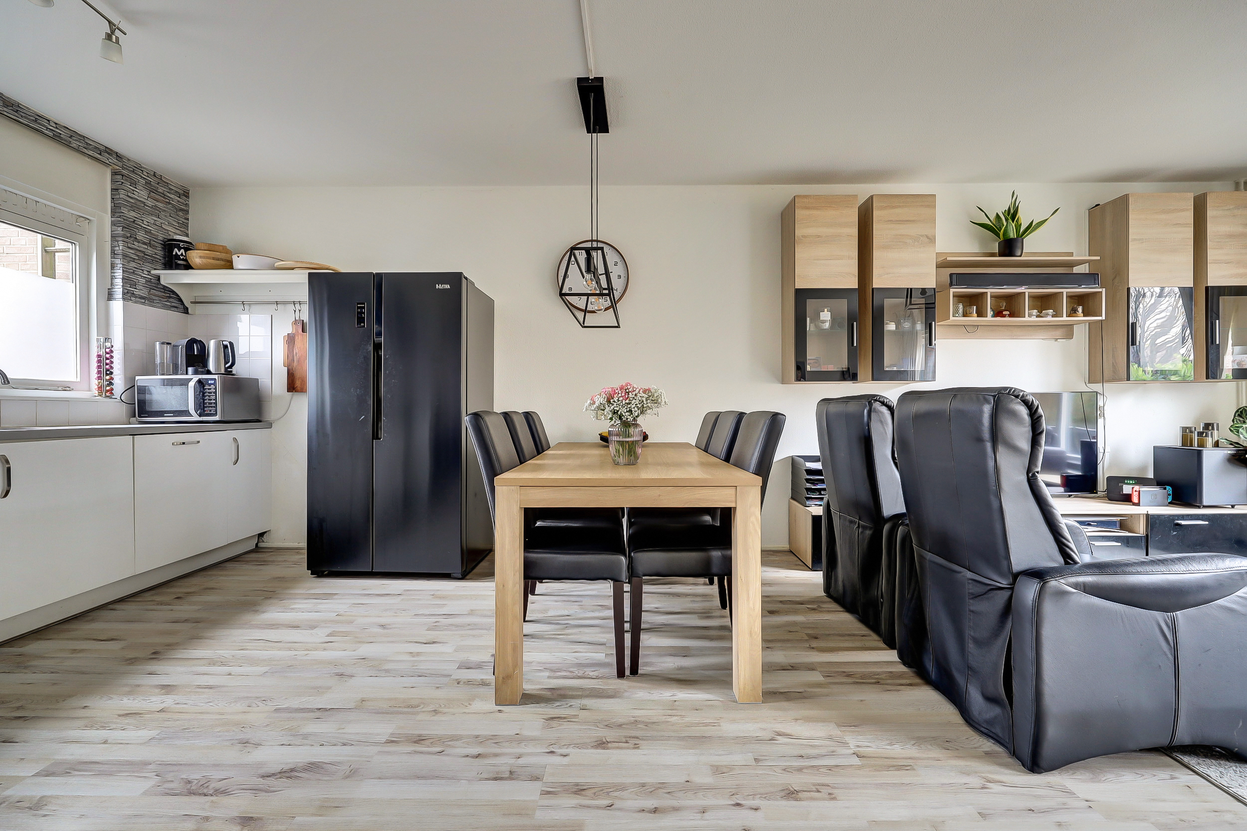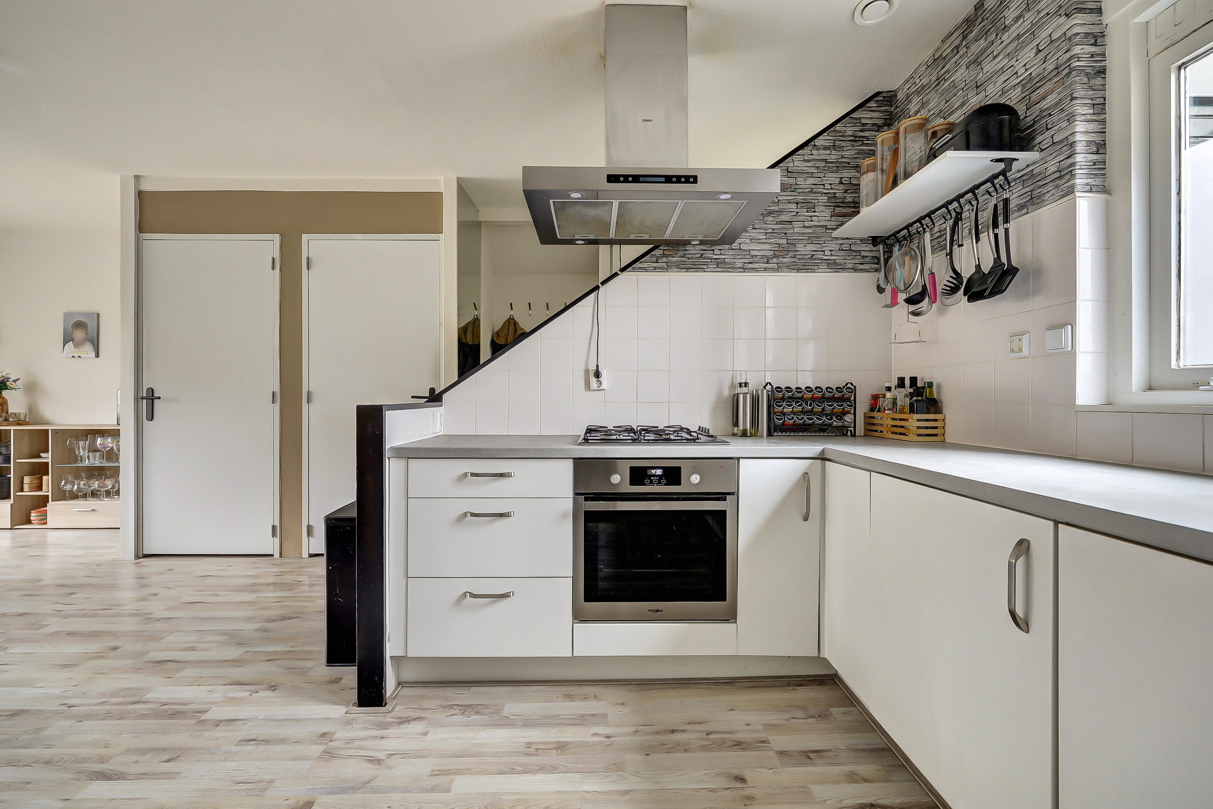De open keuken eveneens met laminaatvloer, is gesitueerd aan de voorzijde van de woning en uitgerust met een L-vormige inrichting (2018) en diverse apparatuur zoals een vaatwasser, heteluchtoven, 4-pits gaskookplaat en een rvs afzuigschouw.