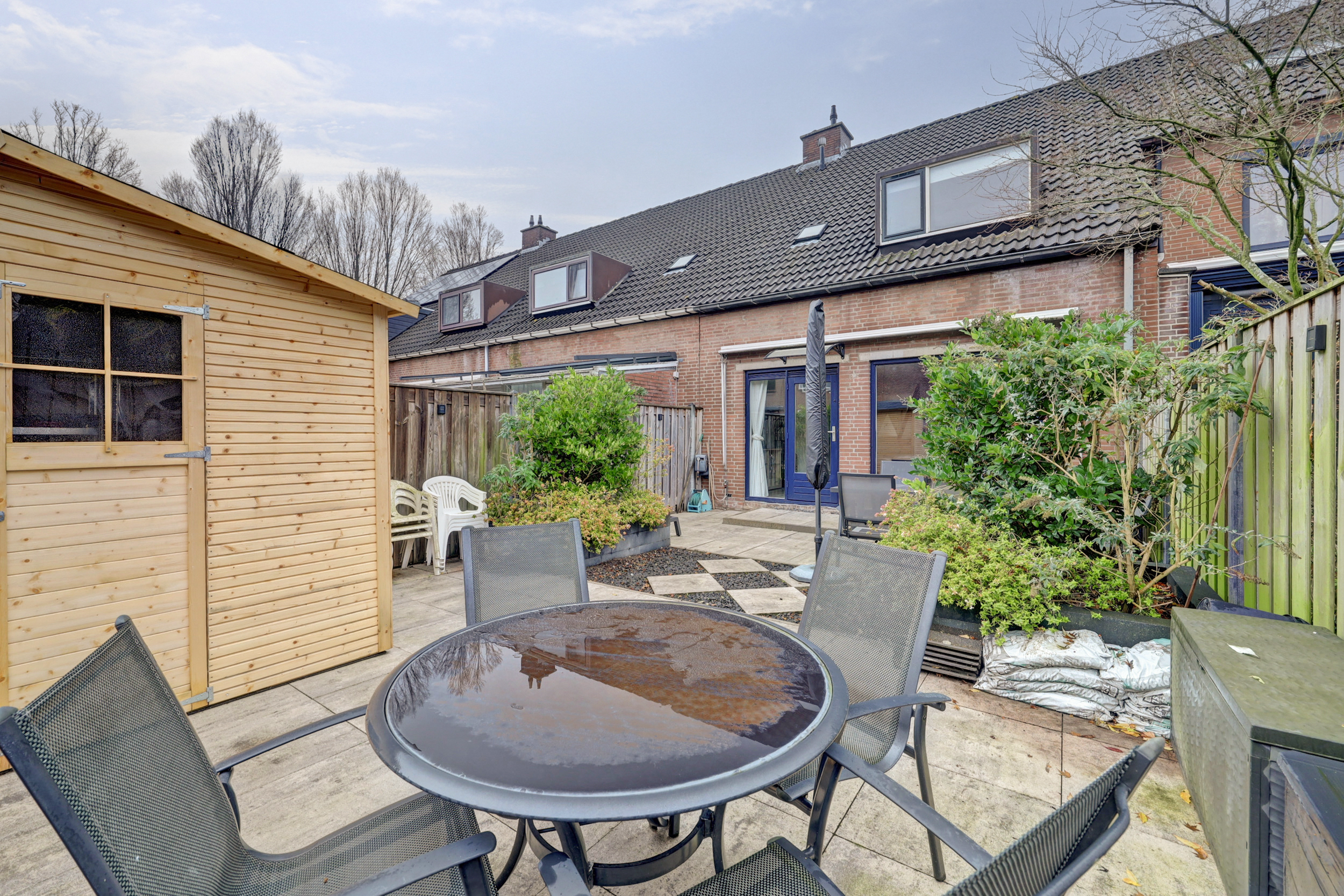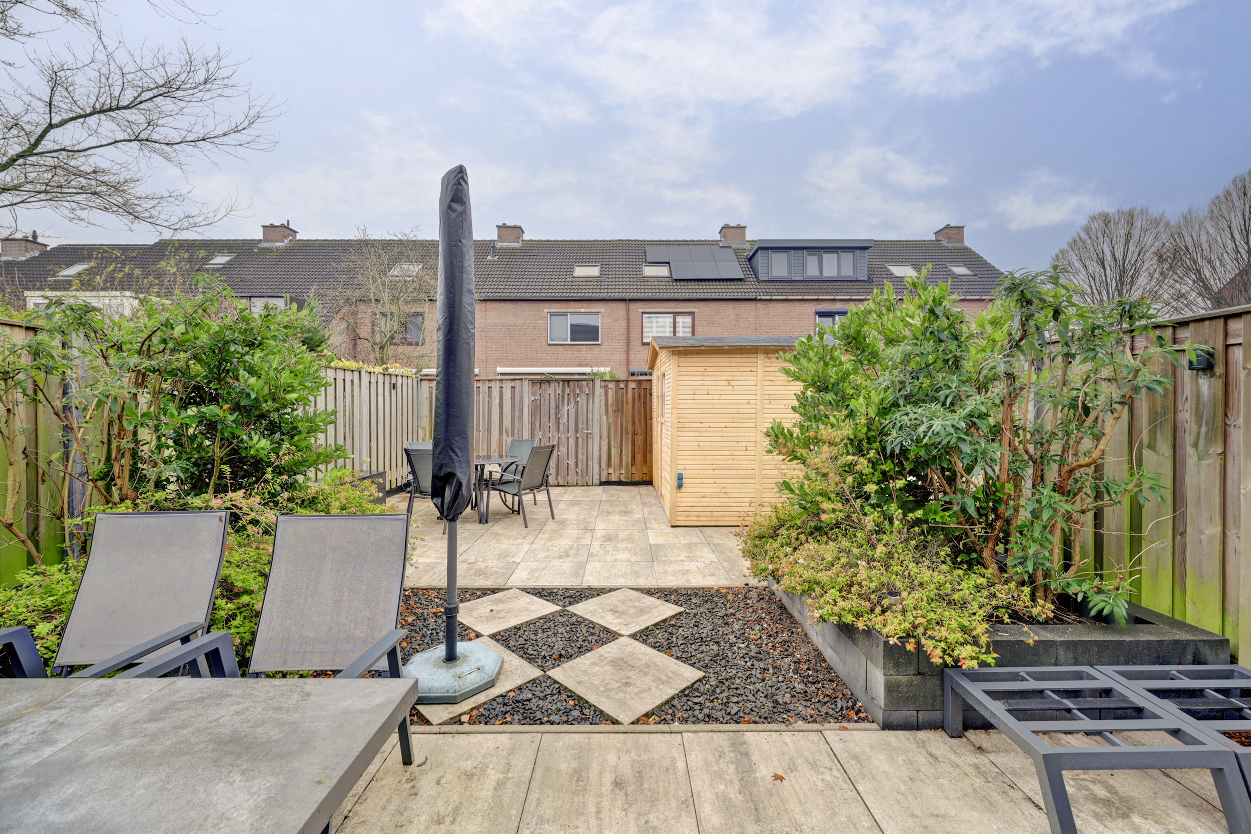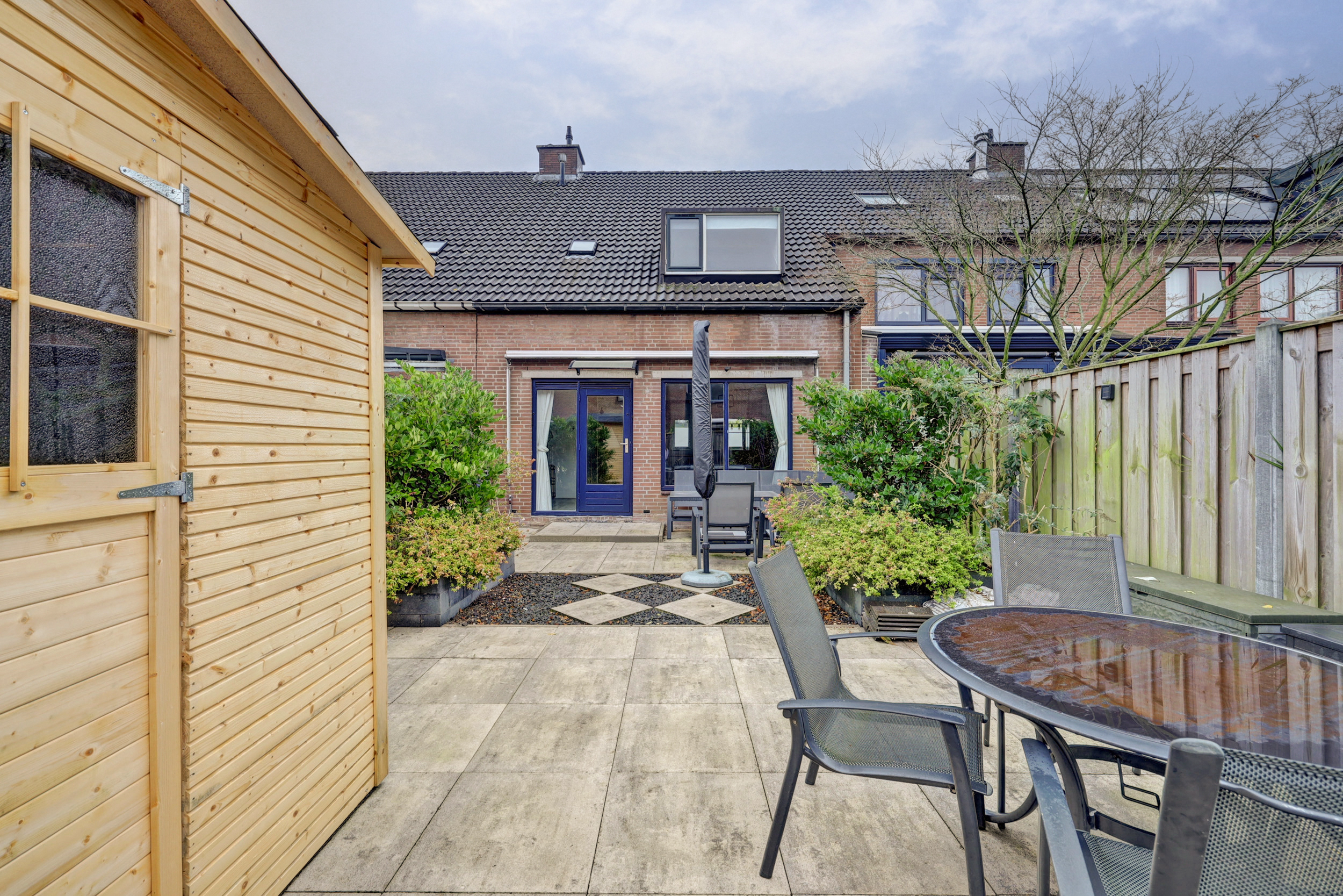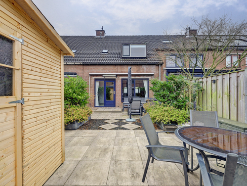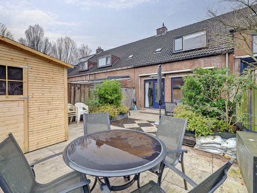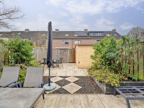 De op het zuidwesten gesitueerde achtertuin is 5 jaar geleden keurig aangelegd en uitgerust met borders, beplanting, een buitenkraan, elektra, een achterom, zonwering en een recent geplaatste vrijstaande houten berging. De voortuin is betegeld en kan worden gebruikt voor het parkeren van aan een auto op eigen terrein. Hier tref je ook de aangebouwde stenen berging met aparte loopdeur en elektra.