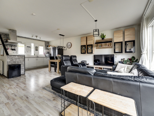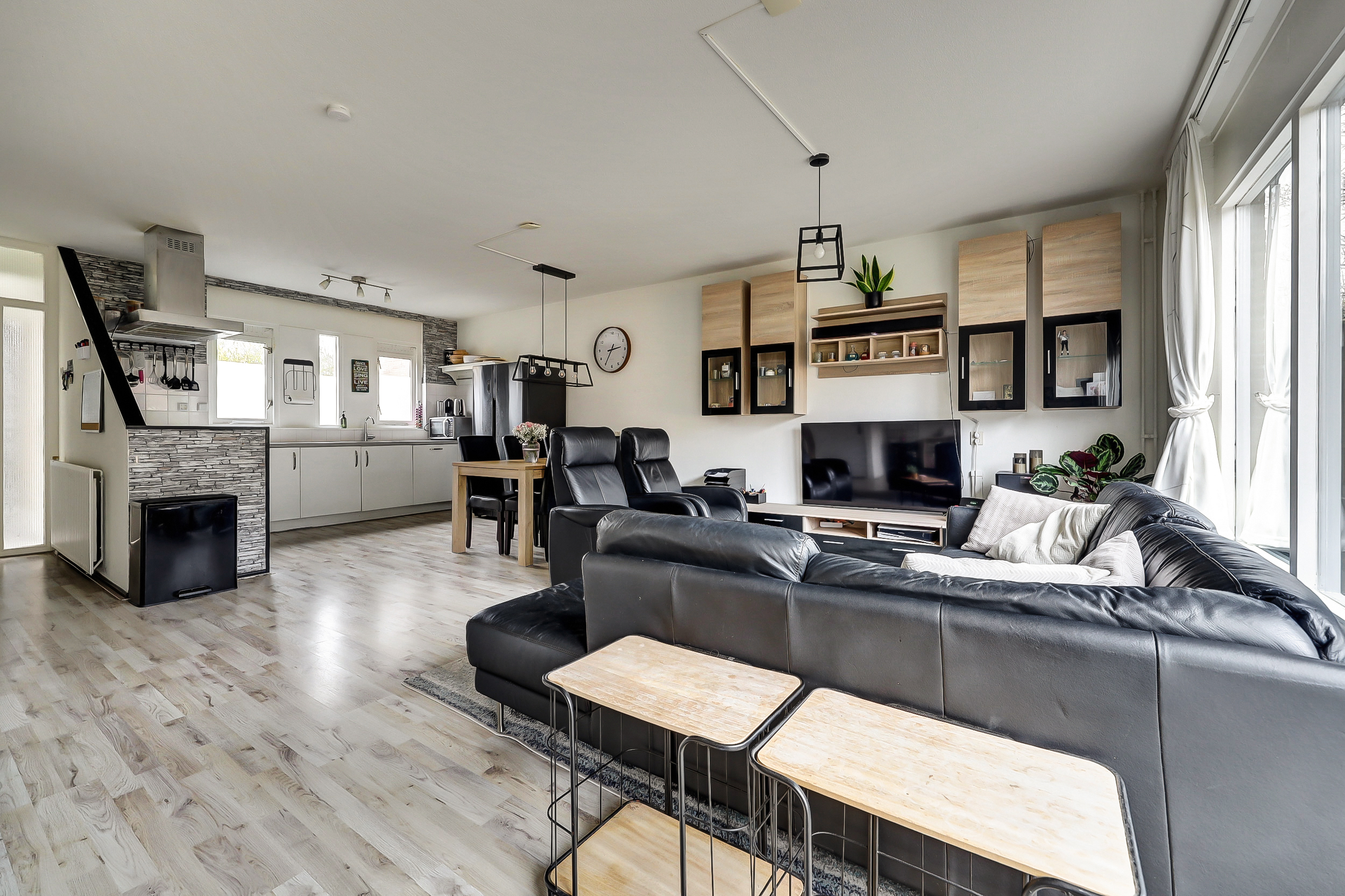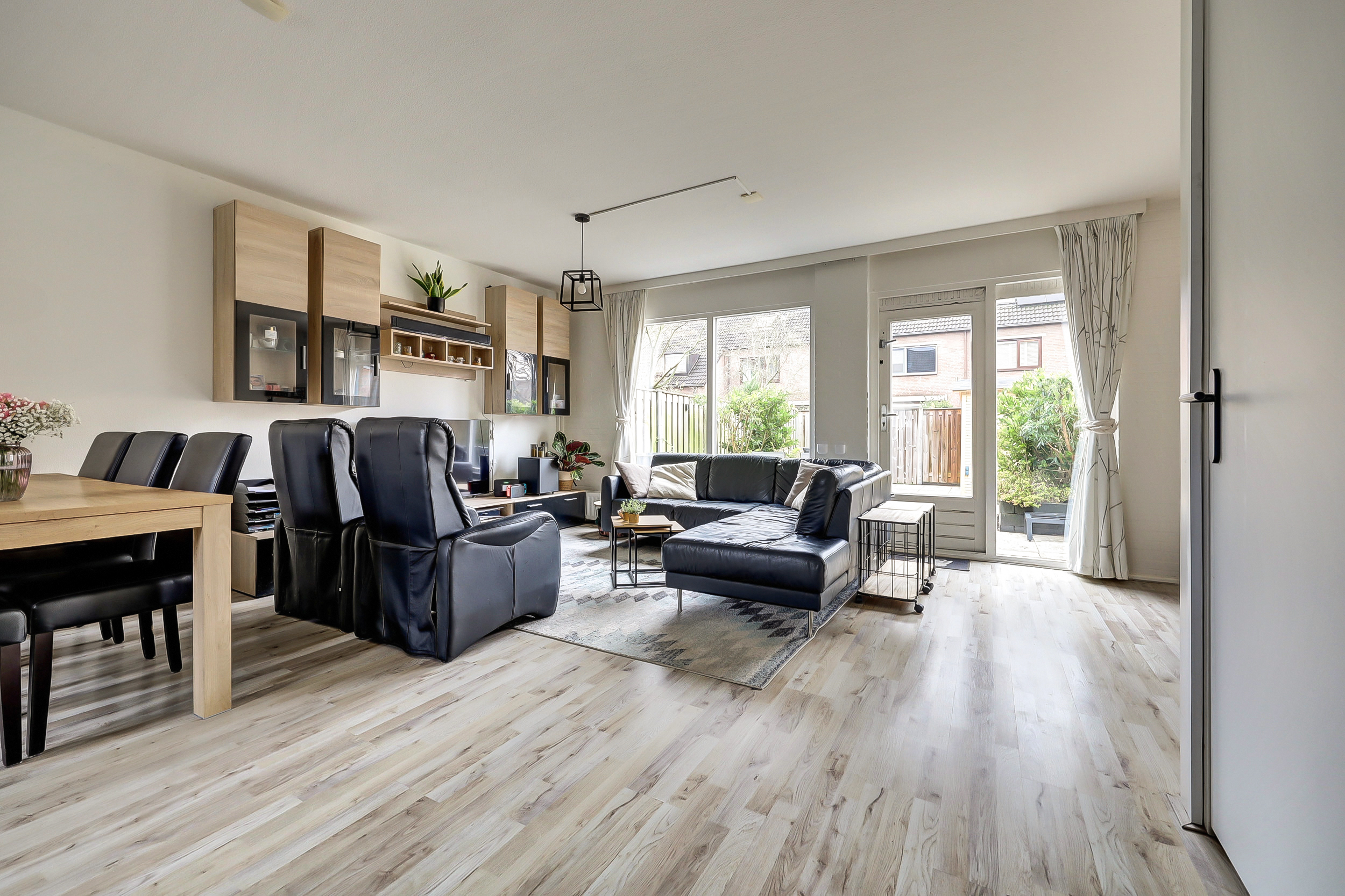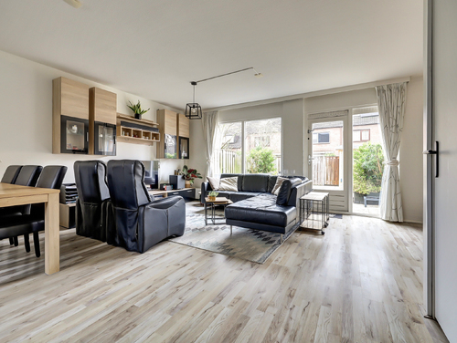De lichte en sfeervolle woonkamer (ca. 40 m²) biedt door de grote ramen een fraai zicht op de aangrenzende tuin. De woonkamer is voorzien van een laminaatvloer, een handige voorraadkast en een schuifkast waarin netjes de garderobe is weggewerkt.