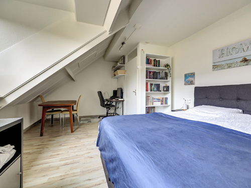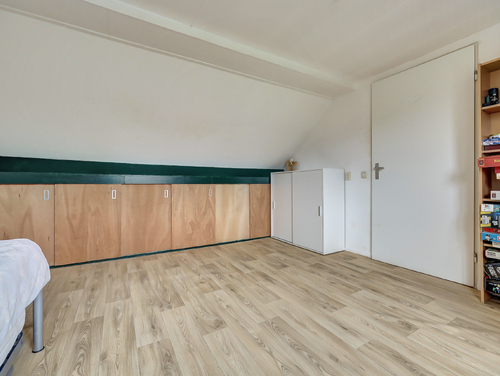 Deze royale kamer (ca. 15 m²) met diverse opbergmogelijkheden achter de knieschotten heeft tevens ingebouwde verlichting.