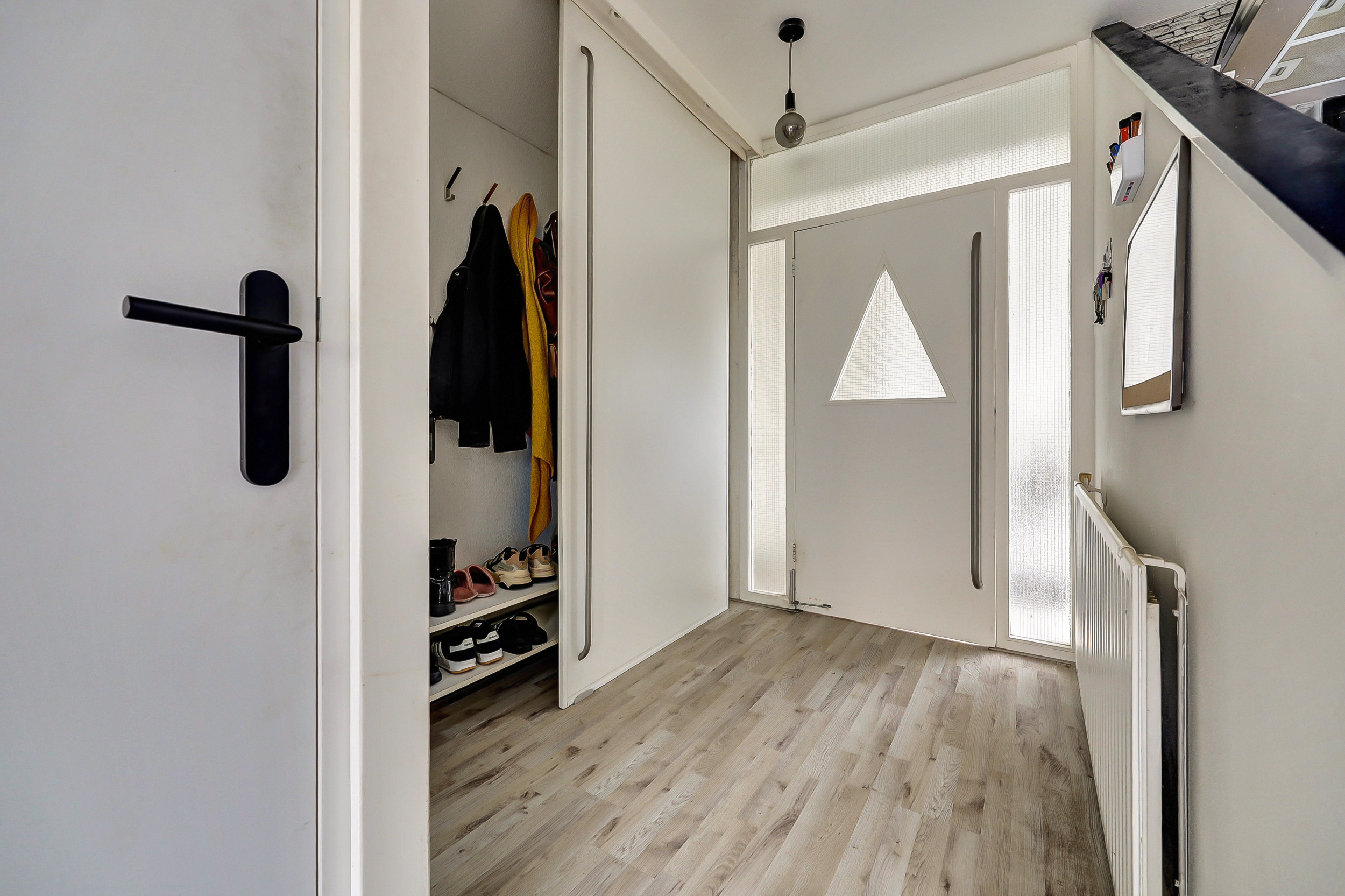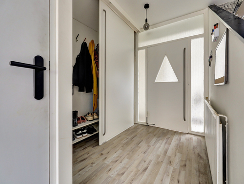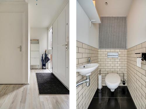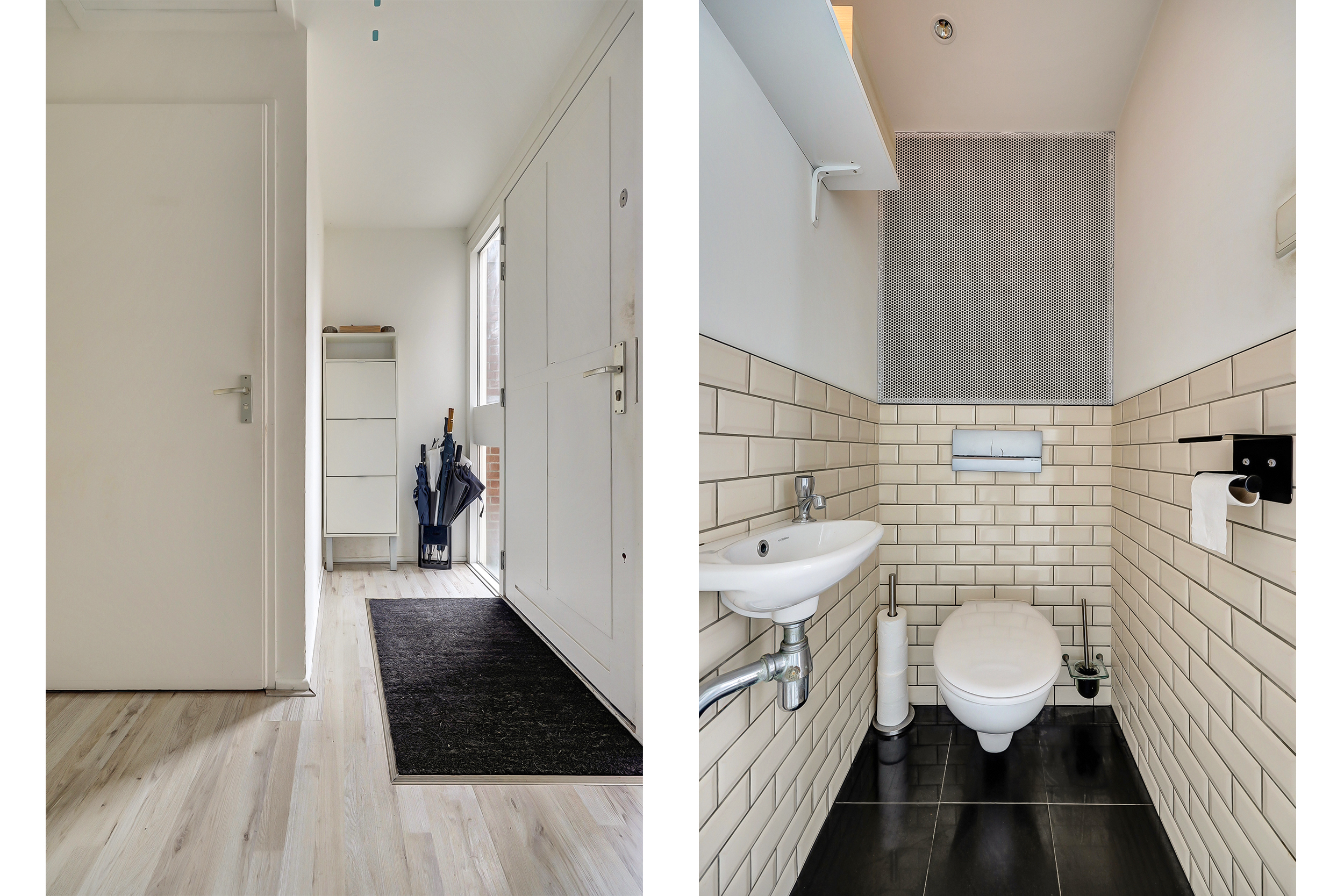 Hal/entree met laminaatvloer, toilet met zwevend closet en fonteintje, meterkast (glasvezel aanwezig) en de toegang tot een kleine bergzolder en de tuingerichte woonkamer.
